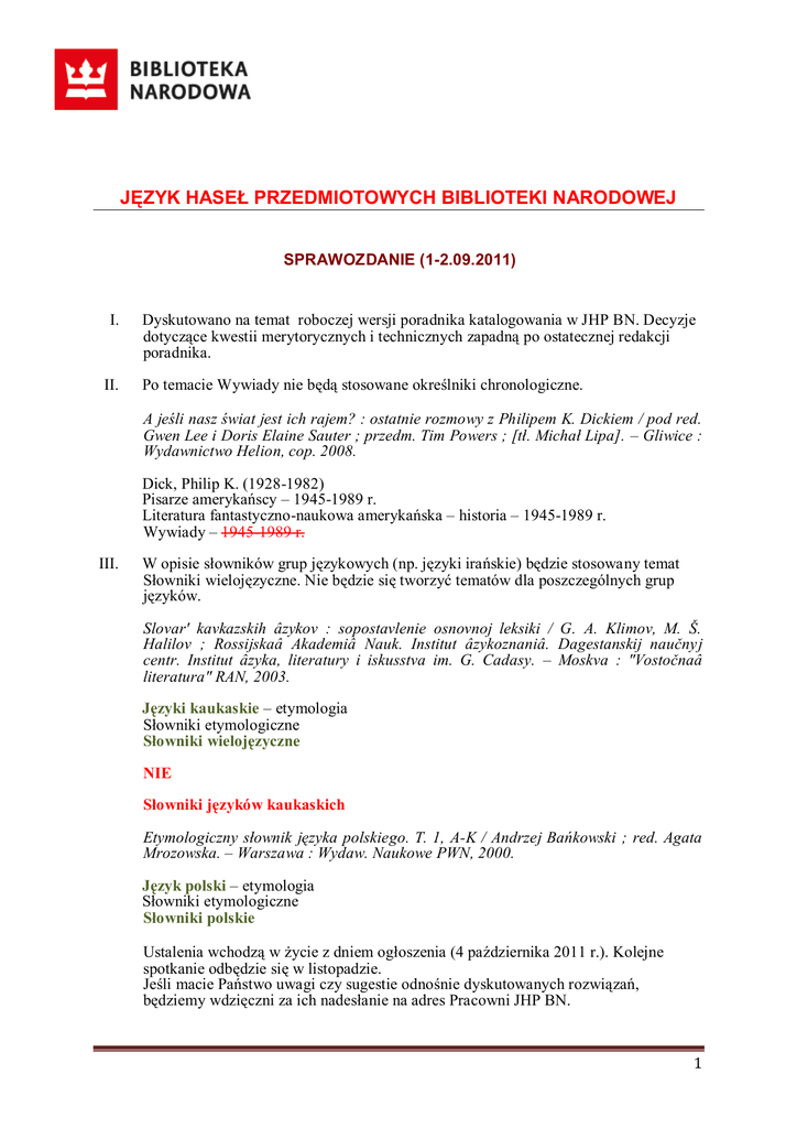 JĘZYK HASEŁ PRZEDMIOTOWYCH BIBLIOTEKI NARODOWEJ SPRAWOZDANIE (1-2.09.2011) I. II. Dyskutowano na temat roboczej wersji poradnika katalogowania w JHP BN. Decyzje dotyczące kwestii merytorycznych i technicznych zapadną po ostatecznej redakcji poradnika. Po temacie Wywiady nie będą stosowane określniki chronologiczne. A jeśli nasz świat jest ich rajem? : ostatnie rozmowy z Philipem K. Dickiem / pod red. Gwen Lee i Doris Elaine Sauter ; przedm. Tim Powers ; [tł. Michał Lipa]. – Gliwice : Wydawnictwo Helion, cop. 2008. Dick, Philip K. (1928-1982) Pisarze amerykańscy – 1945-1989 r. Literatura fantastyczno-naukowa amerykańska – historia – 1945-1989 r. Wywiady – 1945-1989 r. III. W opisie słowników grup językowych (np. języki irańskie) będzie stosowany temat Słowniki wielojęzyczne. Nie będzie się tworzyć tematów dla poszczególnych grup języków. Slovar' kavkazskih âzykov : sopostavlenie osnovnoj leksiki / G. A. Klimov, M. Š. Halilov ; Rossijskaâ Akademiâ Nauk. Institut âzykoznaniâ. Dagestanskij naučnyj centr. Institut âzyka, literatury i iskusstva im. G. Cadasy. – Moskva : "Vostočnaâ literatura" RAN, 2003. Języki kaukaskie – etymologia Słowniki etymologiczne Słowniki wielojęzyczne NIE Słowniki języków kaukaskich Etymologiczny słownik języka polskiego. T. 1, A-K / Andrzej Bańkowski ; red. Agata Mrozowska. – Warszawa : Wydaw. Naukowe PWN, 2000. Język polski – etymologia Słowniki etymologiczne Słowniki polskie Ustalenia wchodzą w życie z dniem ogłoszenia (4 października 2011 r.). Kolejne spotkanie odbędzie się w listopadzie. Jeśli macie Państwo uwagi czy sugestie odnośnie dyskutowanych rozwiązań, będziemy wdzięczni za ich nadesłanie na adres Pracowni JHP BN. 1