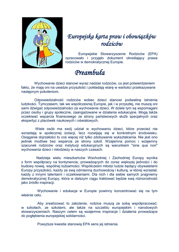 Europejska karta praw i obowiązków rodziców Europejskie Stowarzyszenie Rodziców (EPA) opracowało i przyjęło dokument określający prawa rodziców w demokratycznej Europie. Preambuła Wychowanie dzieci stanowi wyraz nadziei rodziców, co jest potwierdzeniem faktu, że mają oni na uwadze przyszłość i pokładają wiarę w wartości przekazywane następnym pokoleniom. Odpowiedzialność rodziców wobec dzieci stanowi podwalinę istnienia ludzkości. Tymczasem, tak we współczesnej Europie, jak i w przyszłej, nie muszą oni sami dźwigać odpowiedzialności za wychowanie dzieci. W dziele tym są wspomagani przez osoby i grupy społeczne, zaangażowane w działania edukacyjne. Mogą także oczekiwać wsparcia finansowego ze strony państwowych służb specjalnych oraz ekspertyz z placówek naukowych i oświatowych. Wiele osób ma swój udział w wychowaniu dzieci, które przecież nie wzrastają w społecznej izolacji, lecz rozwijają się w konkretnym środowisku. Osiąganie dojrzałości to coś więcej niż tylko zdobywanie wykształcenia. Nie jest ono jednak możliwe bez wsparcia ze strony szkół. Wzajemna pomoc i wzajemny szacunek rodziców oraz instytucji edukacyjnych są warunkiem "sine qua non" wychowania dzieci i młodzieży w naszych czasach. Nadzieja wielu mieszkańców Wschodniej i Zachodniej Europy wynika z form współpracy na kontynencie, prowadzących do coraz większej jedności i do budowy nowej, wspólnej tożsamości. Współcześni młodzi ludzie będący obywatelami Europy przyszłości, każdy ze swą odmienną duchowością i kulturą, w której wzrastał, każdy z innymi talentami i oczekiwaniami. Dla nich i dla siebie samych pragniemy demokratycznej Europy, która w dalszym ciągu traktować będzie swą różnorodność jako źródło inspiracji. Wychowanie i edukacja w Europie powinny koncentrować się na tym właśnie celu. Aby zrealizować to założenie, rodzice muszą ze sobą współpracować: w szkołach, ze szkołami, ale także na szczeblu europejskim i narodowych stowarzyszeniach. Naszym celem są wzajemne inspiracje i działania prowadzące do pogłębienia europejskiej solidarności. Powyższe kwestie stanowią EPA sens jej istnienia. Na tym jednak nie koniec. Rodzice w Europie mają prawo być otaczani szacunkiem za ich odpowiedzialność jako pierwszych i najważniejszych wychowawców młodzieży. Oznacza to poszanowanie ich rodzicielskiej roli i wynikających z niej obowiązków. W swych wysiłkach wychowawczych powinni być wspierani przez całe społeczeństwo, a w szczególności przez osoby zaangażowane w edukację. EPA zawarło swoje postulaty w deklaracji "Prawa i obowiązki rodziców w Europie". Zwracamy się do Komisji Europejskiej, Rady Ministrów, Parlamentu Europejskiego i Rady Europy z prośbą o poparcie naszych postulatów i pomoc w ich realizacji. Prawa i obowiązki rodziców w Europie 1. Rodzice mają prawo do wychowywania swoich dzieci w duchu tolerancji i zrozumienia dla innych, bez dyskryminacji wynikającej z koloru skóry, rasy, narodowości, wyznania, płci oraz pozycji ekonomicznej. Rodzice mają obowiązek wychowywać swoje dzieci w duchu odpowiedzialności za siebie i za cały ludzki świat. 2. Rodzice mają prawo do uznania ich prymatu jako "pierwszych nauczycieli" swoich dzieci. 3. Rodzice mają obowiązek wychowywać swoje dzieci w sposób odpowiedzialny i nie zaniedbywać ich. 4. Rodzice mają prawo do pełnego dostępu do formalnego systemu edukacji dla swoich dzieci z uwzględnieniem ich potrzeb, możliwości i osiągnięć. Rodzice mają obowiązek zaangażowania się jako partnerzy w nauczaniu ich dzieci w szkole. 5. Rodzice mają prawo dostępu do wszelkich informacji o instytucjach oświatowych, które mogą dotyczyć ich dzieci. 6. Rodzice mają obowiązek przekazywania wszelkich informacji szkołom, do których uczęszczają ich dzieci, informacji dotyczących możliwości osiągnięcia wspólnych,( tj. domu i szkoły) celów edukacyjnych. 7. Rodzice mają prawo wyboru takiej drogi edukacji dla swoich dzieci, która jest najbliższa ich przekonaniom i wartościom uznawanym za najważniejsze dla rozwoju ich dzieci. 8. Rodzice mają obowiązek dokonania świadomego wyboru drogi edukacyjnej, jaką ich dzieci powinny zmierzać. 9. Rodzice mają prawo domagania się od formalnego systemu edukacji tego, aby ich dzieci osiągnęły wiedzę duchową i kulturową. 10. Rodzice mają obowiązek wychowywać swoje dzieci w poszanowaniu i akceptowaniu innych ludzi i ich przekonań. 11. Rodzice mają prawo wpływać na politykę oświatową realizowaną w szkołach ich dzieci. Rodzice mają obowiązek osobiście włączać się w życie szkół ich dzieci i stanowić istotną część społeczności lokalnej. 12. Rodzice i ich stowarzyszenia mają prawo wydawania opinii i przeprowadzania konsultacji z władzami odpowiedzialnymi za edukację na wszystkich poziomach ich struktur. 13. Rodzice mają obowiązek tworzyć demokratyczne, reprezentatywne organizacje na wszystkich poziomach. Organizacje te będą reprezentowały rodziców i ich interesy. 14. Rodzice mają prawo do pomocy materialnej ze strony władz publicznych, eliminującej wszelkie bariery finansowe, które mogłyby utrudnić dostęp ich dzieci do edukacji. 15. Rodzice mają obowiązek poświęcać swój czas i uwagę swoim dzieciom i ich szkołom, tak aby wzmocnić ich wysiłki skierowane na osiągnięcie określonych celów nauczania. 16. Rodzice mają prawo żądać od odpowiedzialnych władz publicznych wysokiej jakości usługi edukacyjnej. 17. Rodzice mają obowiązek poznać siebie nawzajem, współpracować ze sobą i doskonalić swoje umiejętności "pierwszych nauczycieli" i partnerów w kontakcie: szkoła - dom.