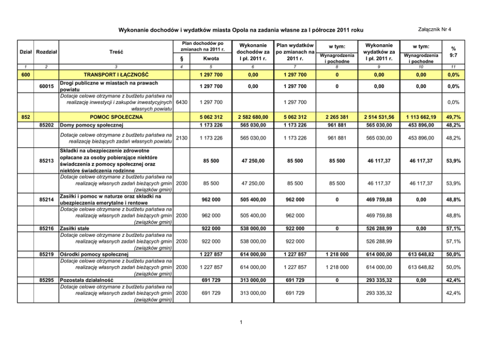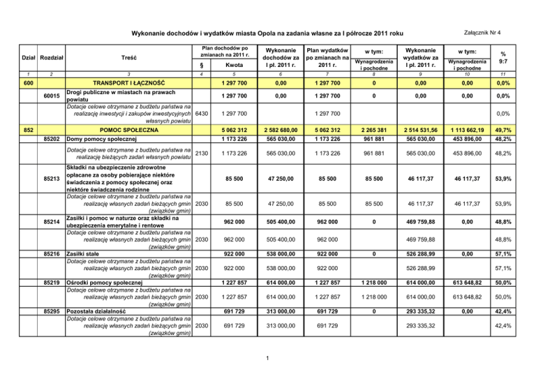 Załącznik Nr 4 Wykonanie dochodów i wydatków miasta Opola na zadania własne za I półrocze 2011 roku Dział Rozdział 1 2 600 Treść 3 Plan dochodów po zmianach na 2011 r. § Kwota Wykonanie dochodów za I pł. 2011 r. 4 5 6 7 8 9 10 11 1 297 700 0,00 1 297 700 0 0,00 0,00 0,0% 1 297 700 0,00 1 297 700 0 0,00 0,00 0,0% TRANSPORT I ŁĄCZNOŚĆ 60015 852 Drogi publiczne w miastach na prawach powiatu Dotacje celowe otrzymane z budŜetu państwa na realizację inwestycji i zakupów inwestycyjnych 6430 własnych powiatu POMOC SPOŁECZNA 85202 85213 85214 85216 85219 85295 1 297 700 Plan wydatków po zmianach na 2011 r. w tym: Wynagrodzenia i pochodne Wykonanie wydatków za I pł. 2011 r. w tym: Wynagrodzenia i pochodne 1 297 700 % 9:7 0,0% 5 062 312 2 582 680,00 5 062 312 2 265 381 2 514 531,56 1 113 662,19 49,7% Domy pomocy społecznej 1 173 226 565 030,00 1 173 226 961 881 565 030,00 453 896,00 48,2% Dotacje celowe otrzymane z budŜetu państwa na 2130 realizację bieŜących zadań własnych powiatu 1 173 226 565 030,00 1 173 226 961 881 565 030,00 453 896,00 48,2% 85 500 47 250,00 85 500 85 500 46 117,37 46 117,37 53,9% 85 500 47 250,00 85 500 85 500 46 117,37 46 117,37 53,9% 962 000 505 400,00 962 000 0 469 759,88 0,00 48,8% 962 000 505 400,00 962 000 922 000 538 000,00 922 000 922 000 538 000,00 922 000 1 227 857 614 000,00 1 227 857 1 218 000 614 000,00 613 648,82 50,0% 1 227 857 614 000,00 1 227 857 1 218 000 614 000,00 613 648,82 50,0% 691 729 313 000,00 691 729 0 293 335,32 0,00 42,4% 691 729 313 000,00 691 729 Składki na ubezpieczenie zdrowotne opłacane za osoby pobierające niektóre świadczenia z pomocy społecznej oraz niektóre świadczenia rodzinne Dotacje celowe otrzymane z budŜetu państwa na realizację własnych zadań bieŜących gmin (związków gmin) Zasiłki i pomoc w naturze oraz składki na ubezpieczenia emerytalne i rentowe Dotacje celowe otrzymane z budŜetu państwa na realizację własnych zadań bieŜących gmin (związków gmin) Zasiłki stałe Dotacje celowe otrzymane z budŜetu państwa na realizację własnych zadań bieŜących gmin (związków gmin) Ośrodki pomocy społecznej Dotacje celowe otrzymane z budŜetu państwa na realizację własnych zadań bieŜących gmin (związków gmin) Pozostała działalność Dotacje celowe otrzymane z budŜetu państwa na realizację własnych zadań bieŜących gmin (związków gmin) 2030 2030 2030 2030 2030 1 469 759,88 0 526 288,99 48,8% 0,00 526 288,99 293 335,32 57,1% 57,1% 42,4% Załącznik Nr 4 Wykonanie dochodów i wydatków miasta Opola na zadania własne za I półrocze 2011 roku Dział Rozdział 1 854 2 Treść 3 Plan dochodów po zmianach na 2011 r. § Kwota Wykonanie dochodów za I pł. 2011 r. 4 5 6 7 8 9 10 11 194 279 194 279,00 194 279 0 194 279,00 0,00 100,0% 194 279 194 279,00 194 279 0 194 279,00 0,00 100,0% 194 279 194 279,00 194 279 6 554 291 2 776 959,00 6 554 291 EDUKACYJNA OPIEKA WYCHOWAWCZA Pomoc materialna dla uczniów Dotacje celowe otrzymane z budŜetu państwa na realizację własnych zadań bieŜących gmin 2030 (związków gmin) OGÓŁEM 2 Plan wydatków po zmianach na 2011 r. w tym: Wynagrodzenia i pochodne Wykonanie wydatków za I pł. 2011 r. w tym: Wynagrodzenia i pochodne 194 279,00 2 265 381 2 708 810,56 % 9:7 100,0% 1 113 662,19 41,3%