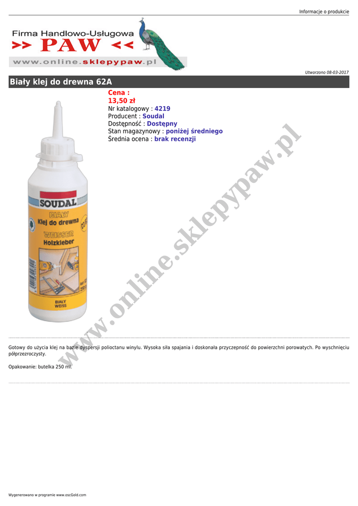 Informacje o produkcie Utworzono 08-03-2017 Biały klej do drewna 62A w w w .o nl in e. sk le py pa w Nr katalogowy : 4219 Producent : Soudal Dostępność : Dostępny Stan magazynowy : poniżej średniego Średnia ocena : brak recenzji .p l Cena : 13,50 zł Gotowy do użycia klej na bazie dyspersji polioctanu winylu. Wysoka siła spajania i doskonała przyczepność do powierzchni porowatych. Po wyschnięciu półprzezroczysty. Opakowanie: butelka 250 ml. Wygenerowano w programie www.oscGold.com
