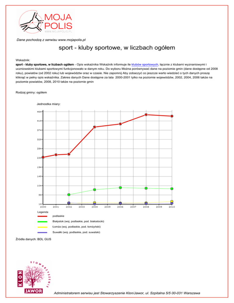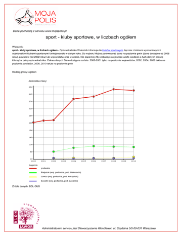 Dane pochodzą z serwisu www.mojapolis.pl sport - kluby sportowe, w liczbach ogółem Wskaźnik: sport - kluby sportowe, w liczbach ogółem - Opis wskaźnika Wskaźnik informuje ile klubów sportowych, łącznie z klubami wyznaniowymi i uczniowskimi klubami sportowymi funkcjonowało w danym roku. Do wyboru Można porównywać dane na poziomie gmin (dane dostępne od 2008 roku), powiatów (od 2002 roku) lub województw oraz w czasie. Nie zapomnij Aby zobaczyć co jeszcze warto wiedzieć o tych danych proszę kliknąć w pełny opis wskaźnika. Zakres danych Dane dostępne za lata 2000-2001 tylko na poziomie województw, 2002, 2004, 2006 także na poziomie powiatów, 2008, 2010 także na poziomie gmin Rodzaj gminy: ogółem Jednostka miary: Legenda podlaskie Białystok (woj. podlaskie, pod. białostocki) Łomża (woj. podlaskie, pod. łomżyński) Suwałki (woj. podlaskie, pod. suwalski) Źródła danych: BDL GUS Administratorem serwisu jest Stowarzyszenie Klon/Jawor, ul. Szpitalna 5/5 00-031 Warszawa