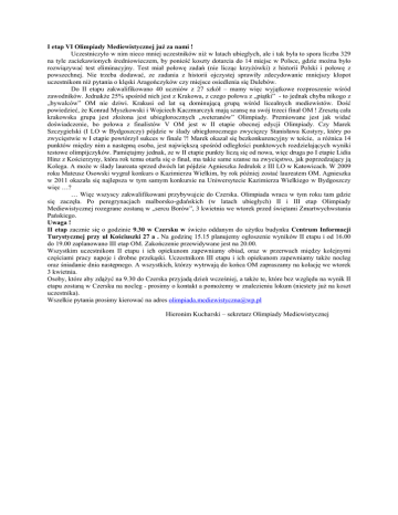 I etap VI Olimpiady Mediewistycznej juŜ za nami ! Uczestniczyło w nim nieco mniej uczestników niŜ w latach ubiegłych, ale i tak była to spora liczba 329 na tyle zaciekawionych średniowieczem, by ponieść koszty dotarcia do 14 miejsc w Polsce, gdzie moŜna było rozwiązywać test eliminacyjny. Test miał połowę zadań (nie licząc krzyŜówki) z historii Polski i połowę z powszechnej. Nie trzeba dodawać, ze zadania z historii ojczystej sprawiły zdecydowanie mniejszy kłopot uczestnikom niŜ pytania o klęski Aragończyków czy miejsce osiedlenia się Dulebów. Do II etapu zakwalifikowano 40 uczniów z 27 szkół – mamy więc wyjątkowe rozproszenie wśród zawodników. JednakŜe 25% spośród nich jest z Krakowa, z czego połowa z „piątki” - to jednak chyba nikogo z „bywalców” OM nie dziwi. Krakusi od lat są dominującą grupą wśród licealnych mediewistów. Dość powiedzieć, Ŝe Konrad Myszkowski i Wojciech Kaczmarczyk mają szansę na swój trzeci finał OM ! Zresztą cała krakowska grupa jest złoŜona jest ubiegłorocznych „weteranów” Olimpiady. Premiowane jest jak widać doświadczenie, bo połowa z finalistów V OM jest w II etapie obecnej edycji Olimpiady. Czy Marek Szczygielski (I LO w Bydgoszczy) pójdzie w ślady ubiegłorocznego zwycięzcy Stanisława Kostyry, który po zwycięstwie w I etapie powtórzył sukces w finale ?! Marek okazał się bezkonkurencyjny w teście, a róŜnica 14 punktów między nim a następną osoba, jest największą spośród odległości punktowych rozdzielających wyniki testowe olimpijczyków. Pamiętajmy jednak, ze w II etapie punkty liczą się od nowa, więc druga po I etapie Lidia Hinz z Kościerzyny, która rok temu otarła się o finał, ma takie same szanse na zwycięstwo, jak poprzedzający ją Kolega. A moŜe w ślady laureata sprzed dwóch lat pójdzie Agnieszka Jedrulok z III LO w Katowicach. W 2009 roku Mateusz Osowski wygrał konkurs o Kazimierzu Wielkim, by rok później zostać laureatem OM. Agnieszka w 2011 okazała się najlepsza w tym samym konkursie na Uniwersytecie Kazimierza Wielkiego w Bydgoszczy więc …? … Więc wszyscy zakwalifikowani przybywajcie do Czerska. Olimpiada wraca w tym roku tam gdzie się zaczęła. Po peregrynacjach malborsko-gdańskich (w latach ubiegłych) II i III etap Olimpiady Mediewistycznej rozegrane zostaną w „sercu Borów”, 3 kwietnia we wtorek przed świętami Zmartwychwstania Pańskiego. Uwaga ! II etap zacznie się o godzinie 9.30 w Czersku w świeŜo oddanym do uŜytku budynku Centrum Informacji Turystycznej przy ul Kościuszki 27 a . Na godzinę 15.15 planujemy ogłoszenie wyników II etapu i od 16.00 do 19.00 zaplanowano III etap OM. Zakończenie przewidywane jest na 20.00. Wszystkim uczestnikom II etapu i ich opiekunom zapewniamy obiad, oraz w przerwach między kolejnymi częściami pracy napoje i drobne przekąski. Uczestnikom III etapu i ich opiekunom zapewniamy takŜe nocleg oraz śniadanie dnia następnego. A wszystkich, którzy wytrwają do końca OM zapraszamy na kolację we wtorek 3 kwietnia. Osoby, które aby zdąŜyć na 9.30 do Czerska przyjadą dzień wcześniej, a takŜe te, które bez względu na wynik II etapu zostaną w Czersku na nocleg - prosimy o kontakt a pomoŜemy w znalezieniu lokum (niestety juŜ na koszt uczestnika). Wszelkie pytania prosimy kierować na adres [email protected] Hieronim Kucharski – sekretarz Olimpiady Mediewistycznej