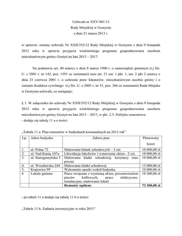 Uchwała nr XXV/401/13 Rady Miejskiej w Gostyniu z dnia 21 marca 2013 r. w sprawie: zmiany uchwały Nr XXII/352/12 Rady Miejskiej w Gostyniu z dnia 9 listopada 2012 roku w sprawie przyjęcia wieloletniego programu gospodarowania zasobem mieszkaniowym gminy Gostyń na lata 2013 – 2017. Na podstawie art. 40 ustawy z dnia 8 marca 1990 r. o samorządzie gminnym (t.j Dz. U. z 2001 r. nr 142, poz. 1591 ze zmianami) oraz art. 21 ust. 1 pkt. 1, ust. 2 pkt 2 ustawy z dnia 21 czerwca 2001 r. o ochronie praw lokatorów, mieszkaniowym zasobie gminy i o zmianie Kodeksu cywilnego (t.j Dz. U. z 2005 r. nr 31, poz. 266 ze zmianami) Rada Miejska w Gostyniu uchwala, co następuje: § 1. W załączniku do uchwały Nr XXII/352/12 Rady Miejskiej w Gostyniu z dnia 9 listopada 2012 roku w sprawie przyjęcia wieloletniego programu gospodarowania zasobem mieszkaniowym gminy Gostyń na lata 2013 – 2017, w pkt. 2.3. Polityka remontowa: - dodaje się tabelę 11 a o treści: „Tabela 11 a. Plan remontów w budynkach komunalnych na 2013 rok” Lp. Adres budynku Zakres prac Planowany koszt 1. 2. 3. ul. Polna 72 ul. Nad Kanią 107a ul. Starogostyńska 3 4. 5. 6 ul. Wrocławska 244 Krajewice 99 Lokale gminne Malowanie klatek schodowych – 3 szt. Likwidacja luksferów i wstawienie okien - 2 szt. Malowanie klatki schodowej, korytarzy oraz piwnic Malowanie klatki schodowej Wykonanie opaski wokół budynku Prace związane z wymianą okien, przestawieniem pieców kaflowych, prace elektryczne, instalacyjne, malowanie lokali Remonty ogółem: - po tabeli 11 a dodaje się tabelę 11 b o treści: „Tabela 11 b. Zadania inwestycyjne w roku 2013” 10 000,00 zł 10 000,00 zł 10 000,00 zł 15 000,00 zł 10 000,00 zł 18 200,00 zł 73 200,00 zł 1. Gola 15 Wymiana pokrycia dachu wraz z wykonaniem obróbek blacharskich i przemurowaniem kominów 100.000,00 § 2. Wykonanie uchwały powierza się Burmistrzowi Gostynia. § 3. Uchwała wchodzi w życie po upływie 14 dni od dnia ogłoszenia w Dzienniku Urzędowym Województwa Wielkopolskiego. Przewodniczący Rady /-/ Jerzy Woźniakowski UZASADNIENIE do Uchwały nr XXV/401/13 Rady Miejskiej w Gostyniu z dnia 21 marca 2013 r. w sprawie: zmiany w części uchwały Nr XXII/352/12 Rady Miejskiej w Gostyniu z dnia 9 listopada 2012 roku w sprawie przyjęcia wieloletniego programu gospodarowania zasobem mieszkaniowym gminy Gostyń na lata 2013 – 2017. W wieloletnim programie gospodarowania zasobem mieszkaniowym gminy Gostyń na lata 2013 – 2017 zapisano obowiązek wprowadzania do programu planów remontowych i modernizacyjnych na kolejne lata w drodze uchwał Rady Miejskiej w Gostyniu. Przedstawione w uchwale tabele określają plan remontów i zadań inwestycyjnych na 2013 roku. W związku z powyższym podjęcie uchwały jest zasadne. Przewodniczący Rady /-/ Jerzy Woźniakowski