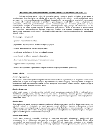 Wymagania edukacyjne z przedmiotu plastyka w klasie IV według programu Nowej Ery Podczas ustalania oceny z plastyki szczególną uwagę zwraca na wysiłek wkładany przez ucznia w wywiązywanie się z obowiązków wynikających ze specyfiki zajęć. Oprócz wiedzy i umiejętności równie ważna jest pozytywna postawa wobec przedmiotu. Składają się na nią: aktywne uczestnictwo w zajęciach, przynoszenie na lekcje odpowiednich materiałów i przyborów, przestrzeganie zasad BHP podczas posługiwania się narzędziami, efektywne gospodarowanie czasem przeznaczonym na ćwiczenia plastyczne, a także zachowywanie porządku w swoim miejscu pracy – zarówno podczas zajęć, jak i po ich zakończeniu. Nie bez znaczenia są też dobre wyniki osiągane w konkursach plastycznych, udział w szkolnych i pozaszkolnych uroczystościach (przygotowywanie oprawy plastycznej imprez), wykonywanie ponadobowiązkowych prac plastycznych, przygotowywanie gazetek szkolnych lub informacji wzbogacających proces lekcyjny na podstawie różnych źródeł. Ocenianie prac plastycznych - zgodność pracy z tematem lekcji, - poprawność wykorzystanych układów kompozycyjnych, - trafność doboru środków artystycznego wyrazu, - umiejętność posługiwania się daną techniką plastyczną, - pomysłowość w doborze materiałów i narzędzi, - stosowanie niekonwencjonalnych, twórczych rozwiązań, - oryginalność realizacji danego tematu - estetyka pracy (ostatnie kryterium nie dotyczy uczniów cierpiących na różne dysfunkcje). Stopnie szkolne Stopień dopuszczający Przyswojenie przez ucznia podstawowych wiadomości i umiejętności wymienionych w programie nauczania dla przedmiotu „plastyka” stanowi podstawę do wystawienia oceny dopuszczającej. Dziecko powinno rozwiązywać (samodzielnie bądź z pomocą nauczyciela) zadania plastyczne o niewielkim stopniu trudności, wykorzystując w stopniu minimalnym dostępne narzędzia pracy. Stopień dostateczny Jeżeli uczeń opanuje w stopniu średnim materiał objęty programem nauczania (braki w wiadomościach o charakterze szczegółowym), należy wystawić mu ocenę dostateczną. Dziecko powinno samodzielnie rozwiązywać zadania plastyczne o niewielkim stopniu trudności, poprawnie posługując się różnymi przyborami i narzędziami pracy. Stopień dobry Stosowanie przez ucznia w praktyce elementów zdobytej wiedzy teoretycznej oraz jego aktywne uczestnictwo w zajęciach (udział w dyskusjach na temat prezentowanych obiektów, staranne wykonywanie ćwiczeń obligatoryjnych) stanowi podstawę do wystawienia oceny dobrej. Dziecko powinno samodzielne rozwiązywać zadania teoretyczne, odpowiednio posługiwać się przyborami i narzędziami oraz wykonywać prace plastyczne poprawne pod względem technicznym i estetycznym. Stopień bardzo dobry Uczeń, który opanował wszystkie określone w programie nauczania wiadomości i umiejętności oraz wykorzystuje je w działaniach plastycznych, otrzymuje stopień bardzo dobry. Dziecko bierze udział w dyskusjach na temat prezentowanych obiektów, podczas których przekonująco uzasadnia swoje poglądy. Stosuje również z powodzeniem wiedzę teoretyczną, wykonując ćwiczenia praktyczne, oraz sprawnie operuje wybraną techniką plastyczną. Ponadto chętnie uczestniczy w różnorodnych działaniach plastycznych na terenie szkoły i poza nią (startuje w konkursach plastycznych, wykonuje gazetki szkolne i oprawę plastyczną imprez, należy do koła zainteresowań) oraz uzupełnia wiadomości samodzielnie dobranymi lub wskazanymi przez nauczyciela lekturami. Stopień celujący Jeżeli uczeń przejawia szczególne zainteresowania plastyką (np. kolekcjonuje reprodukcje i książki o sztuce, przygotowuje referaty i pomoce dydaktyczne,) oraz posiada wiedzę i umiejętności znacznie wykraczające poza wymagania określone w programie nauczania, może uzyskać stopień celujący. Ponadto powinien brać udział w min. 3 konkursach plastycznych, w miarę możliwości osiągać sukcesy, wykazywać zaangażowanie i twórczą inicjatywę we wszelkich działaniach plastycznych na terenie szkoły .Wykorzystywać wiedzę i umiejętności zdobyte poza szkołą w działalności szkolnej i konkursowej. Wymagania edukacyjne Wymagania konieczne Spełnienie wymagań pozwala postawić ocenę dopuszczającą. Wymagania podstawowe Spełnienie wymagań pozwala postawić ocenę Z pomocą nauczyciela uczeń: wymienia placówki działające na rzecz kultury, tłumaczy zasady zachowania się w muzeum, wskazuje zabytki znajdujące się w regionie, podaje nazwiska najwybitniejszych malarzy polskich i zagranicznych, wyjaśnia, kogo możemy nazywać twórcą ludowym, opisuje tradycje i symbole związane ze świętami Bożego Narodzenia oraz z Wielkanocą, nazywa elementy dzieła plastycznego (kreska, kropka, plama walorowa, barwa, światłocień, technika, faktura, kształt, kompozycja, perspektywa), wskazuje podstawowe środki wyrazu plastycznego znajdujące się w najbliższym otoczeniu i je opisuje, wyjaśnia znaczenie niektórych z omówionych na lekcji terminów plastycznych, wymienia nazwy niektórych z poznanych dziedzin sztuki (np. rysunek, malarstwo, grafika, rzeźba, architektura, sztuka użytkowa, sztuka ludowa oraz współczesne formy: fotografika, film, instalacja, happening), rozróżnia dzieła należące do poszczególnych dziedzin twórczości artystycznej (rysunek, malarstwo, grafika, rzeźba, architektura, sztuka ludowa, rzemiosło artystyczne itd.), tłumaczy, czym zajmują się rysownik, malarz, grafik, rzeźbiarz i architekt, wskazuje różnice między rysunkiem a malarstwem, uzyskuje barwy pochodne, wykorzystując barwy podstawowe, wymienia podstawowe elementy warsztatu fotograficznego, nazywa niektóre gatunki filmowe, wskazuje środki masowego przekazu, wskazuje podstawowe narzędzia pracy plastyka i wykorzystuje je w minimalnym stopniu w swoich działaniach, podejmuje próby zastosowania elementów teorii w ćwi