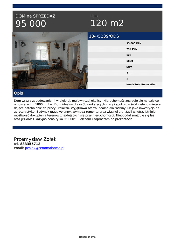 DOM na SPRZEDAŻ 95 000 Lipa 120 m2 134/5239/ODS 95 000 PLN 792 PLN 120 1800 Sqm 4 1 NeedsTotalRenovation Opis Dom wraz z zabudowaniami w pięknej, malowniczej okolicy! Nieruchomość znajduje się na działce o powierzchni 1800 m. kw. Dom idealny dla osób szukających ciszy i spokoju wśród zieleni, miejsce dające natchnienie do pracy i relaksu. Wyjątkowa oferta idealna dla rodziny lub jako inwestycja na agroturystykę. Budynek przedwojenny, wymaga remontu oraz własnej aranżacji wnętrz. Istnieje możliwość dokupienia terenów znajdujących się przy nieruchomości. Nieopodal znajduje się las oraz jezioro! Okazyjna cena tylko 95 000!!! Polecam i zapraszam na prezentacje Przemysław Żołek tel. 883355712 email: [email protected] Renomahome Powered by TCPDF (www.tcpdf.org)