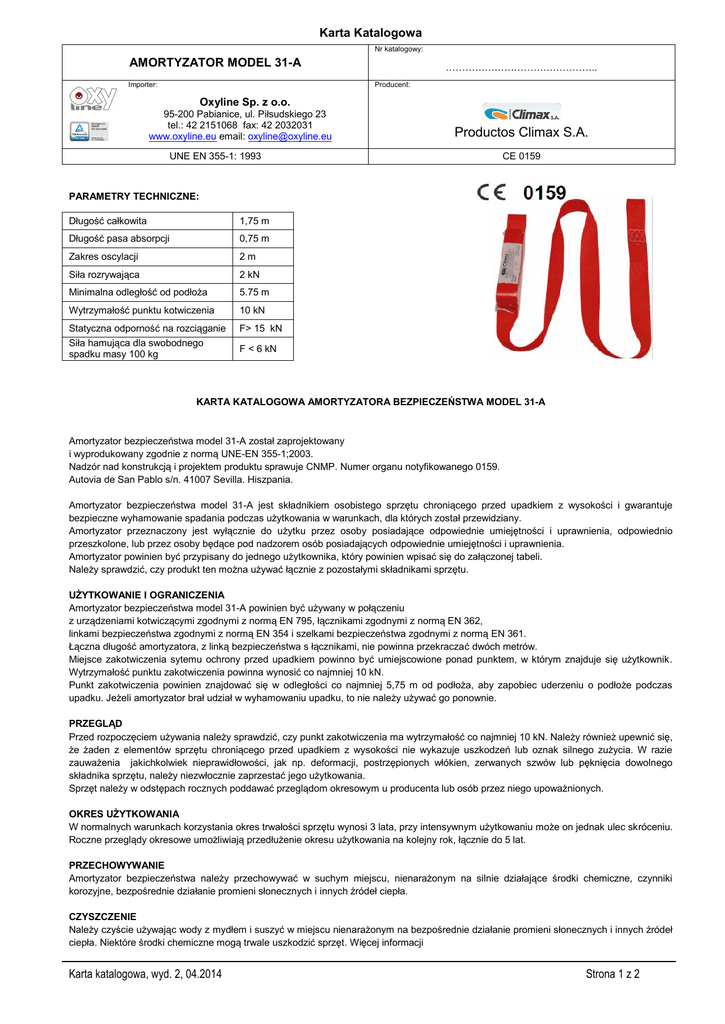 Karta Katalogowa Nr katalogowy: AMORTYZATOR MODEL 31-A Importer: ……………………………………….. Producent: Oxyline Sp. z o.o. 95-200 Pabianice, ul. Piłsudskiego 23 tel.: 42 2151068 fax: 42 2032031 www.oxyline.eu email: [email protected] Productos Climax S.A. UNE EN 355-1: 1993 CE 0159 PARAMETRY TECHNICZNE: Długość całkowita 1,75 m Długość pasa absorpcji 0,75 m Zakres oscylacji 2m Siła rozrywająca 2 kN Minimalna odległość od podłoża 5.75 m Wytrzymałość punktu kotwiczenia 10 kN Statyczna odporność na rozciąganie F> 15 kN Siła hamująca dla swobodnego spadku masy 100 kg F < 6 kN KARTA KATALOGOWA AMORTYZATORA BEZPIECZEŃSTWA MODEL 31-A Amortyzator bezpieczeństwa model 31-A został zaprojektowany i wyprodukowany zgodnie z normą UNE-EN 355-1;2003. Nadzór nad konstrukcją i projektem produktu sprawuje CNMP. Numer organu notyfikowanego 0159. Autovia de San Pablo s/n. 41007 Sevilla. Hiszpania. Amortyzator bezpieczeństwa model 31-A jest składnikiem osobistego sprzętu chroniącego przed upadkiem z wysokości i gwarantuje bezpieczne wyhamowanie spadania podczas użytkowania w warunkach, dla których został przewidziany. Amortyzator przeznaczony jest wyłącznie do użytku przez osoby posiadające odpowiednie umiejętności i uprawnienia, odpowiednio przeszkolone, lub przez osoby będące pod nadzorem osób posiadających odpowiednie umiejętności i uprawnienia. Amortyzator powinien być przypisany do jednego użytkownika, który powinien wpisać się do załączonej tabeli. Należy sprawdzić, czy produkt ten można używać łącznie z pozostałymi składnikami sprzętu. UŻYTKOWANIE I OGRANICZENIA Amortyzator bezpieczeństwa model 31-A powinien być używany w połączeniu z urządzeniami kotwiczącymi zgodnymi z normą EN 795, łącznikami zgodnymi z normą EN 362, linkami bezpieczeństwa zgodnymi z normą EN 354 i szelkami bezpieczeństwa zgodnymi z normą EN 361. Łączna długość amortyzatora, z linką bezpieczeństwa s łącznikami, nie powinna przekraczać dwóch metrów. Miejsce zakotwiczenia sytemu ochrony przed upadkiem powinno być umiejscowione ponad punktem, w którym znajduje się użytkownik. Wytrzymałość punktu zakotwiczenia powinna wynosić co najmniej 10 kN. Punkt zakotwiczenia powinien znajdować się w odległości co najmniej 5,75 m od podłoża, aby zapobiec uderzeniu o podłoże podczas upadku. Jeżeli amortyzator brał udział w wyhamowaniu upadku, to nie należy używać go ponownie. PRZEGLĄD Przed rozpoczęciem używania należy sprawdzić, czy punkt zakotwiczenia ma wytrzymałość co najmniej 10 kN. Należy również upewnić się, że żaden z elementów sprzętu chroniącego przed upadkiem z wysokości nie wykazuje uszkodzeń lub oznak silnego zużycia. W razie zauważenia jakichkolwiek nieprawidłowości, jak np. deformacji, postrzępionych włókien, zerwanych szwów lub pęknięcia dowolnego składnika sprzętu, należy niezwłocznie zaprzestać jego użytkowania. Sprzęt należy w odstępach rocznych poddawać przeglądom okresowym u producenta lub osób przez niego upoważnionych. OKRES UŻYTKOWANIA W normalnych warunkach korzystania okres trwałości sprzętu wynosi 3 lata, przy intensywnym użytkowaniu może on jednak ulec skróceniu. Roczne przeglądy okresowe umożliwiają przedłużenie okresu użytkowania na kolejny rok, łącznie do 5 lat. PRZECHOWYWANIE Amortyzator bezpieczeństwa należy przechowywać w suchym miejscu, nienarażonym na silnie działające środki chemiczne, czynniki korozyjne, bezpośrednie działanie promieni słonecznych i innych źródeł ciepła. CZYSZCZENIE Należy czyście używając wody z mydłem i suszyć w miejscu nienarażonym na bezpośrednie działanie promieni słonecznych i innych źródeł ciepła. Niektóre środki chemiczne mogą trwale uszkodzić sprzęt. Więcej informacji Karta katalogowa, wyd. 2, 04.2014 Strona 1 z 2 można uzyskać u dostawcy. OZNACZENlA Sprzęt ochrony indywidualne] zgodny z normą UNE-EN 355. OSTRZEŻENIA Użytkownik ponosi pełne ryzyko i odpowiedzialność za wszelkiego rodzaju szkody, z uszkodzeniem ciała i śmiercią włącznie, które mogą zaistnieć w jakiejkolwiek sytuacji podczas użytkowania naszych produktów. Jeśli nie jest on w stanie ponieść takiej odpowiedzialności lub ryzyka, nie powinien posługiwać się tym sprzętem. NIEDOZWOLONE SPOSOBY UŻYWANIA Niekontrolowane używanie sprzętu. Używanie sprzętu na wysokości nic pozwalające na 5,75 m swobodnego lotu w trakcie upadku swobodnego lotu w razie upadku. Używanie amortyzatora bezpieczeństwa o długości powyżej dwóch metrów. Kotwiczenie amortyzatora bezpieczeństwa w punkcie znajdującym się poniżej użytkownika. Oddalanie się od punktu kotwiczenia pod katem powyżej 30o. Używanie sprzętu w miejscu niebezpiecznym w przypadku efektu wahadła. Używanie linki bezpieczeństwa zaplątanej jub z węzłami. Używanie sprzętu, który uczestniczył w wyhamowaniu upadku. Używanie amortyzatora bezpieczeństwa do zabezpieczenia kilku osób naraz. Używanie urządzenie do celu niezgodnego z jego przeznaczeniem. Mocowani:: urządzenie w inny sposób, niż do punktu kotwiczenia. Używanie urządzenia kotwiczącego jako zawiesia. Używanie sprzętu w miejscu, w którym ewentualny upadek grozi uderzeniem o przeszkody Przypadków biednego zastosowanie jest tak wiele, że nie da się ich wszystkich wymienić. REKOMENDUJEMY STOSOWANIE AMORTYZATORA Z POZOSTAŁYMI ELEMENTAMI SYSTEMU ZABEZPIECZENIA PRZED UPADKIEM: Zatrzaśnik 30 OVAL Climax EN 362 Linka model 39 Climax EN 354 Uprząż Basic 10 Climax, lub Atlas Climax, lubi Rota Comfort Climax EN 361 AMORTYZATOR MODEL 31-A CE0159 Nazwisko użytkownika: Data zakupu: Data pierwszego użycia: Data produkcji: Numer seryjny: Uwagi: Data przeglądu Karta katalogowa, wyd. 2, 04.2014 Nazwisko osoby dokonującej przeglądu Pieczątka, podpis Strona 2 z 2