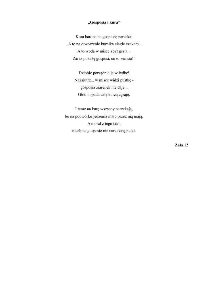 „Gosposia i kura” Kura bardzo na gosposię narzeka: „A to na otworzenie kurnika ciągle czekam... A to woda w misce zbyt gęsta... Zaraz pokażę gosposi, co to zemsta!” Dziobie porządnie ją w łydkę! Nazajutrz... w misce widzi pustkę gosposia ziarenek nie daje... Głód dopada całą kurzą zgraję. I teraz na kurę wszyscy narzekają, bo na podwórku jedzenia mało przez nią mają. A morał z tego taki: niech na gosposię nie narzekają ptaki. Zala 12