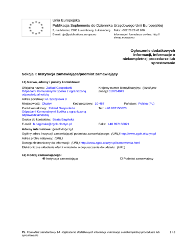 Unia Europejska Publikacja Suplementu do Dziennika Urzędowego Unii Europejskiej 2, rue Mercier, 2985 Luxembourg, Luksemburg Faks: +352 29 29 42 670 E-mail: [email protected] Informacje i formularze on-line: http:// simap.europa.eu Ogłoszenie dodatkowych informacji, informacje o niekompletnej procedurze lub sprostowanie Sekcja I: Instytucja zamawiająca/podmiot zamawiający I.1) Nazwa, adresy i punkty kontaktowe: Oficjalna nazwa: Zakład Gospodarki Odpadami Komunalnymi Spółka z ograniczoną odpowiedzialnością Krajowy numer identyfikacyjny: (jeżeli jest znany) 510734049 Adres pocztowy: ul. Sprzętowa 3 Miejscowość: Olsztyn Kod pocztowy: 10-467 Punkt kontaktowy: Zakład Gospodarki Odpadami Komunalnymi Spółka z ograniczoną odpowiedzialnością Państwo: Polska (PL) Tel.: +48 897150820 Osoba do kontaktów: Beata Bagińska E-mail: [email protected] Faks: +48 897150821 Adresy internetowe: (jeżeli dotyczy) Ogólny adres instytucji zamawiającej/ podmiotu zamawiającego: (URL) http://www.zgok.olsztyn.pl Adres profilu nabywcy: (URL) _____ Dostęp elektroniczny do informacji: (URL) http://www.zgok.olsztyn.pl/zamowienia.html Elektroniczne składanie ofert i wniosków o dopuszczenie do udziału: (URL) _____ I.2) Rodzaj zamawiającego: Instytucja zamawiająca Podmiot zamawiający PL Formularz standardowy 14 - Ogłoszenie dodatkowych informacji, informacje o niekompletnej procedurze lub sprostowanie 1/5 Sekcja II: Przedmiot zamówienia II.1.1) Nazwa nadana zamówieniu: Dostawa pięciu zestawów ciężarowych na potrzeby ZUOK Olsztyn: samochody ciężarowe typu hakowiec wraz z przyczepą oraz dziesięciu kontenerów typu KP-10 otwarty II.1.2) Krótki opis zamówienia lub zakupu: (podano w pierwotnym ogłoszeniu) 1. Przedmiotem zamówienia są: 1.1. dostawy: 1.1.1. Pięciu (5) fabrycznie nowych (rok produkcji 2015) zestawów ciężarowych składających się z: a. samochodu ciężarowego typu hakowiec (pojazd + urządzenie hakowe) b. przyczepy 1.1.2. Dziesięciu (10) fabrycznie nowych (rok produkcji 2015) kontenerów typu KP-10 otwarty oraz 1.2. usługa serwisowa ww. zestawów ciężarowych 1.3. subskrypcja systemu obsługi i diagnoz pojazdu 1.4. szkolenie personelu Zamawiającego, 1.5. ubezpieczenia komunikacyjne OC, AC i NNW samochodów ciężarowych wraz z urządzeniami hakowymi oraz przyczep na okres 12 miesięcy od daty ich zarejestrowania 2. Opis przedmiotu zamówienia zgodnie z Rozporządzeniem Komisji (WE) Nr 2151/2003 z 16 grudnia 2003 r. w sprawie Wspólnego Słownika Zamówień (CPV): Główny przedmiot: 34.14.45.10-6 Samochody do transportu odpadów 34.22.33.00-9 Przyczepy 66.51.41.10-0 Usługi ubezpieczeń pojazdów mechanicznych 65.16.10.00-1 Usługi ubezpieczenia pojazdów mechanicznych od odpowiedzialności cywilnej II.1.3) Wspólny Słownik Zamówień (CPV) Główny przedmiot Dodatkowe przedmioty Słownik główny 34144510 34223370 66514110 Słownik uzupełniający (jeżeli dotyczy) PL Formularz standardowy 14 - Ogłoszenie dodatkowych informacji, informacje o niekompletnej procedurze lub sprostowanie 2/5 Sekcja IV: Procedura IV.1)Rodzaj procedury (podano w pierwotnym ogłoszeniu) Otwarta Ograniczona Ograniczona przyspieszona Negocjacyjna Negocjacyjna przyspieszona Dialog konkurencyjny Negocjacyjna z uprzednim ogłoszeniem Negocjacyjna bez uprzedniego ogłoszenia Negocjacyjna z publikacją ogłoszenia o zamówieniu Negocjacyjna bez publikacji ogłoszenia o zamówieniu Udzielenie zamówienia bez uprzedniej publikacji ogłoszenia o zamówieniu w Dzienniku Urzędowym Unii Europejskiej IV.2)Informacje administracyjne IV.2.1)Numer referencyjny: (podano w pierwotnym ogłoszeniu) ZGOK/JRP/2/23/2015 IV.2.2)Dane referencyjne ogłoszenia w przypadku ogłoszeń przesłanych drogą elektroniczną: Pierwotne ogłoszenie przesłane przez eNotices TED eSender Login: ENOTICES_zgokolsztyn Dane referencyjne ogłoszenia: 2015-015701 rok i numer dokumentu IV.2.3)Ogłoszenie, którego dotyczy niniejsza publikacja: Numer ogłoszenia w Dz.U.: 2015/S 027-044999 z dnia: 07/02/2015 (dd/mm/rrrr) IV.2.4)Data wysłania pierwotnego ogłoszenia: 03/02/2015 (dd/mm/rrrr) PL Formularz standardowy 14 - Ogłoszenie dodatkowych informacji, informacje o niekompletnej procedurze lub sprostowanie 3/5 Sekcja VI: Informacje uzupełniające VI.1) Ogłoszenie dotyczy: Procedury niepełnej Sprostowania Informacji dodatkowych VI.2) Informacje na temat niepełnej procedury udzielenia zamówienia: Postępowanie o udzielenie zamówienia zostało przerwane Postępowanie o udzielenie zamówienia uznano za nieskuteczne Zamówienia nie udzielono Zamówienie może być przedmiotem ponownej publikacji VI.3) Informacje do poprawienia lub dodania : VI.3.1) Zmiana oryginalnej informacji podanej przez instytucję zamawiającą Publikacja w witrynie TED niezgodna z oryginalną informacją, przekazaną przez instytucję zamawiającą Oba przypadki VI.3.2) W ogłoszeniu pierwotnym W odpowiedniej dokumentacji przetargowej (więcej informacji w odpowiedniej dokumentacji przetargowej) W obu przypadkach (więcej informacji w odpowiedniej dokumentacji przetargowej) VI.3.3) Tekst, który należy poprawić w pierwotnym ogłoszeniu Miejsce, w którym znajduje się Zamiast: Powinno być: zmieniany tekst: 1.3. Wadium wniesione w pieniądzu 1.3. Wadium wniesione w pieniądzu III.1.1) Wymagane wadia i należy wpłacić przelewem na konto należy wpłacić przelewem na konto Zamawiającego: Zamawiającego: gwarancje:(jeżeli dotyczy) I. Zakład Gospodarki Odpadami Zakład Gospodarki Odpadami Informacje na temat. wadium Komunalnymi Sp. z o.o., ul. Komunalnymi Sp. z o.o., ul. Sprzętowa 3, 10-467 Olsztyn, Sprzętowa 3, 10-467 Olsztyn, Polska. Polska. Nazwa banku: Bank Ochrony Nazwa banku: Bank Ochrony Środowiska (BOŚ BANK) Oddział Środowiska (BOŚ BANK) Oddział Olsztyn. Olsztyn. Nr rachunku IBAN: PL 05 1540 Nr rachunku IBAN: PL 05 1540 1072 2107 5012 2050 0008 1072 2107 5012 2050 0008 kod SWIFT: EBOSPLPW063 z kod SWIFT: EBOSPLPW063 z dopiskiem: 