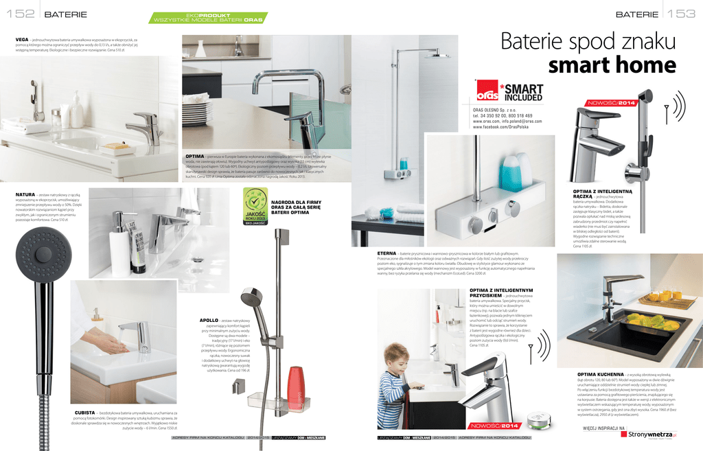 152 BATERIE BATERIE EKOPRODUKT WSZYSTKIE MODELE BATERII ORAS 153 Baterie spod znaku smart home VEGA – jednouchwytowa bateria umywalkowa wyposażona w ekoprzycisk, za pomocą którego można ograniczyć przepływ wody do 0,13 l/s, a także obniżyć jej wstępną temperaturę. Ekologiczne i bezpieczne rozwiązanie. Cena 510 zł. NOWOŚĆ/2014 ORAS OLESNO Sp. z o.o. tel. 34 350 92 00, 800 518 469 www.oras.com, [email protected] www.facebook.com/OrasPolska OPTIMA – pierwsza w Europie bateria wykonana z ekomosiądzu (elementy, przez które płynie woda, nie zawierają ołowiu). Wygodny uchwyt antypoślizgowy oraz wysoka (33 cm) wylewka obrotowa (pod kątem 120 lub 60º). Ekologiczny poziom przepływu wody – 0,2 l/s. Uniwersalny skandynawski design sprawia, że bateria pasuje zarówno do nowoczesnych, jak i klasycznych kuchni. Cena 920 zł. Linia Optima została odznaczona nagrodą Jakość Roku 2013. OPTIMA Z INTELIGENTNĄ RĄCZKĄ – jednouchwytowa NATURA – zestaw natryskowy z rączką wyposażoną w ekoprzycisk, umożliwiający zmniejszenie przepływu wody o 50%. Dzięki nowatorskim rozwiązaniom kąpiel przy zwykłym, jak i ograniczonym strumieniu pozostaje komfortowa. Cena 510 zł. bateria umywalkowa. Dodatkowa rączka natrysku – Bidetta, doskonale zastępuje klasyczny bidet, a także pozwala opłukać nad miską sedesową zabrudzony przedmiot czy napełnić wiaderko (nie musi być zainstalowana w bliskiej odległości od baterii). Wygodne rozwiązanie techniczne umożliwia zdalne sterowanie wodą. Cena 1105 zł. NAGRODA DLA FIRMY ORAS ZA CAŁĄ SERIĘ BATERII OPTIMA ETERNA – baterie prysznicowa i wannowo-prysznicowa w kolorze białym lub grafitowym. Przeznaczone dla miłośników ekologii oraz odważnych rozwiązań. Gdy ilość zużytej wody przekroczy poziom eko, sygnalizuje o tym zmiana koloru światła. Obudowę w stylistyce glamour wykonano ze specjalnego szkła akrylowego. Model wannowy jest wyposażony w funkcję automatycznego napełniania wanny, bez ryzyka przelania się wody (mechanizm EcoLed). Cena 3200 zł. OPTIMA Z INTELIGENTNYM PRZYCISKIEM – jednouchwytowa bateria umywalkowa. Specjalny przycisk, który można umieścić w dowolnym miejscu (np. na blacie lub szafce łazienkowej), pozwala jednym kliknięciem uruchomić lub odciąć strumień wody. Rozwiązanie to sprawia, że korzystanie z baterii jest wygodne również dla dzieci. Antypoślizgowa rączka i ekologiczny poziom zużycia wody (9,6 l/min). Cena 1105 zł. APOLLO – zestaw natryskowy zapewniający komfort kąpieli przy minimalnym zużyciu wody. Dostępne są dwa modele – tradycyjny (17 l/min) i eko (7 l/min), różniące się poziomem przepływu wody. Ergonomiczna rączka, nowoczesny suwak i dodatkowy uchwyt na głowicę natryskową gwarantują wygodę użytkowania. Cena od 196 zł. OPTIMA KUCHENNA – z wysoką obrotową wylewką (kąt obrotu 120, 80 lub 60°). Model wyposażony w dwie dźwignie uruchamiające oddzielnie strumień wody ciepłej lub zimnej. Po włączeniu funkcji bezdotykowej temperatura wody jest ustawiana za pomocą grafitowego pierścienia, znajdującego się na korpusie. Bateria dostępna jest także w wersji z elektronicznym wyświetlaczem wskazującym temperaturę wody, wyposażonym w system ostrzegania, gdy jest ona zbyt wysoka. Cena 1960 zł (bez wyświetlacza), 2950 zł (z wyświetlaczem). CUBISTA – bezdotykowa bateria umywalkowa, uruchamiana za pomocą fotokomórki. Design inspirowany sztuką kubizmu sprawia, że doskonale sprawdza się w nowoczesnych wnętrzach. Wyjątkowo niskie zużycie wody – 6 l/min. Cena 1550 zł. ADRESY FIRM NA KOŃCU K ATALOGU NOWOŚĆ/2014 2014/2015 2014/2015 ADRESY FIRM NA KOŃCU K ATALOGU WIĘCEJ INSPIRACJI NA