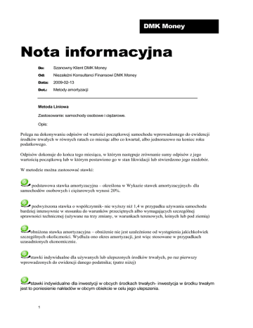 DMK Money Nota informacyjna Do: Szanowny Klient DMK Money Od: Niezależni Konsultanci Finansowi DMK Money Data: 2009-02-13 Dot.: Metody amortyzacji Metoda Liniowa Zastosowanie: samochody osobowe i ciężarowe. Opis: Polega na dokonywaniu odpisów od wartości początkowej samochodu wprowadzonego do ewidencji środków trwałych w równych ratach co miesiąc albo co kwartał, albo jednorazowo na koniec roku podatkowego. Odpisów dokonuje do końca tego miesiąca, w którym następuje zrównanie sumy odpisów z jego wartością początkową lub w którym postawiono go w stan likwidacji lub stwierdzono jego niedobór. W metodzie można zastosować stawki: podstawowa stawka amortyzacyjna – określona w Wykazie stawek amortyzacyjnych- dla samochodów osobowych i ciężarowych wynosi 20%. podwyższona stawka o współczynnik- nie wyższy niż 1,4 w przypadku używania samochodu bardziej intensywnie w stosunku do warunków przeciętnych albo wymagających szczególnej sprawności technicznej (używane na trzy zmiany, w warunkach terenowych, leśnych lub pod ziemią) obniżona stawka amortyzacyjna – obniżenie nie jest uzależnione od wystąpienia jakichkolwiek szczególnych okoliczności. Wydłuża ono okres amortyzacji, jest więc stosowane w przypadkach uzasadnionych ekonomicznie. stawki indywidualne dla używanych lub ulepszonych środków trwałych, po raz pierwszy wprowadzonych do ewidencji danego podatnika; (patrz niżej) stawki indywidualne dla inwestycji w obcych środkach trwałych- inwestycja w środku trwałym jest to poniesienie nakładów w obcym obiekcie w celu jego ulepszenia. 1 Metoda Indywidualne stawki amortyzacyjne Zastosowanie: środki trwałe używane lub ulepszone , po raz pierwszy wprowadzone do ewidencji, okres amortyzacji w przypadku środków transportu nie krótszy niż 30 miesięcy. Opis: Samochody używane -samochód może być uznany za używany, gdy podatnik udowodni, że przed jego nabyciem pojazd był wykorzystywany przez co najmniej 6 miesięcy Samochody ulepszone -jeżeli przed wprowadzeniem do ewidencji wydatki poniesione przez podatnika na jego ulepszenie stanowiły co najmniej 20% wartości początkowej. Środki trwałe uważa się za ulepszone, gdy suma wydatków poniesionych na ich przebudowę, rozbudowę, rekonstrukcję, adaptację lub modernizację w danym roku podatkowym przekracza 3500 zł i wydatki te powodują wzrost ich wartości użytkowej przy stosowaniu indywidualnej stawki amortyzacyjnej nie można używać współczynników podwyższających. Jej stosowanie jest możliwe tylko przy amortyzacji liniowej. www.dmkmoney.pl Strona 2 Metoda Degresywna Zastosowanie: samochody ciężarowe (środki transportu z wyłączeniem samochodów osobowych) oraz maszyny i urządzenia zaliczane do grup 3-6 i 8 KŚT Opis: Polega na tym, że odpisów amortyzacyjnych dokonuje się w pierwszym roku używania samochodu ciężarowego przy zastosowaniu stawki podanej w Wykazie stawek amortyzacyjnych (20%) podwyższonej o współczynnik nie wyższy niż 2,0, a w następnych latach podatkowych- od jego wartości początkowej pomniejszonej o dotychczasowe odpisy amortyzacyjne, ustalonej na początek kolejnych lat używania tego pojazdu. Przejście do etapu drugiego, na metodę liniową, następuje w roku podatkowym, w którym kwota amortyzacji ustalona metodą degresywną miałaby być niższa, od kwoty amortyzacji ustalonej metodą liniową. Już w tym roku stosować należy metodę liniową, korzystniejszą dla podatnika. jeżeli samochód ciężarowy używany jest w zakładzie podatnika położonym na terenie gminy o szczególnym zagrożeniu wysokim bezrobociem strukturalnym, dopuszczalne jest stosowanie współczynnika nie wyższego niż 3,0. www.dmkmoney.pl Strona 3