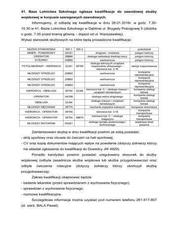 41. Baza Lotnictwa Szkolnego ogłasza kwalifikacje do zawodowej służby wojskowej w korpusie szeregowych zawodowych. Informujemy, iż odbędą się kwalifikacje w dniu 28.01.2016r. w godz. 7.3015.30 w 41. Bazie Lotnictwa Szkolnego w Dęblinie ul. Brygady Pościgowej 5 (zbiórka o godz. 7.00 przed bramą główną – dojazd od ul. Warszawskiej). Wykaz stanowisk służbowych na które będą prowadzone kwalifikacje: NAZWA STANOWISKA MINER - POMIAROWY OPERATOR DYŻURNY SW-1 34C61 28B66 20B82 SW-2 FOTOLABORANT - KIEROWCA 22J61 38T65 MŁODSZY STRZELEC 20B82 wartownicza MŁODSZY STRZELEC 20B82 wartownicza MŁODSZY STRZELEC 20B82 wartownicza KIEROWCA - OBSŁUGA 38T64 OPERATOR 34C66 OBSŁUGA 22J64 MŁODSZY MECHANIK 38T75 obsługa maszyn i urządzeń lotniskowych mechanik pojazdów kołowych KIEROWCA - OPERATOR 38T65 kierowca kat. C+E KIEROWCA - OPERATOR 38T64 MŁODSZY RATOWNIK 54G61 22J64 drogowo - mostowa obsługa radiostacji średniej mocy wartownicza obsługa lotniczych urządzeń rozpoznania obrazowego – kierowca kat. C+E kierowca kat. C – obsługa maszyn i urządzeń lotniskowych obsługa walca drogowego 38B74 kierowca kat. C – obsługa magazynu obsługa sprzętu pożarniczego i technicznego pododdział poligon lotniczy poligon lotniczy poligon lotniczy sekcja rozpoznawcza kompania reprezentacyjna kompania reprezentacyjna kompania reprezentacyjna kompania obsługi lotnisk kompania obsługi lotnisk kompania obsługi lotnisk kompania remontowa kompania transportowa kompania transportowa wojskowa straż pożarna Zainteresowani służbą w dniu kwalifikacji powinni ze sobą posiadać: - strój sportowy oraz obuwie do ćwiczeń na hali sportowej; - CV oraz kopię dokumentów mających wpływ na powołanie (dotyczy żołnierzy którzy nie składali zgłoszenia do kwalifikacji do Dowódcy JW 4929). Ponadto kandydaci powinni posiadać uregulowany stosunek do służby wojskowej (odbyta zasadnicza służba wojskowa lub służba przygotowawcza) oraz odbyte ćwiczenia rotacyjne (dotyczy żołnierzy którzy ukończyli służbę przygotowawczą). Zakres kwalifikacji obejmować będzie: - badanie lekarskie (przed sprawdzianem z wychowania fizycznego); - sprawdzian z wychowania fizycznego; - rozmowa kwalifikacyjna. Szczegółowe informacje można uzyskać pod numerem telefonu 261-517-807 (st. sierż. BALA Paweł).