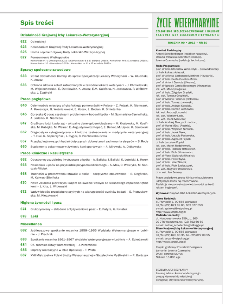 Spis treści Działalność Krajowej Izby Lekarsko-Weterynaryjnej 622Od redakcji 623Kalendarium Krajowej Rady Lekarsko-Weterynaryjnej 625Pisma i opinie Krajowej Rady Lekarsko-Weterynaryjnej 627Porozumienie Wielkopolskie Komunikat nr 7 z 20 sierpnia 2015 r.; Komunikat nr 8 z 27 sierpnia 2015 r.; Komunikat nr 9 z 1 września 2015 r.; Komunikat nr 10 z 8 września 2015 r.; Komunikat nr 11 z 17 września 2015 r. Sprawy społeczno-zawodowe 63320 lat działalności Komisji do spraw Specjalizacji Lekarzy Weterynarii – W. Kluciński, K. Anusz 636Ochrona zdrowia kobiet zatrudnionych w zawodzie lekarza weterynarii – J. Chmielewski, M. Wojciechowska, E. Dutkiewicz, K. Anusz, E.M. Galińska, N. Jackowska, P. Wróblewska, J. Zagórski Prace poglądowe 640Osiemnaście miesięcy afrykańskiego pomoru świń w Polsce – Z. Pejsak, K. Niemczuk, A. Kowalczyk, G. Woźniakowski, E. Kozak, Ł. Bocian, K. Śmietanka 645Gorączka Q coraz częstszym problemem w hodowli bydła – M. Szymańska-Czerwińska, A. Jodełko, K. Niemczuk 647Gruźlica u ludzi i zwierząt – aktualne dane epidemiologiczne – M. Krajewska, M. Kozińska, M. Kubajka, M. Weiner, E. Augustynowicz-Kopeć, Z. Bełkot, M. Lipiec, K. Szulowski 652Diagnostyka cytogenetyczna – kliniczne zastosowanie w medycynie weterynaryjnej – T. Huć, R. Sapierzyński, J. Rygier, B. Pieńkowska-Grela 657Przegląd najnowszych badań dotyczących dobrostanu i zachowania się psów – B. Rode 660Suplementy pokarmowe w żywieniu koni sportowych – A. Mirowski, A. Didkowska Prace kliniczne i kazuistyczne 662Obustronny zez zbieżny i wytrzeszcz u bydła – A. Balicka, I. Balicki, K. Lutnicki, Ł. Kurek 665Nasieniaki u psów na przykładzie przypadku klinicznego – A. Max, C. Wawryka, M. Sobczak-Filipiak 668Trudności w protezowaniu stawów u psów – aseptyczne obluzowanie – B. Degórska, M. Kalwas- Śliwińska 670Nowa Zelandia pierwszym krajem na świecie wolnym od wirusowego zapalenia tętnic koni – J. Kita, L. Witkowski 672Wpływ błędów przedlaboratoryjnych na wiarygodność wyników badań – E. Pietrzykowska, M. Kleczkowski Higiena żywności i pasz 674Glukozynolany – składniki antyżywieniowe pasz – E. Patyra, K. Kwiatek 678Leki Miscellanea 682Jubileuszowe spotkanie rocznika 1959–1965 Wydziału Weterynaryjnego w Lublinie – J. Piechnik 683Spotkanie rocznika 1961–1967 Wydziału Weterynaryjnego w Lublinie – A. Dzierżawski 68495. rocznica Bitwy Warszawskiej – J. Krzemiński 685Imprezy rekreacyjne w Izbie Opolskiej – T. Wisła 687XVII Mistrzostwa Polski Służby Weterynaryjnej w Strzelectwie Myśliwskim – R. Bartczak CZASOPISMO SPOŁECZNO-ZAWODOWE I NAUKOWE K R A J O W E J I Z B Y L E K A R S K O - W E T E R Y N A R YJ N E J ROCZNIK 90 • 2015 • NR 10 Komitet Redakcyjny: Antoni Schollenberger (redaktor naczelny), Danuta Trafalska (sekretarz redakcji), Joanna Czarnecka (redakcja techniczna). Rada Programowa: prof. dr hab. Stanisław Winiarczyk – przewodniczący, dr hab. Łukasz Adaszek, prof. dr Alfonso Carbonero‑Martinez (Hiszpania), prof. dr hab. Beata Cuvelier-Mizak, prof. dr Antoni Gamota (Ukraina), prof. dr Ignacio García-Bocanegra (Hiszpania), lek. wet. Maciej Gogulski, prof. dr hab. Zbigniew Grądzki, lek. wet. Tomasz Grupiński, prof. dr Marian Horzinek (Holandia), prof. dr hab. Tomasz Janowski, prof. dr hab. Andrzej Koncicki, prof. dr hab. Roman Lechowski, lek. wet. Andrzej Lisowski, lek. wet. Wiesław Łada, lek. wet. Jacek Mamczur, dr hab. Andrzej Max, prof. nadzw., prof. dr Karin Möstl (Austria), prof. dr hab. Wojciech Niżański, prof. dr hab. Jacek Osek, prof. dr hab. Urszula Pasławska, prof. dr hab. Zygmunt Pejsak, dr hab. Jarosław Popiel, lek. wet. Marek Radzikowski, prof. dr hab. Tadeusz Rotkiewicz, prof. dr hab. Piotr Silmanowicz, prof. dr Vasyl Stefanyk (Ukraina), prof. dr hab. Paweł Sysa, prof. dr hab. Józef Szarek, prof. dr hab. Piotr Szeleszczuk, lek. wet. Zbigniew Wróblewski, dr n. wet. Jan Żelazny. Prace poglądowe, prace kliniczno-kazuistyczne i dotyczące leków są recenzowane. Redakcja nie ponosi odpowiedzialności za treść reklam i ogłoszeń. Wydawca: Krajowa Izba Lekarsko-Weterynaryjna Adres Redakcji: al. Przyjaciół 1, 00-565 Warszawa tel./fax (22) 621 09 60, 602 377 553 e-mail: [email protected] http://www.vetpol.org.pl Redaktor naczelny: ul. Nowoursynowska 159c, p. 165, 02-776 Warszawa, tel. (22) 593 60 69 e-mail: [email protected] Biuro Krajowej Izby Lekarsko-Weterynaryjnej al. Przyjaciół 1, 00-565 Warszawa tel./fax (22) 628 93 35, tel. (22) 622 09 55 e-mail: [email protected] http://www.vetpol.org.pl Projekt graficzny: Foxrabbit Designers Łamanie: Joanna Czarnecka Druk i oprawa: MDruk Nakład: 15 000 egz. EGZEMPLARZ BEZPŁATNY Zmianę adresu korespondencyjnego proszę kierować do właściwej okręgowej izby lekarsko-weterynaryjnej.