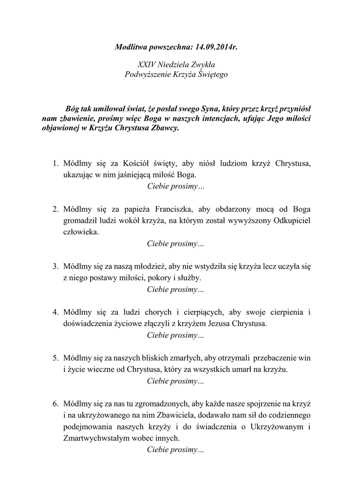 Modlitwa powszechna: 14.09.2014r. XXIV Niedziela Zwykła
