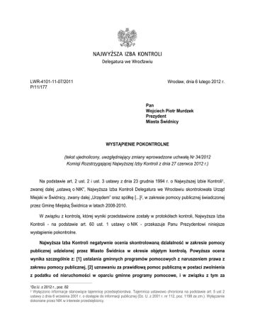 LWR-4101-11-07/2011 P/11/177 Wrocław, dnia 6 lutego 2012 r. Pan Wojciech Piotr Murdzek Prezydent Miasta Świdnicy WYSTĄPIENIE POKONTROLNE (tekst ujednolicony, uwzględniający zmiany wprowadzone uchwałą Nr 34/2012 Komisji Rozstrzygającej Najwyższej Izby Kontroli z dnia 27 czerwca 2012 r.) Na podstawie art. 2 ust. 2 i ust. 3 ustawy z dnia 23 grudnia 1994 r. o Najwyższej Izbie Kontroli1, zwanej dalej „ustawą o NIK”, Najwyższa Izba Kontroli Delegatura we Wrocławiu skontrolowała Urząd Miejski w Świdnicy, zwany dalej „Urzędem” oraz spółkę [...]2, w zakresie pomocy publicznej świadczonej przez Gminę Miejską Świdnica w latach 2008-2010. W związku z kontrolą, której wyniki przedstawione zostały w protokółach kontroli, Najwyższa Izba Kontroli - na podstawie art. 60 ust. 1 ustawy o NIK - przekazuje Panu Prezydentowi niniejsze wystąpienie pokontrolne. Najwyższa Izba Kontroli negatywnie ocenia skontrolowaną działalność w zakresie pomocy publicznej udzielonej przez Miasto Świdnica w okresie objętym kontrolą. Powyższa ocena wynika szczególnie z: [1] ustalania gminnych programów pomocowych z naruszeniem prawa z zakresu pomocy publicznej, [2] uznawaniu za prawidłową pomoc publiczną w postaci zwolnienia z podatku od nieruchomości w oparciu gminne programy pomocowe, i w związku z tym za 1Dz.U. z 2012 r., poz. 82 Wyłączono informacje stanowiące tajemnicę przedsiębiorstwa. Tajemnica ustawowo chroniona na podstawie art. 5 ust 2 ustawy z dnia 6 września 2001 r. o dostępie do informacji publicznej (Dz. U. z 2001 r. nr 112, poz. 1198 ze zm.). Wyłączenie dokonane przez NIK w interesie przedsiębiorcy. 2 wyłączoną z obowiązku notyfikacji do Komisji (WE), choć uchwały nie spełniały kryteriów zaliczenia ich do programów pomocowych, [3] braku bądź nierzetelnej weryfikacji spełniania przez beneficjenta warunków uzyskania i wykorzystania pomocy publicznej. Przyjęta ocena wynika z uwag i ocen cząstkowych przedstawionych poniżej. 1. W badanym okresie Gmina Miejska Świdnica udzieliła pomocy publicznej w łącznej wysokości 14.592 tys. zł na podstawie 7 programów uchwalonych przez Radę Miejską w Świdnicy, w tym 2 dotyczących regionalnej pomocy inwestycyjnej (Nr X/132/03 z 29 sierpnia 2003 r. i Nr XXI/253/08 z 27 czerwca 2008 r.), 3 ustalających zasady udzielania pomocy de minimis (Nr X/135/03 z 29 sierpnia 2003 r. ze zm., Nr VI/55/07 z 30 marca 2007 r. i Nr XIX/233/08 z 25 kwietnia 2008 r. ze zm.) oraz 2 w sprawie wyłączeń grupowych (Nr XLI/397/05 z 26 sierpnia 2005 r. i Nr VI/54/07 z 30 marca 2007 r.). 1.1. Ustalając na podstawie uchwały Rady Miejskiej w Świdnicy Nr X/132/033 z dnia 29 sierpnia 2003 r. warunki udzielania regionalnej pomocy inwestycyjnej (obowiązywała od 13 listopada 2003 r. do 14 września 2005 r., pomoc realizowana do 2008 r.), nie uwzględniono uwag zawartych w opinii Prezesa Urzędu Ochrony Konkurencji i Konsumentów4 (UOKiK) do projektu tej uchwały wniesionych w trybie art. 24 obowiązującej wówczas ustawy z dnia 27 lipca 2002 r. o warunkach dopuszczalności i nadzorowaniu pomocy publicznej dla przedsiębiorców5. Dotyczyło to w szczególności braku ustalenia w programie warunków charakteryzujących tę pomoc, a dotyczących m.in. przeznaczenia pomocy. W związku z tym uchwała Nr X/132/03 nie spełniała wymogów aby uzyskać status programu pomocowego w świetle wymogów ustalonych w art. 7 pkt 6 ww. ustawy z 27 lipca 2002 r.6. Ocenę powyższą potwierdził UOKiK (organ właściwy w zakresie spraw związanych z pomocą publiczną) w opinii wydanej na potrzeby kontroli NIK. Prezydent Świdnicy nie podjął skutecznych działań w zakresie opracowania i przedłożenia do uchwalenia projektu programu regionalnej pomocy inwestycyjnej uwzględniającego warunki udzielenia pomocy wynikające z przywołanej wyżej ustawy z dnia 27 lipca 2002 r. w ramach wskazań ustalonych przez Radę Miejską w Świdnicy w § 16 uchwały Nr X/132/03. Pomoc na podstawie tej uchwały realizowano także po akcesji Polski do Unii Europejskiej (1 maja 2004 r.) bez wypełnienia warunku uznania tej pomocy za istniejącą w trybie przewidzianym w ust. 1 i 2 pkt 3 Polityka Konkurencji Załącznika IV do Aktu Przystąpienia7. W praktyce warunkiem W sprawie zwolnień w podatku od nieruchomości gruntów, budynków i budowli związanych z prowadzoną działalnością gospodarczą dla przedsiębiorców na terenie Gminy Miasto Świdnica 4 Nr DDO-43-741/2/2003/AH z dnia 14.07.2003 r. 5 Dz.U. Nr 141, poz. 1177 ze zm. 6Należy przez to rozumieć program, w tym akt normatywny, określający zasady, warunki i formy udzielania pomocy oraz określający albo zawierający podstawy prawne jej udzielenia 7 Akt dotyczący warunków przystąpienia Republiki Czeskiej, Republiki Estońskiej, Republiki Cypryjskiej, Republiki Łotewskiej, Republiki Litewskiej, Republiki Węgierskiej, Republiki Malty, Rzeczypospolitej Polskiej, Republiki Słowenii i Republiki Słowackiej oraz dostosowań w Traktatach stanowiących podstawę Unii Europejskiej – Dz. Urz. UE L 236 z 23.09.2003, s. 33 – ujęcie w wykazie środków pomocowych przedkładanym Komisji Europejskiej 3 2 uznania tej pomocy za istniejącą i w związku z tym za zwolnioną z obowiązku notyfikacji do Komisji Europejskiej na podstawie w art. 108 ust. 3 Traktatu o Funkcjonowaniu Unii Europejskiej (TFUE)8, było ujęcie przedmiotowej uchwały w wykazie istniejących środków pomocowych przedkładanym Komisji Europejskiej (przez UOKiK w imieniu państwa polskiego) i nie wyrażenie sprzeciwu przez tę Komisję w ciągu 3 miesięcy od dnia otrzymania kompletnej informacji dotyczącej tego środka pomocowego. Bez wypełnienia tego warunku pomoc udzielana na podstawie uchwały Nr XI/132/03 po wejściu Polski do Unii Europejskiej stanowiła nową pomoc w rozumieniu art. 1 lit. c rozporządzenia Rady (WE) Nr 659/1999 z dnia 22 marca 1999 r. ustanawiającego szczegółowe zasady stosowania art. 93 Tra