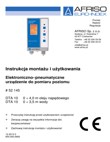 Pomiar Nadzór Regulacja AFRISO Sp. z o.o. Szałsza, ul. Kościelna 7 42-677 Czekanów Telefon +48 32 330-33-55 Fax +48 32 330-33-51 [email protected] www.afriso.pl Instrukcja montażu i użytkowania Elektroniczno–pneumatyczne urządzenie do pomiaru poziomu # 52 145 DTA 10 DTA 10 + + 0 ÷ 4,0 m oleju napędowego 0 ÷ 3,5 m wody Przeczytaj instrukcję przed użytkowaniem urządzenia! Zwracaj uwagę na wszystkie informacje dot. bezpieczeństwa! + Zachowaj instrukcję montażu i użytkowania! 12.2013 0 854.000.0692 Spis treści 1 2 3 4 5 6 7 8 2 Objaśnienia do instrukcji montażu i użytkowania .................................................... 4 1.1 Znaki ostrzegawcze ..................................................................................... 4 1.2 Wyjaśnienie znaczenia symboli ................................................................... 4 Bezpieczeństwo ....................................................................................................... 5 2.1 Przeznaczenie urządzenia ........................................................................... 5 2.2 Ograniczenie stosowania ............................................................................. 5 2.3 Kontrola jakości ............................................................................................ 5 2.4 Uprawnieni do obsługi .................................................................................. 6 2.5 Modyfikacje produktu ................................................................................... 6 2.6 Używanie części zamiennych i wyposażenia dodatkowego ........................ 6 2.7 Odpowiedzialność ........................................................................................ 6 Opis urządzenia ....................................................................................................... 7 3.1 Elementy dostawy ........................................................................................ 7 3.2 Działanie....................................................................................................... 8 3.3 Zastosowanie ............................................................................................... 8 3.4 Sygnalizator.................................................................................................. 9 3.5 Przegląd struktury menu ............................................................................ 10 Dane techniczne .................................................................................................... 11 4.1 Zgodność z dyrektywami............................................................................ 12 Transport i przechowywanie .................................................................................. 12 Montaż ................................................................................................................... 12 6.1 Przygotowanie do montażu ........................................................................ 12 6.2 Montaż sygnalizatora ................................................................................. 13 6.3 Połączenia elektryczne .............................................................................. 14 6.4 Podłączenie sondy do zbiornika................................................................. 15 6.5 Podłączenie sondy do sygnalizatora .......................................................... 16 Ustawianie sygnalizatora ....................................................................................... 17 7.1 Wybór języka .............................................................................................. 17 7.2 Wybór medium ........................................................................................... 17 7.3 Wybór kształtu zbiornika ............................................................................ 18 7.4 Ustawienie wysokości zbiornika ................................................................. 18 7.5 Ustawienie pojemności zbiornika ............................................................... 18 7.6 Ustawienie alarmu ...................................................................................... 18 Eksploatacja .......................................................................................................... 18 8.1 Rozpoczęcie pomiaru ................................................................................. 18 8.2 Wskaźnik stanu baterii/oprogramowania ................................................... 19 8.3 Wyłączanie sygnalizatora ........................................................................... 19 DTA 10 9 10 11 12 13 14 Problemy................................................................................................................ 20 Wyłączenie z eksploatacji, złomowanie ................................................................ 21 Części zamienne ................................................................................................... 21 Gwarancja.............................................................................................................. 21 Prawa autorskie ..................................................................................................... 21 Satysfakcja klienta ................................................................................................. 22 DTA 10 3 1 Objaśnienia do instrukcji montażu i użytkowania Instrukcja montażu i użytkowania jest ważnym elementem dostawy. Dlatego zalecamy: Przeczytać instrukcję montażu i użytkowania przed instalacją urządzenia. Przechowywać instrukcję montażu i użytkowania przez cały czas eksploatacji urządzenia. Przekazać instrukcję montażu i użytkowania każdemu następnemu posiadaczowi lub użytkownikowi urządzenia. 1.1 Znaki ostrzegawcze ZAGROŻENIE Określa rodzaj i źródło zagrożenia. Opisuje co zrobić, by uniknąć zagrożenia. Zagrożenia mają 3 poziomy: Za