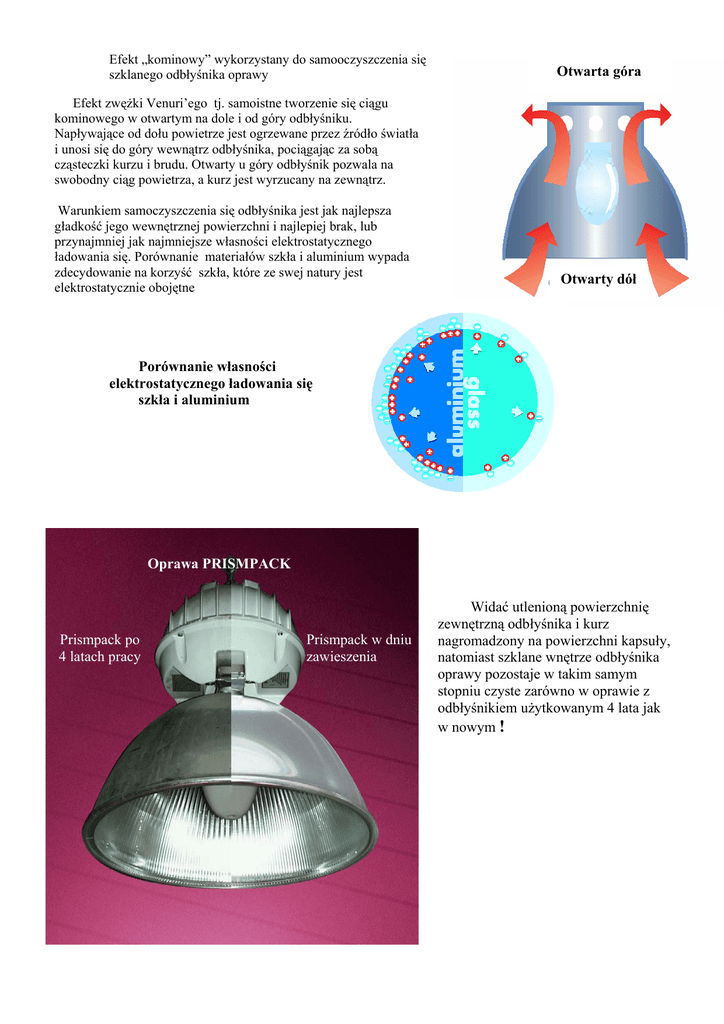 Efekt „kominowy” wykorzystany do samooczyszczenia się szklanego odbłyśnika oprawy Otwarta góra Efekt zwężki Venuri’ego tj. samoistne tworzenie się ciągu kominowego w otwartym na dole i od góry odbłyśniku. Napływające od dołu powietrze jest ogrzewane przez źródło światła i unosi się do góry wewnątrz odbłyśnika, pociągając za sobą cząsteczki kurzu i brudu. Otwarty u góry odbłyśnik pozwala na swobodny ciąg powietrza, a kurz jest wyrzucany na zewnątrz. Warunkiem samoczyszczenia się odbłyśnika jest jak najlepsza gładkość jego wewnętrznej powierzchni i najlepiej brak, lub przynajmniej jak najmniejsze własności elektrostatycznego ładowania się. Porównanie materiałów szkła i aluminium wypada zdecydowanie na korzyść szkła, które ze swej natury jest elektrostatycznie obojętne Otwarty dół Porównanie własności elektrostatycznego ładowania się szkła i aluminium Oprawa PRISMPACK Prismpack po 4 latach pracy Prismpack w dniu zawieszenia Widać utlenioną powierzchnię zewnętrzną odbłyśnika i kurz nagromadzony na powierzchni kapsuły, natomiast szklane wnętrze odbłyśnika oprawy pozostaje w takim samym stopniu czyste zarówno w oprawie z odbłyśnikiem użytkowanym 4 lata jak w nowym !