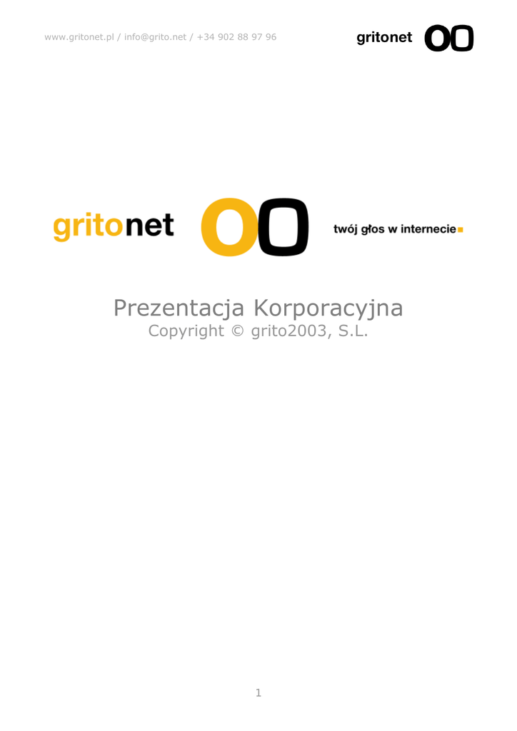 www.gritonet.pl / [email protected] / +34 902 88 97 96 Prezentacja Korporacyjna Copyright © grito2003, S.L. 1 www.gritonet.pl / [email protected] / +34 902 88 97 96 gritonet jest firmą o szerokim doświadczeniu, która od 2003 roku oferuje następujące usługi: • • • • rejestracja domen hosting stron internetowych serwery dedykowane rozwój stron internetowych Misja gritonet Misją gritonet jest oferowanie swoim klientom produktów oraz usług internetowych najwyższej jakości, zyskując i zapewniając ich satysfakcję oraz lojalność, osiągając jednocześnie rentowny i zrównoważony wzrost. Zespól gritonet gritonet tworzy młody i dynamiczny zespół o bogatym doświadczeniu w sektorze, współpracujący w celu zaoferowania swoim klientom jak najlepszą obsługę techniczną oraz handlową. Jeśli chcesz pracować w grito.net, wyślij swoje CV na adres: [email protected] Technologia gritonet Oferowanie znakomitych usług nie byłoby możliwe, jeżeli oprócz dysponowania doskonałym zespołem pracowników, nie dysponowalibyśmy najwyższej jakości technologią. Serwery ostatniej generacji oraz sprzęt łączący o wysokiej wydajności stanowią podstawę jakości świadczonych przez nas usług. 2 www.gritonet.pl / [email protected] / +34 902 88 97 96 : W pełni nowatorska technologia, rozwinięta przez zespół gritonet, pozwalająca na zarządzanie serwerami. Nigdy nie byłeś tak blisko swojego serwera. Więcej informacji: http://serwery.gritonet.pl/servidores_bthere.php Czym wyróżnia się gritonet? • • • • • • • • gritonet oferuje usługi wysokiej jakości po doskonałej cenie. gritonet zapewnia znakomitą obsługę techniczno/handlową o krótkim czasie odpowiedzi. gritonet zawiera nowatorski system zarządzania bthere na wszystkich swoich serwerach dedykowanych. Jeśli gritonet oferuje 5GB transferu miesięcznie, jest to rzeczywiście 5GB. Nie oczekuj mniej niż ci oferujemy. gritonet oferuje najlepszy i bezpłatny API tym, którzy odsprzedają domeny. gritonet ma swoje biuro. Znajduje się ono w Barcelonie (Hiszpania). gritonet ma swoje własne serwery. Również znajdują się one w Barcelonie (Hiszpania), w centrum danych Telvent. Nie na księżycu, ani w piwnicy w moim domu, ani na Kryptonie. gritonet to firma. gritonet jest firmą prawidłowo zarejestrowaną w Rejestrze Handlowym pod nazwą grito2003, S.L., o numerze NIP: B-63828438, Tom 37.502, Strona B-301.413, Arkusz 210, Zapis 1-szy. Biuro grito2003, S.L. Avda. Madrid 151-153, local B 08028 Barcelona, Hizpania gritonet działa również w innych krajach (http://www.gritonet.eu): • • • • • • Niemcy: http://www.gritonet.de Francja: http://www.gritonet.fr Włochy: http://www.gritonet.it Polska: http://www.gritonet.pl Wielka Brytania: http://www.gritonet.co.uk Hizpania: http://www.grito.net 3