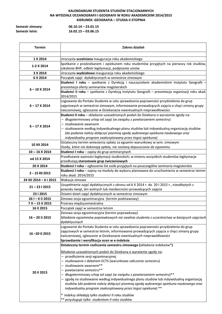 KALENDARIUM STUDENTA STUDIÓW STACJONARNYCH NA WYDZIALE OCEANOGRAFII I GEOGRAFII W ROKU AKADEMICKIM 2014/2015 KIERUNEK: GEOGRAFIA – STUDIA II STOPNIA Semestr zimowy: Semestr letni: 06.10.14 – 23.01.15 16.02.15 – 03.06.15 Termin Zakres działań 1 X 2014 Uroczysta uczelniana inauguracja roku akademickiego Spotkanie z prodziekanem i opiekunem roku studentów przyjętych na pierwszy rok studiów, szkolenie BHP, odbiór legitymacji, podpisanie umów Uroczysta wydziałowa inauguracja roku akademickiego Początek zajęć dydaktycznych w semestrze zimowym Studenci I roku – spotkanie z Dyrekcją i nauczycielami akademickimi Instytutu Geografii – prezentacja oferty seminariów magisterskich Studenci II roku – spotkanie z Dyrekcją Instytutu Geografii – prezentacja organizacji roku akad. 2014/2015 Logowanie do Portalu Studenta w celu sprawdzenia poprawności przydzielenia do grup zajęciowych w semestrze zimowym, informowanie prowadzących zajęcia o chęci zmiany grupy ćwiczeniowej, zgłaszanie w Dziekanacie ewentualnych nieprawidłowości Studenci II roku – składanie uzasadnionych podań do Dziekana o wyrażenie zgody na: – długoterminowy urlop od zajęć (w związku z powtarzaniem semestru) – studiowanie awansem – studiowanie według indywidualnego planu studiów lub indywidualną organizację studiów (do podania należy dołączyć pisemną zgodę wybranego opiekuna naukowego oraz indywidualny program zaakceptowany przez tegoż opiekuna) Ostateczny termin wniesienia opłaty za egzamin warunkowy w sem. zimowym Osoby, które nie dokonają opłaty, nie zostaną dopuszczone do egzaminu Studenci I roku – zapisy do grup seminaryjnych Przedłużanie ważności legitymacji studenckich; w imieniu wszystkich studentów legitymacje przedłużają starostowie grup ćwiczeniowych Studenci I roku – ogłoszenie list osób przyjętych na poszczególne seminaria magisterskie Studenci I roku – zapisy na moduły do wyboru planowane do uruchomienia w semestrze letnim roku akad. 2014/2015 Wakacje zimowe Uzupełnienie zajęć dydaktycznych z okresu od 6 X 2014 r. do 20 I 2015 r., nieodbytych z powodu świąt, dni wolnych lub nieobecności prowadzących zajęcia Ostatni dzień zajęć dydaktycznych w semestrze zimowym Zimowa sesja egzaminacyjna (termin podstawowy) Przerwa międzysemestralna Początek zajęć w semestrze letnim Zimowa sesja egzaminacyjna (termin poprawkowy) Składanie egzaminów poprawkowych nie zwalnia studenta z uczestnictwa w bieżących zajęciach dydaktycznych Logowanie do Portalu Studenta w celu sprawdzenia poprawności przydzielenia do grup zajęciowych w semestrze letnim, informowanie prowadzących zajęcia o chęci zmiany grupy ćwiczeniowej, zgłaszanie w Dziekanacie ewentualnych nieprawidłowości Sprawdzenie i weryfikacja ocen w e-indeksie Ostateczny termin rozliczenia semestru zimowego (składanie indeksów*) 1-2 X 2014 3 X 2014 6 X 2014 6 – 10 X 2014 6 – 17 X 2014 6 – 17 X 2014 10 XII 2014 10 − 16 X 2014 od 15 X 2014 20 X 2014 2 − 15 XII 2013 24 XII 2014 – 6 I 2015 21 – 23 I 2015 23 I 2015 26 I – 6 II 2015 7 II – 15 II 2015 16 II 2015 16 – 20 II 2015 16 –20 II 2015 20 II 2015 Składanie uzasadnionych podań do Dziekana o wyrażenie zgody na: – przedłużenie sesji egzaminacyjnej – studiowanie z debetem ECTS (warunkowe zaliczenie semestru) – studiowanie awansem** – powtarzanie semestru** – długoterminowy urlop od zajęć (w związku z powtarzaniem semestru)** – zgodę na studiowanie według indywidualnego planu studiów lub indywidualną organizację studiów (do podania należy dołączyć pisemną zgodą wybranego opiekuna naukowego oraz indywidualny program zaakceptowany przez tegoż opiekuna) ** * indeksy składają tylko studenci II roku studiów ** przysługuje tylko studentom II roku studiów od 12 III 2015 20 III 2015 3 – 7 IV 2015 10 IV 2015 2 V 2015 11 – 24 V 2015 20 V – 18 VI 2015 27 V – 3 VI 3 VI 2014 8 – 19 VI 2015 22 VI – 3 VII 2015 22 VI – 3 VII 2015 22 VI – 3 VII 2015 do 30 VI 2015 29 VI 2015 13 − 17 VII 2015 3 IX 2015 3 – 11 IX 2015 28 IX 2015 Przedłużanie ważności legitymacji studenckich; w imieniu wszystkich studentów legitymacje przedłużają starostowie grup ćwiczeniowych Święto Uniwersytetu Gdańskiego – Dzień Rektorski Wakacje wiosenne Ostateczny termin wniesienia opłaty za egzamin warunkowy w sem. letnim Osoby, które nie dokonają opłaty, nie zostaną dopuszczone do egzaminu Dzień Rektorski Studenci I roku – elektroniczne zapisy na przedmioty do wyboru (na rok akad. 2015/2016) Składanie podań o przyznanie miejsc w domu studenckim oraz o pomoc materialną w roku akademickim 2015/2016. Wnioski nie w pełni udokumentowane lub złożone po terminie nie będą rozpatrywane Uzupełnienie zajęć dydaktycznych z okresu 16 II-26 V 2014 r., nieodbytych z powodu świąt i dni wolnych (27 V za 20 III; 28 V za 3 IV; 29 V za 1 V) lub nieobecności prowadzących zajęcia (w dniach 1-3 VI) Ostatni dzień zajęć dydaktycznych w semestrze letnim Letnia sesja egzaminacyjna (termin podstawowy) Letnia sesja egzaminacyjna (termin poprawkowy) Sprawdzenie i weryfikacja ocen w e-indeksie Składanie uzasadnionych podań do Dziekana o wyrażenie zgody na: – przedłużenie sesji egzaminacyjnej – studiowanie z debetem ECTS (warunkowe zaliczenie semestru) – studiowanie awansem – powtarzanie semestru letniego – długoterminowy urlop od zajęć (w związku z powtarzaniem semestru) – zgodę na studiowanie według indywidualnego planu studiów lub indywidualną organizację studiów (do podania należy dołączyć pisemną zgodą wybranego opiekuna naukowego oraz indywidualny program zaakceptowany przez tegoż opiekuna) Studenci uczestniczący w wymianie międzyuczelnianej (ERASMUS, MOST) składają do Dziekanatu informacje odnośnie różnic programowych lub rezygnacji z wymiany Studenci II roku – ostateczny termin składania: – prac dyplomowych*** – podań o przedłużen