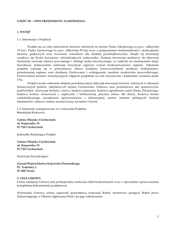 CZĘŚĆ III – OPIS PRZEDMIOTU ZAMÓWIENIA 1. WSTĘP 1.1. Informacje o Projekcie Projekt ma na celu odnowienie terenów zielonych na terenie Parku Zdrojowego (o pow. całkowitej 19 ha) i Parku Tężniowego (o pow. całkowitej 39 ha) wraz z polepszeniem funkcjonalności i atrakcyjności terenów parkowych oraz tworzenie warunków dla drobnej przedsiębiorczości. Dzięki tej inwestycji zwiększy się liczba kuracjuszy odwiedzających uzdrowisko. Zostaną stworzone podstawy do aktywnej stymulacji rozwoju sektora prywatnego i obsługi ruchu turystycznego, co wpłynie na zmniejszenie stopy bezrobocia. Jednocześnie realizacja inwestycji zapewni wzrost konkurencyjności regionu. Założenia projektu wpisują się w priorytetowy obszar działania Unowocześnienie struktury funkcjonalnoprzestrzennej regionu oraz działania Zachowanie i wzbogacanie zasobów środowiska przyrodniczego. Powierzchnia terenów inwestycyjnych objętych projektem na cele turystyczne i kulturalne wyniesie około 5 ha. Projekt swoim zakresem obejmie przedsięwzięcia takie jak renowacja terenów zielonych w obszarze historycznych parków zabytkowych miasta Ciechocinka. Odnowa oraz przebudowa alei spacerowych, podświetleń, renowacja fontann i stawu, budowa ptaszarni, budowa ogrodzenia części Parku Zdrojowego, budowa kortów tenisowych z zapleczem i herbaciarnią, placów) zabaw dla dzieci, budowa boiska wielofunkcyjnego (urządzenia sprawnościowe i rekreacyjne), zestaw fontann pełniących funkcje inhalatorów, odnowa zieleni, montaż koszy na śmieci i ławek. 1.2. Instytucje zaangażowane we wdrażanie Projektu: Beneficjent Końcowy: Gmina Miejska Ciechocinek ul. Kopernika 19 87-720 Ciechocinek Jednostka Realizująca Projekt: Gmina Miejska Ciechocinek ul. Kopernika 19 87-720 Ciechocinek Instytucja Zarządzająca: Zarząd Województwa Kujawsko-Pomorskiego Pl. Teatralny 2 87-100 Toruń 2. CELE UMOWY Celem niniejszej Umowy jest profesjonalna realizacja robót budowlanych wraz z uprzednim opracowaniem kompletnej dokumentacji projektowej. Wykonanie Umowy winno zapewnić prawidłową realizację Robót, terminowe przejęcie Robót przez Zamawiającego w Okresie Zgłaszania Wad i po jego zakończeniu. 1 3. ZAKRES ROBÓT 3.1. Informacje ogólne Zakres Robót w ramach Umowy obejmuje: 1. Przedmiot zamówienia obejmuje wykonanie całościowej dokumentacji projektowej oraz realizację robót budowlanych i instalacyjnych na terenie Gminy Miasta Ciechocinek, położonych: Teren I Park Tężniowy - Teren określony w Uchwale Rady Miasta X/123/03 numerami A7, A6, A5 oraz A8 – Aleja Pojednania. Obszar ograniczony od południa ul. Tężniową, od północy do wysokości połowy tężni nr 1, od wschodu – tężnią nr 1, od zachodu – ul. Pojednania. Opracowywany teren zajmuje działki 105/20 i 105/19, zajmuje powierzchnię ok. 50 tys. m², określony został w uchwale X/123/03 Rady Miejskiej Ciechocinka z dnia 29 grudnia 2003 r. jako obszar inwestycyjny A5, A6 i A7. Opracowanie projektowe zawiera następujące elementy: · zespół fontann (4 szt.) pełniących funkcję inhalatorów w formie otwartych gabinetów do fitoterapii, wokół każdej z fontann roślinność wspomagająca leczenie schorzeń; · amfiteatr – lekka konstrukcja (drewniana), niezwiązana trwale z gruntem, rozstawianą sezonowo; · budynek zaplecza dydaktycznego i gospodarczego obsługującego ogródek jordanowski z programem: pomieszczeń administracji, sanitarnych, wypożyczalnia sprzętu dydaktycznego i rekreacyjnego, świetlica z herbaciarnią, pomieszczenia magazynowe, pomieszczenia ochrony (dookoła nasadzenia kwiatów – klomby ozdobne). Dach: blacha matowiona, arkuszowa na rąbek stojący; · plac gier i zabaw dla dzieci różnych grup wiekowych, ogrodzony delikatnym, niewysokim, ażurowym ogrodzeniem; · boisko wielofunkcyjne: piłka nożna, siatkowa, koszykówka, nawierzchnia: sztuczna trawa, ogrodzenie: piłkochwyty (do 4 m); · Aleja Pojednania: pieszojezdnia, ze ścisłym określeniem dopuszczalnego ruchu kołowego (godzin i pojazdów), ze ścieżką rowerową oddzieloną od części spacerowej niską zielenią; nawierzchnia: kolorowa kostka typu bruk lub płytki klinkierowe, nasadzenia drzew po obu stronach (lipa kaukaska); · woda – zbiorniki, szerokość ok. 1-1,5 m, o głębokości ok. 15 cm, po prawej stronie terenu woda spływa kaskadą do podświetlonego basenu położonego w najniższej części terenu; · siłownia na wolnym powietrzu zlokalizowana w najniższej części terenu, osłonięta ze wszystkich stron zielenią; · mała architektura: - stylowe mini-pompy żeliwne i latarnie - ławeczki parkowe, kosze na śmieci Teren II Położony pomiędzy ulicą Kościuszki a stawami a Warzelnianą, południowo-zachodnia część Parku Zdrojowego. oraz między ulicami Traugutta 2 Omawiany teren zajmuje część działki 176/9, i ma powierzchnię ok. 20 tys. m², określony został w uchwale X/123/03 Rady Miejskiej Ciechocinka z dnia 29 grudnia 2003 r. jako teren C1. Opracowanie projektowe zawiera następujące elementy: · bramy wejściowe - ozdobne dwuskrzydłowe otwierane furty z iluminacją, 2 furtki robocze; · ogrodzenie terenu parku w zakresie oznaczonym w części graficznej, ogrodzenia ażurowe, fundamentowane punktowo bez podmurówki; · stawy: odbudowa z pogłębieniem, iluminacja, umocnienie brzegów, nasadzenia niskiej roślinności. Modernizacja (usunięcie betonowej przegrody i zastąpienie jej ażurową metalową). Na stawach fontanny: na większym: duża otoczona mniejszymi, na mniejszym: fontanny rozmieszczone po łuku, tworzące zasłonę dla żyjącego tam ptactwa; · budowa obiegu zamkniętego wody, wymuszającego jej ruch poprzez wybudowanie przy bramie wejściowej kaskad, biegnących częściowo na powierzchni, częściowo pod chodnikami, wpadających do stawów; · renowacja istniejących ścieżek parkowych, nawierzchnia: kostka granitowa; · wytyczenie nowych ścieżek zgodnie z istniejącymi nieformalnymi. N