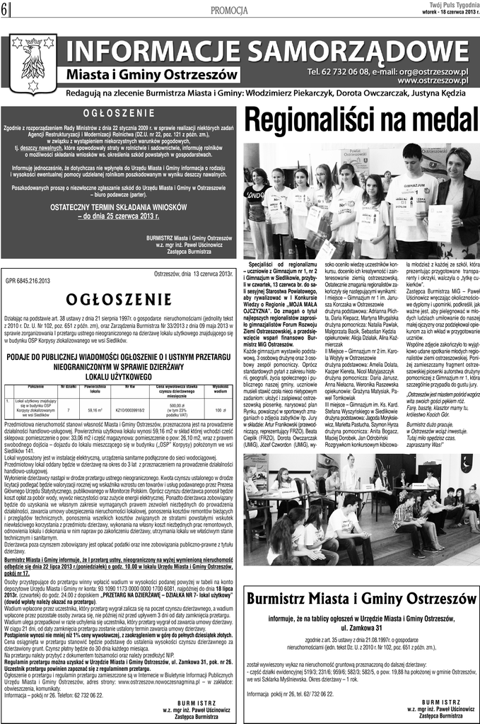 6 Twój Puls Tygodnia PROMOCJA OG£OSZENIE Zgodnie z rozporz¹dzeniem Rady Ministrów z dnia 22 stycznia 2009 r. w sprawie realizacji niektórych zadañ Agencji Restrukturyzacji i Modernizacji Rolnictwa (DZ.U. nr 22, poz. 121 z póŸn. zm.), w zwi¹zku z wyst¹pieniem niekorzystnych warunków pogodowych, tj. deszczy nawalnych, które spowodowa³y straty w rolnictwie i sadownictwie, informujê rolników o mo¿liwoœci sk³adania wniosków ws. okreœlenia szkód powsta³ych w gospodarstwach. wtorek - 18 czerwca 2013 r. Regionaliœci na medal Informujê jednoczeœnie, ¿e dotychczas nie wp³ynê³a do Urzêdu Miasta i Gminy informacja o rodzaju i wysokoœci ewentualnej pomocy udzielanej rolnikom poszkodowanym w wyniku deszczy nawalnych. Poszkodowanych proszê o niezw³oczne zg³aszanie szkód do Urzêdu Miasta i Gminy w Ostrzeszowie – biuro podawcze (parter). OSTATECZNY TERMIN SK£ADANIA WNIOSKÓW – do dnia 25 czerwca 2013 r. BURMISTRZ Miasta i Gminy Ostrzeszów w.z. mgr in¿. Pawe³ Uœcinowicz Zastêpca Burmistrza GPR 6845.216.2013 Ostrzeszów, dnia 13 czerwca 2013r. OG£OSZENIE Dzia³aj¹c na podstawie art. 38 ustawy z dnia 21 sierpnia 1997r. o gospodarce nieruchomoœciami (jednolity tekst z 2010 r. Dz. U. Nr 102, poz. 651 z póŸn. zm), oraz Zarz¹dzenia Burmistrza Nr 33/2013 z dnia 09 maja 2013 w sprawie zorganizowania I przetargu ustnego nieograniczonego na dzier¿awê lokalu u¿ytkowego znajduj¹cego siê w budynku OSP Korpysy zlokalizowanego we wsi Siedlików. PODAJE DO PUBLICZNEJ WIADOMOŒCI OG£OSZENIE O I USTNYM PRZETARGU NIEOGRANICZONYM W SPRAWIE DZIER¯AWY LOKALU U¯YTKOWEGO Przedmiotowa nieruchomoœæ stanowi w³asnoœæ Miasta i Gminy Ostrzeszów, przeznaczona jest na prowadzenie dzia³alnoœci handlowo-us³ugowej. Powierzchnia u¿ytkowa lokalu wynosi 59,16 m2 w sk³ad której wchodzi czeœæ sklepowa: pomieszczenie o pow: 33,06 m2 i czêœæ magazynowa: pomieszczenie o pow: 26,10 m2, wraz z prawem swobodnego dojœcia – dojazdu do lokalu mieszcz¹cego siê w budynku („OSP” Korpysy) po³o¿onym we wsi Siedlików 141. Lokal wyposa¿ony jest w instalacjê elektryczn¹, urz¹dzenia sanitarne pod³¹czone do sieci wodoci¹gowej. Przedmiotowy lokal oddany bêdzie w dzier¿awê na okres do 3 lat z przeznaczeniem na prowadzenie dzia³alnoœci handlowo-us³ugowej. Wy³onienie dzier¿awcy nast¹pi w drodze przetargu ustnego nieograniczonego. Kwota czynszu ustalonego w drodze licytacji podlegaæ bêdzie waloryzacji rocznej wg wskaŸnika wzrostu cen towarów i us³ug podawanego przez Prezesa G³ównego Urzêdu Statystycznego, publikowanego w Monitorze Polskim. Oprócz czynszu dzier¿awca ponosi³ bêdzie koszt op³at za pobór wody, wywóz nieczystoœci oraz zu¿ycie energii elektrycznej. Ponadto dzier¿awca zobowi¹zany bêdzie do uzyskania we w³asnym zakresie wymaganych prawem zezwoleñ niezbêdnych do prowadzenia dzia³alnoœci, zawarcia umowy ubezpieczenia nieruchomoœci lokalowej, ponoszenia kosztów remontów bie¿¹cych i przegl¹dów technicznych, ponoszenia wszelkich kosztów zwi¹zanych ze stratami powsta³ymi wskutek niew³aœciwego korzystania z przedmiotu dzier¿awy, wykonania na w³asny koszt niezbêdnych prac remontowych, odnowienia lokalu i dokonania w nim napraw po zakoñczeniu dzier¿awy, utrzymania lokalu we w³aœciwym stanie technicznym i sanitarnym. Dzier¿awca poza czynszem zobowi¹zany jest op³acaæ podatki oraz inne zobowi¹zania publiczno-prawne z tytu³u dzier¿awy. Burmistrz Miasta i Gminy informuje, ¿e I przetarg ustny, nieograniczony na wy¿ej wymienion¹ nieruchomoœæ odbêdzie siê dnia 22 lipca 2013 r.(poniedzia³ek) o godz. 10.00 w lokalu Urzêdu Miasta i Gminy Ostrzeszów, pokój nr 17. Osoby przystêpuj¹ce do przetargu winny wp³aciæ wadium w wysokoœci podanej powy¿ej w tabeli na konto depozytowe Urzêdu Miasta i Gminy nr konta: 93 1090 1173 0000 0000 1700 6081, najpóŸniej do dnia 18 lipca 2013r. (czwartek) do godz. 24.00 z dopiskiem „PRZETARG NA DZIER¯AWÊ – DZIA£KA NR 7- lokal u¿ytkowy” (dowód wp³aty nale¿y okazaæ na przetargu). Wadium wp³acone przez uczestnika, który przetarg wygra³ zalicza siê na poczet czynszu dzier¿awnego, a wadium wp³acone przez pozosta³e osoby zwraca siê, nie póŸniej ni¿ przed up³ywem 3 dni od daty zamkniêcia przetargu. Wadium ulega przepadkowi w razie uchylenia siê uczestnika, który przetarg wygra³ od zawarcia umowy dzier¿awy. W ci¹gu 21 dni, od daty zamkniêcia przetargu zostanie ustalony termin zawarcia umowy dzier¿awy. Post¹pienie wynosi nie mniej ni¿ 1% ceny wywo³awczej, z zaokr¹gleniem w górê do pe³nych dziesi¹tek z³otych. Cena osi¹gniêta w przetargu stanowiæ bêdzie podstawê do ustalenia wysokoœci czynszu dzier¿awnego za dzier¿awiony grunt. Czynsz p³atny bêdzie do 30 dnia ka¿dego miesi¹ca. Na przetargu nale¿y przybyæ z dokumentem to¿samoœci oraz nale¿y przed³o¿yæ NIP. Regulamin przetargu mo¿na uzyskaæ w Urzêdzie Miasta i Gminy Ostrzeszów, ul. Zamkowa 31, pok. nr 26. Uczestnik przetargu powinien zapoznaæ siê z regulaminem przetargu. Og³oszenie o przetargu i regulamin przetargu zamieszczone s¹ w Internecie w Biuletynie Informacji Publicznych Urzêdu Miasta i Gminy Ostrzeszów, adres strony: www.ostrzeszow.nowoczesnagmina.pl – w zak³adce: obwieszczenia, komunikaty. Informacja – pokój nr 26. Telefon: 62 732 06 22. BURM ISTRZ w.z. mgr in¿. Pawe³ Uœcinowicz Zastêpca Burmistrza Specjaliœci od regionalizmu – uczniowie z Gimnazjum nr 1, nr 2 i Gimnazjum w Siedlikowie, przybyli w czwartek, 13 czerwca br. do sali sesyjnej Starostwa Powiatowego, aby rywalizowaæ w I Konkursie Wiedzy o Regionie ,,MOJA MA£A OJCZYZNA”. Do zmagañ o tytu³ najlepszych regionalistów zaprosi³o gimnazjalistów Forum Rozwoju Ziemi Ostrzeszowskiej, a przedsiêwziêcie wspar³ finansowo Burmistrz MiG Ostrzeszów. Ka¿de gimnazjum wystawi³o podstawow¹, 3 osobow¹ dru¿ynê oraz 3 osobowy zespó³ pomocniczy. Oprócz standardowych pytañ z zakresu histori