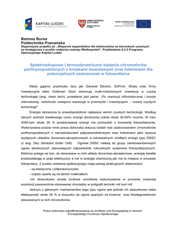 Bartosz Bursa Politechnika Poznańska Stypendysta projektu pt. „Wsparcie stypendialne dla doktorantów na kierunkach uznanych za strategiczne z punktu widzenia rozwoju Wielkopolski”, Poddziałanie 8.2.2 Programu Operacyjnego Kapitał Ludzki Spektroskopowe i termodynamiczne badania chromoforów porfirynopodobnych z kropkami kwantowymi oraz fulerenami dla potencjalnych zastosowań w fotowoltaice Kiedy giganci przemysłu tacy jak General Electric, DuPont, Sharp oraz firmy inwestycyjne takie Goldman Sash dokonują multi-miliardowych inwestycji w czystą technologię (ang. clean tech), przesłanie jest jasne: „Po rewolucji informatycznej i hossie internetowej, nadchodzi następna rewolucja w przemyśle i inwestycjach – rozwój czystych technologii” Energia słoneczna to prawdopodobnie najlepsza wśród czystych technologii. Według danych wartość światowego rynku energii słonecznej rośnie około 30-50% rocznie. W roku 2050-tym około 30 % produkowanej energii ma pochodzić z konwersji fotowoltaicznej. Wykonywana przeze mnie praca doktorska dotyczy badań nad zastosowaniem chromoforów porfirynopodobnych z nanostrukturami półprzewodnikowymi oraz fulerenami jako wysoce wydajnych układów donorowo-akceptorowych w odnawialnych źródłach energii typu DSSC (z ang. Dey Sentized Sollar Cell). Ogniwa DSSC należą do grupy cienkowarstwowych ogniw słonecznych stanowiących odpowiednik naturalnych systemów fotosyntetycznych. Różnica polega na tym, że stosowane w nich układy donorowo-akceptorowe, energię światła przekształcają w prąd elektryczny a nie w energię chemiczną jak ma to miejsce w procesie fotosyntezy. Z punktu widzenia aplikacyjnego mają szereg atrakcyjnych właściwości: - są elastyczne i półprzezroczyste; - często oparte są na tanich materiałach; -ich stosunkowo prosta budowa umożliwia wykorzystanie w procesie masowej produkcji powszechnie stosowanej chociażby w poligrafii techniki roll and roll. Jednym z głównych mankamentów tego typu ogniw jest jednak ich stosunkowa niska efektywność około 25 % w stosunku do ogniw opartych na krzemie oraz fotodegradalność stosowanych w nich chromoforów. Praca doktorska współfinansowana ze środków Unii Europejskiej w ramach Europejskiego Funduszu Społecznego Produkcja nowoczesnych materiałów dla elektroniki molekularnej, w szczególności dla organicznych komórek fotowoltaicznych wymaga poszukiwania układów molekularnych spełniających pewne wymagania. Pośród nich można wymienić chociażby silną absorpcję światła i odpowiednie czasy życia stanów wzbudzonych. Informacje te można uzyskać przy pomocy zaawansowanych metod spektroskopowych wpieranych dodatkowymi badaniami. W realizowanej w Zakładzie Fizyki Molekularnej Politechniki Poznańskiej pracy doktorskiej pt. Spektroskopowe i termodynamiczne badania chromoforów porfirynopodobnych z kropkami kwantowymi oraz fulerenami dla potencjalnych zastosowań w fotowoltaice ujęte zostaną wyniki dotyczące procesów zachodzących w wybranych organiczno-półprzewodnikowych układach donorowo-akceptorowych na poziomie molekularnym z wykorzystaniem technik spektroskopowych w zakresie UV-Vis-NIR. Określone w pracy parametry fizyczne i materiałowe (np. właściwości elektronowe i oscylacyjne, współczynnik absorpcji, zdolność materiału do szybkiej separacji ładunku i jego powolnej rekombinacji oraz transferu elektronu w szerokim zakresie spektralnym i temperaturowym) przyczynią się do pełniejszego zrozumienia zjawisk zachodzących w projektowanych ogniwach fotowoltaicznych ważnych dla procesów jak i mechanizmów odpowiedzialnych za konwersję energii świetlnej na inne formy energii. Co w przyszłości pozwoli na projektowanie wysoce wydajnych organicznych układów fotowoltaicznych i dostarczy podstawowych informacji które być może pomogą w znalezieniu rozwiązań kwestii o fundamentalnym znaczeniu dla organicznej fotowoltaiki jak chociażby: - ograniczenie rekombinacji elektronów i dziur; - efektywności transportu ładunku w fotoaktywnych heterozłączach; - rola oddziaływania elektron – fonon w tworzeniu stanów wzbudzonych; - i wiele innych. Korzyści z nowej generacji komórek fotowoltaicznych są niezaprzeczalne – mogłyby one być produkowane niskim kosztem, ponadto materiały organiczne są łatwo dostępne i stosunkowo prosto można je modyfikować wpływając na ich właściwości. Pomijając potencjalne praktyczne zastosowanie uzyskanych wyników, sam cel poznawczy nie może być zaniedbywalny, ponieważ pomimo postępującej komercjalizacji większości dziedzin nauki, badania podstawowe pozostają niezwykle ważną jej częścią, gdyż to właśnie w dziedzinie badań podstawowych możliwe jest zaobserwowanie nowych zjawisk i efektów, które będzie można wykorzystać w sposób dotąd nieznany. Praca doktorska współfinansowana ze środków Unii Europejskiej w ramach Europejskiego Funduszu Społecznego