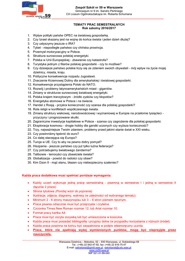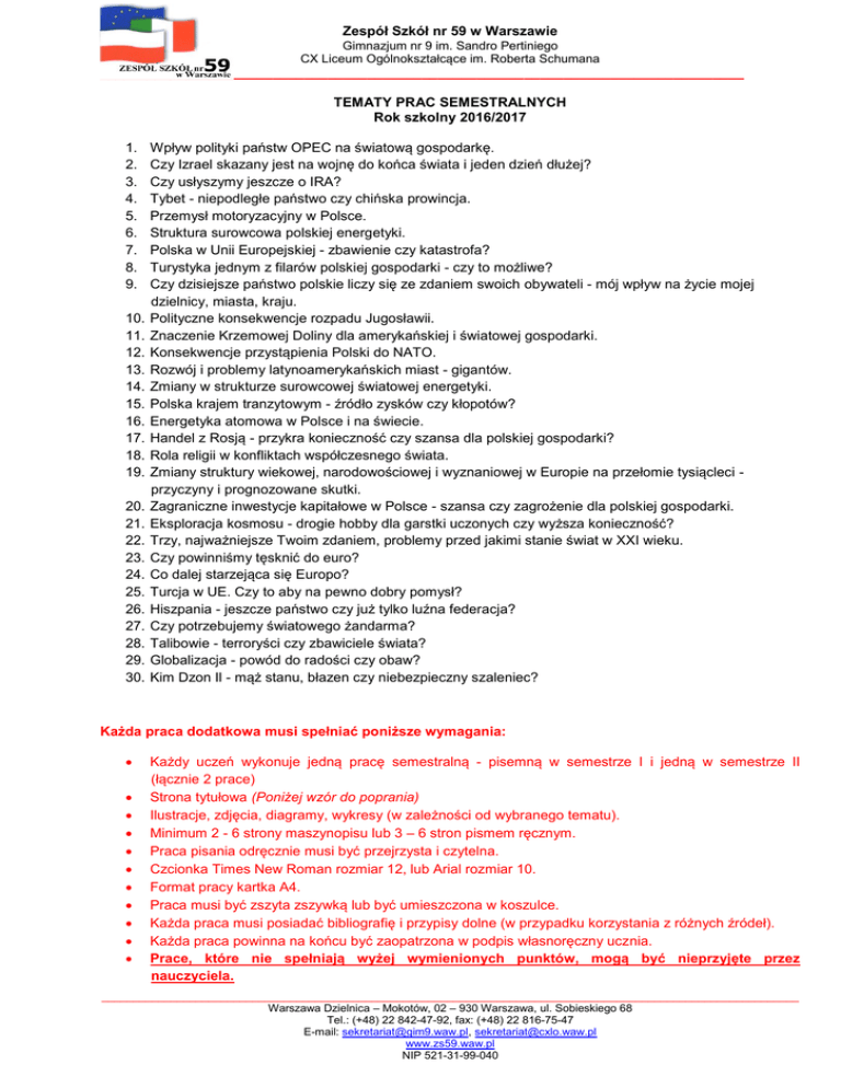 Zespół Szkół nr 59 w Warszawie Gimnazjum nr 9 im. Sandro Pertiniego CX Liceum Ogólnokształcące im. Roberta Schumana __________________________________________________________________________________ TEMATY PRAC SEMESTRALNYCH Rok szkolny 2016/2017 1. 2. 3. 4. 5. 6. 7. 8. 9. 10. 11. 12. 13. 14. 15. 16. 17. 18. 19. 20. 21. 22. 23. 24. 25. 26. 27. 28. 29. 30. Wpływ polityki państw OPEC na światową gospodarkę. Czy Izrael skazany jest na wojnę do końca świata i jeden dzień dłużej? Czy usłyszymy jeszcze o IRA? Tybet - niepodległe państwo czy chińska prowincja. Przemysł motoryzacyjny w Polsce. Struktura surowcowa polskiej energetyki. Polska w Unii Europejskiej - zbawienie czy katastrofa? Turystyka jednym z filarów polskiej gospodarki - czy to możliwe? Czy dzisiejsze państwo polskie liczy się ze zdaniem swoich obywateli - mój wpływ na życie mojej dzielnicy, miasta, kraju. Polityczne konsekwencje rozpadu Jugosławii. Znaczenie Krzemowej Doliny dla amerykańskiej i światowej gospodarki. Konsekwencje przystąpienia Polski do NATO. Rozwój i problemy latynoamerykańskich miast - gigantów. Zmiany w strukturze surowcowej światowej energetyki. Polska krajem tranzytowym - źródło zysków czy kłopotów? Energetyka atomowa w Polsce i na świecie. Handel z Rosją - przykra konieczność czy szansa dla polskiej gospodarki? Rola religii w konfliktach współczesnego świata. Zmiany struktury wiekowej, narodowościowej i wyznaniowej w Europie na przełomie tysiącleci przyczyny i prognozowane skutki. Zagraniczne inwestycje kapitałowe w Polsce - szansa czy zagrożenie dla polskiej gospodarki. Eksploracja kosmosu - drogie hobby dla garstki uczonych czy wyższa konieczność? Trzy, najważniejsze Twoim zdaniem, problemy przed jakimi stanie świat w XXI wieku. Czy powinniśmy tęsknić do euro? Co dalej starzejąca się Europo? Turcja w UE. Czy to aby na pewno dobry pomysł? Hiszpania - jeszcze państwo czy już tylko luźna federacja? Czy potrzebujemy światowego żandarma? Talibowie - terroryści czy zbawiciele świata? Globalizacja - powód do radości czy obaw? Kim Dzon Il - mąż stanu, błazen czy niebezpieczny szaleniec? Każda praca dodatkowa musi spełniać poniższe wymagania: Każdy uczeń wykonuje jedną pracę semestralną - pisemną w semestrze I i jedną w semestrze II (łącznie 2 prace) Strona tytułowa (Poniżej wzór do poprania) Ilustracje, zdjęcia, diagramy, wykresy (w zależności od wybranego tematu). Minimum 2 - 6 strony maszynopisu lub 3 – 6 stron pismem ręcznym. Praca pisania odręcznie musi być przejrzysta i czytelna. Czcionka Times New Roman rozmiar 12, lub Arial rozmiar 10. Format pracy kartka A4. Praca musi być zszyta zszywką lub być umieszczona w koszulce. Każda praca musi posiadać bibliografię i przypisy dolne (w przypadku korzystania z różnych źródeł). Każda praca powinna na końcu być zaopatrzona w podpis własnoręczny ucznia. Prace, które nie spełniają wyżej wymienionych punktów, mogą być nieprzyjęte przez nauczyciela. _______________________________________________________________________________________________________________ Warszawa Dzielnica – Mokotów, 02 – 930 Warszawa, ul. Sobieskiego 68 Tel.: (+48) 22 842-47-92, fax: (+48) 22 816-75-47 E-mail: [email protected], [email protected] www.zs59.waw.pl NIP 521-31-99-040 Zespół Szkół nr 59 w Warszawie Gimnazjum nr 9 im. Sandro Pertiniego CX Liceum Ogólnokształcące im. Roberta Schumana __________________________________________________________________________________ ……………………………………. …………………………………. ……………………………………. data Imię i nazwisko …………… Gimnazjum/Liceum * Klasa ocena z pracy semestralnej ………………………………………………………………………………………………………………………………… ………………………………………………………………………………………………………………………………… …………………………………………………………………………………………………………………………………. Temat pracy …………………..…………………………. podpis nauczyciela *niepotrzebne skreślić _______________________________________________________________________________________________________________ Warszawa Dzielnica – Mokotów, 02 – 930 Warszawa, ul. Sobieskiego 68 Tel.: (+48) 22 842-47-92, fax: (+48) 22 816-75-47 E-mail: [email protected], [email protected] www.zs59.waw.pl NIP 521-31-99-040