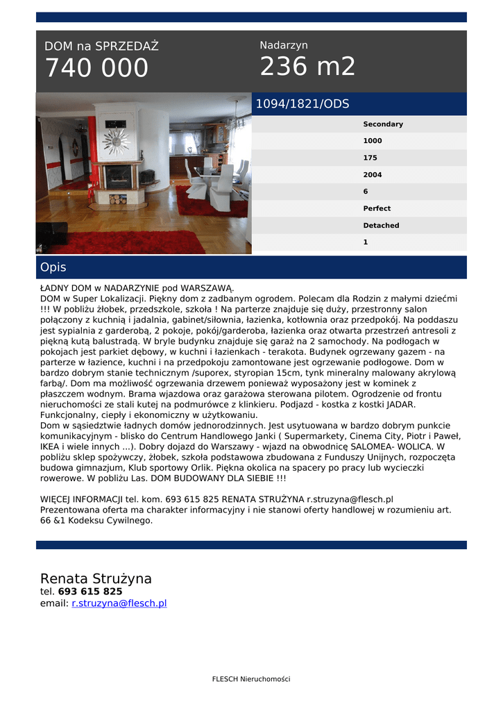 DOM na SPRZEDAŻ 740 000 Nadarzyn 236 m2 1094/1821/ODS Secondary 1000 175 2004 6 Perfect Detached 1 Opis ŁADNY DOM w NADARZYNIE pod WARSZAWĄ. DOM w Super Lokalizacji. Piękny dom z zadbanym ogrodem. Polecam dla Rodzin z małymi dziećmi !!! W pobliżu żłobek, przedszkole, szkoła ! Na parterze znajduje się duży, przestronny salon połączony z kuchnią i jadalnia, gabinet/siłownia, łazienka, kotłownia oraz przedpokój. Na poddaszu jest sypialnia z garderobą, 2 pokoje, pokój/garderoba, łazienka oraz otwarta przestrzeń antresoli z piękną kutą balustradą. W bryle budynku znajduje się garaż na 2 samochody. Na podłogach w pokojach jest parkiet dębowy, w kuchni i łazienkach - terakota. Budynek ogrzewany gazem - na parterze w łazience, kuchni i na przedpokoju zamontowane jest ogrzewanie podłogowe. Dom w bardzo dobrym stanie technicznym /suporex, styropian 15cm, tynk mineralny malowany akrylową farbą/. Dom ma możliwość ogrzewania drzewem ponieważ wyposażony jest w kominek z płaszczem wodnym. Brama wjazdowa oraz garażowa sterowana pilotem. Ogrodzenie od frontu nieruchomości ze stali kutej na podmurówce z klinkieru. Podjazd - kostka z kostki JADAR. Funkcjonalny, ciepły i ekonomiczny w użytkowaniu. Dom w sąsiedztwie ładnych domów jednorodzinnych. Jest usytuowana w bardzo dobrym punkcie komunikacyjnym - blisko do Centrum Handlowego Janki ( Supermarkety, Cinema City, Piotr i Paweł, IKEA i wiele innych ...). Dobry dojazd do Warszawy - wjazd na obwodnicę SALOMEA- WOLICA. W pobliżu sklep spożywczy, żłobek, szkoła podstawowa zbudowana z Funduszy Unijnych, rozpoczęta budowa gimnazjum, Klub sportowy Orlik. Piękna okolica na spacery po pracy lub wycieczki rowerowe. W pobliżu Las. DOM BUDOWANY DLA SIEBIE !!! WIĘCEJ INFORMACJI tel. kom. 693 615 825 RENATA STRUŻYNA [email protected] Prezentowana oferta ma charakter informacyjny i nie stanowi oferty handlowej w rozumieniu art. 66 &1 Kodeksu Cywilnego. Renata Strużyna tel. 693 615 825 email: [email protected] FLESCH Nieruchomości Powered by TCPDF (www.tcpdf.org)