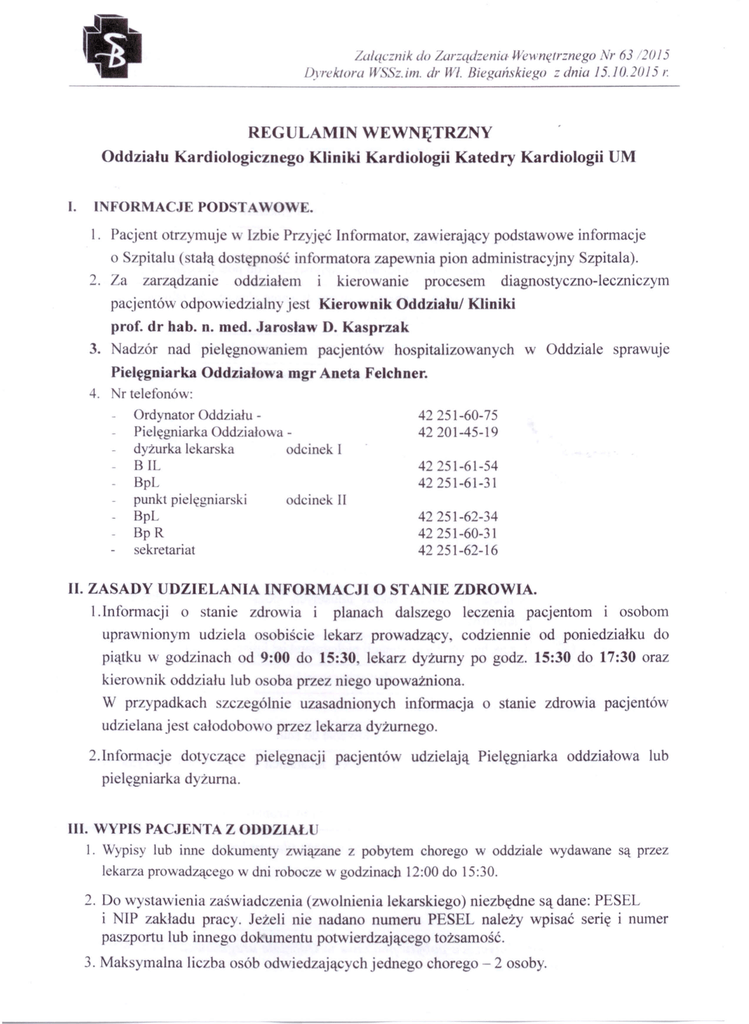 Zalqcznik do Zarzqdzenio Wewnętrznego r 63 /2015 Dyrektora ~ z. im. dr WI. Biegan 'kiego z dnia 15.10.2015 I: REGUŁAMI WEWNĘTRZ Y Oddziału Kardiologicznego Kliniki Kardiologii Katedry Kardiologii UM I. I FORMACJE POD TA O Izbi Prz j l. Pacjent otrz rnuj o zpitalu ( tałą do t pnoś 2. Za zarządzani ć Informator, zawierający podstawowe informacje informatora zap wnia pion administracyjny Szpitala). oddziałem i ki rowanie procesem diagno tyczno-leczniczym pacj ntów odpowi dzialn je t Kierownik Oddziałuj Kliniki prof. dr hab. n. med. Jarosław 3. adzór nad piel gno aniem pacj ntów ho pitalizowanych Pielęgniarka 4. D. Kasprzak Oddziałowa w Oddziale prawuje mgr Aneta Felchner. r telefon' w: Ord nator Oddziału Pielęgniarka Oddział dyżurka lekar ka 42251-60-75 42201-45-19 aodcin k l BIL 42251-61-54 42251-61-31 BpL punkt pi I gniarski BpL Bp R sekretariat H. ZASADY UDZIELANIA I.Informacji o tani odcinek II 42251-62-34 42 251-60-31 42251-62-16 INFORMACJI zdro ia i uprawnion m udzi la o obi' ci piątku O STANIE ZDROWIA. planach dal zego leczenia lekarz prowadzący pacjentom i osobom codziennie od poniedziałku do godzinach od 9:00 do 15:30 lekarz dyżurny po godz. 15:30 do 17:30 oraz ki rownik oddziału lub o oba przez ni go upoważniona. W przypadkach udzielana je 2.1nformacj t zczególni całodobo dot cząc uza adnionych informacja o tanie zdrowia pacjentów o prz z ł karza dyżurnego. pi l gnacji pacj ntó udzielają Pielęgniarka oddziałowa lub pielęgniarka dżuma. III. WYPI PACJE TA Z ODDZIAŁ 1. Wypi lub inn dokum nt lekarza pro adząc g związan dni robocz z pobytem chorego w oddziale wydawane są przez godzinach 12:00 do ) 5:30. 2. Do wy tawi nia zaświadczenia (zwolni nia l kar kiego) niezbędne są dane: PESEL i NIP zakładu prac . J ż li ni nadano numeru PE EL należy wpisać serię i numer pa zportu lub inn go dokumentu p twierdzając go toż amoś ć. 3. Mak maina liczba o ób od iedzając chj dnego chorego - 2 o oby. Zalqcznik do Zarządzenia Wewnętrznego r 63 120/5 1 iyrekrora W. • z. im. dr WI. Biegańskiego z dnia 15.10.20/5 I: IV. ORlE TACYJNY ROZKŁAD D lA W ODDZIALE: Godzin Czynności krwi, Pobi ram -00 _ 7°0 leków dou tn ch, podskórnych podawani dożylnych, waż nie ch r ch, p miar temp ratury i glikemii. 7°0 _ 715 Raport pi I gniar ki 700 _ 700 Dowóz pacj ntó i5 Toal ty pacj ntów, inhaJacj ,przygotowanie _ 815 lekó 81- _ 845 I na badania diagnostyczne do po zczególnych pracowni. - p miar param tró karmieniu, bądź karmienie chorych. Śniadani ,p m pra dzanie drożności wenflonów lub innych wkłuć, 845 - 900 Zmian 930 - 930 Przyg to ani pacj ntó 93°_ 12°0 1200 _ 1230 chorych do zabiegów, podawanie patrunków, inhalacj Obchod l lekar ki . W dawani pra dzani izyt. al do zleceń lekarskich. i r alizacja zleceń. 1230 _ 13°0 Obiad, poda ani l kó 1400 _ 1630 Realizacja planu diagno tyczn go i leczniczego. 1630 - 1700 Pomiar t mp ratur ciała i param trów ż ciowych. 17°° - 1800 Kolacja, p dawani 18°0 _ 1830 Uzup lniani 1830 - 191- Opi ka nad chorymi, zdawanie raportów. 1730 _ 2030 Obchod 1930 _ 2030 ToaJ t pacj ntó 1930 _ 7 ° lekó doustnych. dou tnych, podskórnych dożylnych, karmienie pacjentó dokum ntacji piel gniar kiej i pisanie raportów. 1 kar ki prz gotowani do snu. D żur no n , r alizacja zł ceń lekarskich I opieka nad chorymi, obchody pi I gniar ki . 1930 _ 24°° Poda am lekó Uwaga! Podan dożyln h i wlewów kroplowych. rozkład dnia w Oddziale może ulec zmianie. Szczegółowe za ady dotyczące pobytu pacjenta w Oddziale uregulowane są w Regulaminie organizacyjnym Szpitala.