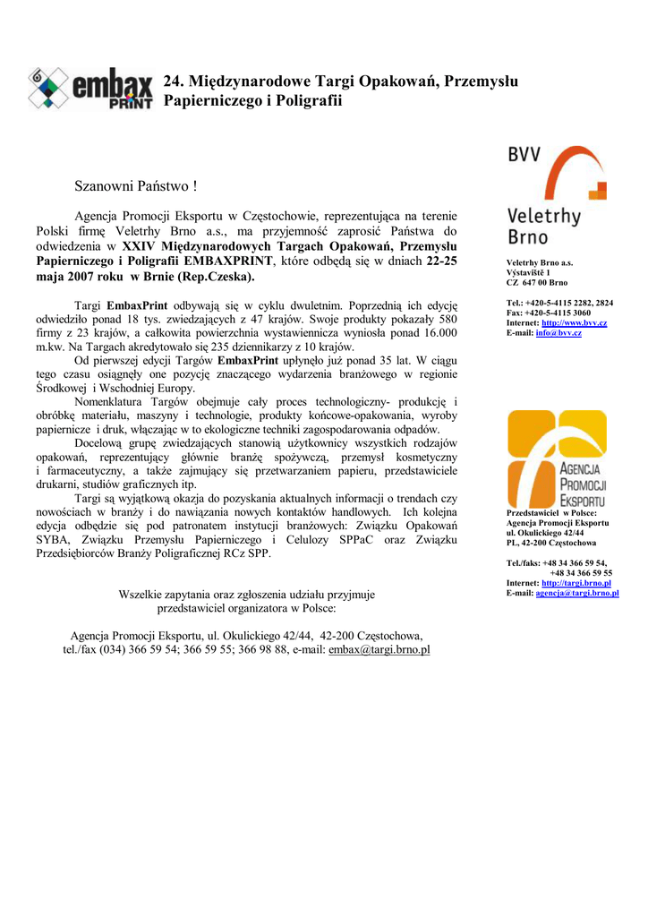 24. Międzynarodowe Targi Opakowań, Przemysłu Papierniczego i Poligrafii Szanowni Państwo ! Agencja Promocji Eksportu w Częstochowie, reprezentująca na terenie Polski firmę Veletrhy Brno a.s., ma przyjemność zaprosić Państwa do odwiedzenia w XXIV Międzynarodowych Targach Opakowań, Przemysłu Papierniczego i Poligrafii EMBAXPRINT, które odbędą się w dniach 22-25 maja 2007 roku w Brnie (Rep.Czeska). Targi EmbaxPrint odbywają się w cyklu dwuletnim. Poprzednią ich edycję odwiedziło ponad 18 tys. zwiedzających z 47 krajów. Swoje produkty pokazały 580 firmy z 23 krajów, a całkowita powierzchnia wystawiennicza wyniosła ponad 16.000 m.kw. Na Targach akredytowało się 235 dziennikarzy z 10 krajów. Od pierwszej edycji Targów EmbaxPrint upłynęło już ponad 35 lat. W ciągu tego czasu osiągnęły one pozycję znaczącego wydarzenia branżowego w regionie Środkowej i Wschodniej Europy. Nomenklatura Targów obejmuje cały proces technologiczny- produkcję i obróbkę materiału, maszyny i technologie, produkty końcowe-opakowania, wyroby papiernicze i druk, włączając w to ekologiczne techniki zagospodarowania odpadów. Docelową grupę zwiedzających stanowią użytkownicy wszystkich rodzajów opakowań, reprezentujący głównie branżę spożywczą, przemysł kosmetyczny i farmaceutyczny, a także zajmujący się przetwarzaniem papieru, przedstawiciele drukarni, studiów graficznych itp. Targi są wyjątkową okazja do pozyskania aktualnych informacji o trendach czy nowościach w branży i do nawiązania nowych kontaktów handlowych. Ich kolejna edycja odbędzie się pod patronatem instytucji branżowych: Związku Opakowań SYBA, Związku Przemysłu Papierniczego i Celulozy SPPaC oraz Związku Przedsiębiorców Branży Poligraficznej RCz SPP. Wszelkie zapytania oraz zgłoszenia udziału przyjmuje przedstawiciel organizatora w Polsce: Agencja Promocji Eksportu, ul. Okulickiego 42/44, 42-200 Częstochowa, tel./fax (034) 366 59 54; 366 59 55; 366 98 88, e-mail: [email protected] Veletrhy Brno a.s. Výstaviště 1 CZ 647 00 Brno Tel.: +420-5-4115 2282, 2824 Fax: +420-5-4115 3060 Internet: http://www.bvv.cz E-mail: [email protected] Przedstawiciel w Polsce: Agencja Promocji Eksportu ul. Okulickiego 42/44 PL, 42-200 Częstochowa Tel./faks: +48 34 366 59 54, +48 34 366 59 55 Internet: http://targi.brno.pl E-mail: [email protected]