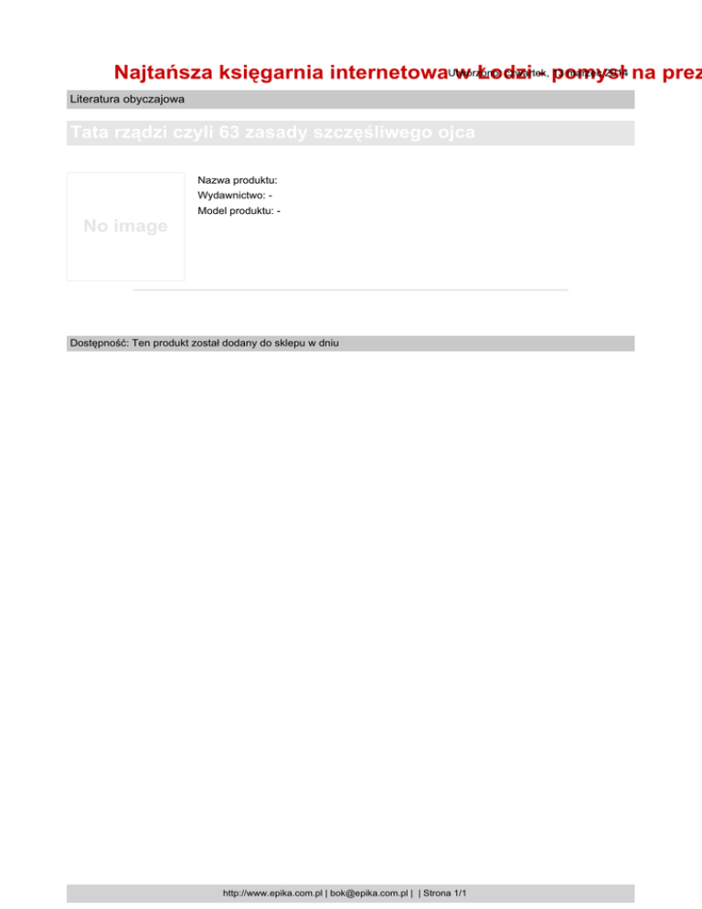 czwartek, 13 marzec 2014 na prez Najtańsza księgarnia internetowaUtworzono: w Łodzi - pomysł Literatura obyczajowa Tata rządzi czyli 63 zasady szczęśliwego ojca Nazwa produktu: Wydawnictwo: Model produktu: - No image Dostępność: Ten produkt został dodany do sklepu w dniu http://www.epika.com.pl | [email protected] | | Strona 1/1
