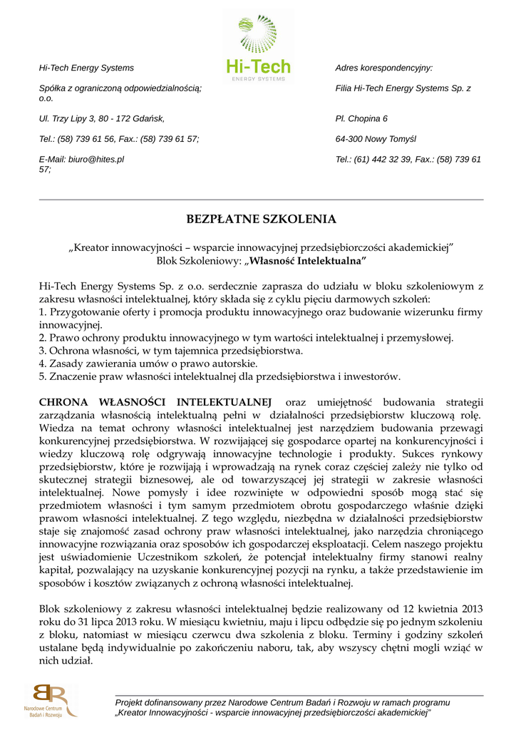 Hi-Tech Energy Systems Adres korespondencyjny: Spółka z ograniczoną odpowiedzialnością; o.o. Filia Hi-Tech Energy Systems Sp. z Ul. Trzy Lipy 3, 80 - 172 Gdańsk, Pl. Chopina 6 Tel.: (58) 739 61 56, Fax.: (58) 739 61 57; 64-300 Nowy Tomyśl E-Mail: [email protected] 57; Tel.: (61) 442 32 39, Fax.: (58) 739 61 BEZPŁATNE SZKOLENIA „Kreator innowacyjności – wsparcie innowacyjnej przedsiębiorczości akademickiej” Blok Szkoleniowy: „Własność Intelektualna” Hi-Tech Energy Systems Sp. z o.o. serdecznie zaprasza do udziału w bloku szkoleniowym z zakresu własności intelektualnej, który składa się z cyklu pięciu darmowych szkoleń: 1. Przygotowanie oferty i promocja produktu innowacyjnego oraz budowanie wizerunku firmy innowacyjnej. 2. Prawo ochrony produktu innowacyjnego w tym wartości intelektualnej i przemysłowej. 3. Ochrona własności, w tym tajemnica przedsiębiorstwa. 4. Zasady zawierania umów o prawo autorskie. 5. Znaczenie praw własności intelektualnej dla przedsiębiorstwa i inwestorów. CHRONA WŁASNOŚCI INTELEKTUALNEJ oraz umiejętność budowania strategii zarządzania własnością intelektualną pełni w działalności przedsiębiorstw kluczową rolę. Wiedza na temat ochrony własności intelektualnej jest narzędziem budowania przewagi konkurencyjnej przedsiębiorstwa. W rozwijającej się gospodarce opartej na konkurencyjności i wiedzy kluczową rolę odgrywają innowacyjne technologie i produkty. Sukces rynkowy przedsiębiorstw, które je rozwijają i wprowadzają na rynek coraz częściej zależy nie tylko od skutecznej strategii biznesowej, ale od towarzyszącej jej strategii w zakresie własności intelektualnej. Nowe pomysły i idee rozwinięte w odpowiedni sposób mogą stać się przedmiotem własności i tym samym przedmiotem obrotu gospodarczego właśnie dzięki prawom własności intelektualnej. Z tego względu, niezbędna w działalności przedsiębiorstw staje się znajomość zasad ochrony praw własności intelektualnej, jako narzędzia chroniącego innowacyjne rozwiązania oraz sposobów ich gospodarczej eksploatacji. Celem naszego projektu jest uświadomienie Uczestnikom szkoleń, że potencjał intelektualny firmy stanowi realny kapitał, pozwalający na uzyskanie konkurencyjnej pozycji na rynku, a także przedstawienie im sposobów i kosztów związanych z ochroną własności intelektualnej. Blok szkoleniowy z zakresu własności intelektualnej będzie realizowany od 12 kwietnia 2013 roku do 31 lipca 2013 roku. W miesiącu kwietniu, maju i lipcu odbędzie się po jednym szkoleniu z bloku, natomiast w miesiącu czerwcu dwa szkolenia z bloku. Terminy i godziny szkoleń ustalane będą indywidualnie po zakończeniu naboru, tak, aby wszyscy chętni mogli wziąć w nich udział. Projekt dofinansowany przez Narodowe Centrum Badań i Rozwoju w ramach programu „Kreator Innowacyjności - wsparcie innowacyjnej przedsiębiorczości akademickiej” Hi-Tech Energy Systems Adres korespondencyjny: Spółka z ograniczoną odpowiedzialnością; o.o. Filia Hi-Tech Energy Systems Sp. z Ul. Trzy Lipy 3, 80 - 172 Gdańsk, Pl. Chopina 6 Tel.: (58) 739 61 56, Fax.: (58) 739 61 57; 64-300 Nowy Tomyśl E-Mail: [email protected] 57; Tel.: (61) 442 32 39, Fax.: (58) 739 61 Do udziału w bloku szkoleniowym z zakresu własności intelektualnej zapraszamy uczniów szkół średnich, studentów, absolwentów szkół średnich, absolwentów uczelni wyższych, pracowników naukowych, przedstawicieli mikro, małych, średnich i dużych przedsiębiorstw oraz pozostałe osoby zainteresowane tematyką ochrony własności intelektualnej. Osoby i firmy zainteresowane udziałem w projekcie proszone są o przesłanie formularza zgłoszeniowego do dnia 11 kwietnia 2013 r. na adres [email protected] lub o osobiste zgłoszenie się do naszego biura: Udział w szkoleniu jest bezpłatny. Liczba miejsc ograniczona, decyduje kolejność zgłoszeń! Filia Hi-Tech Energy Systems Sp. z o.o. Plac Chopina 6/II piętro 64-300 Nowy Tomyśl Osoba kontaktowa: Iwona Pińkowska (tel.: (61) 44 23 239, tel. kom. +48 605 351 638, e-mail: [email protected]) 2