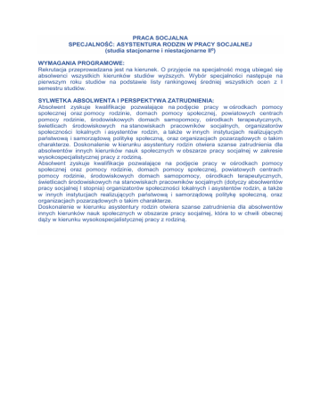 PRACA SOCJALNA SPECJALNOŚĆ: ASYSTENTURA RODZIN W PRACY SOCJALNEJ (studia stacjonarne i niestacjonarne II⁰) WYMAGANIA PROGRAMOWE: Rekrutacja przeprowadzana jest na kierunek. O przyjęcie na specjalność mogą ubiegać się absolwenci wszystkich kierunków studiów wyższych. Wybór specjalności następuje na pierwszym roku studiów na podstawie listy rankingowej średniej wszystkich ocen z I semestru studiów. SYLWETKA ABSOLWENTA I PERSPEKTYWA ZATRUDNIENIA: Absolwent zyskuje kwalifikacje pozwalające na podjęcie pracy w ośrodkach pomocy społecznej oraz pomocy rodzinie, domach pomocy społecznej, powiatowych centrach pomocy rodzinie, środowiskowych domach samopomocy, ośrodkach terapeutycznych, świetlicach środowiskowych na stanowiskach pracowników socjalnych, organizatorów społeczności lokalnych i asystentów rodzin, a także w innych instytucjach realizujących państwową i samorządową politykę społeczną, oraz organizacjach pozarządowych o takim charakterze. Doskonalenie w kierunku asystentury rodzin otwiera szanse zatrudnienia dla absolwentów innych kierunków nauk społecznych w obszarze pracy socjalnej w zakresie wysokospecjalistycznej pracy z rodziną. Absolwent zyskuje kwalifikacje pozwalające na podjęcie pracy w ośrodkach pomocy społecznej oraz pomocy rodzinie, domach pomocy społecznej, powiatowych centrach pomocy rodzinie, środowiskowych domach samopomocy, ośrodkach terapeutycznych, świetlicach środowiskowych na stanowiskach pracowników socjalnych (dotyczy absolwentów pracy socjalnej I stopnia) organizatorów społeczności lokalnych i asystentów rodzin, a także w innych instytucjach realizujących państwową i samorządową politykę społeczną, oraz organizacjach pozarządowych o takim charakterze. Doskonalenie w kierunku asystentury rodzin otwiera szanse zatrudnienia dla absolwentów innych kierunków nauk społecznych w obszarze pracy socjalnej, która to w chwili obecnej dąży w kierunku wysokospecjalistycznej pracy z rodziną.