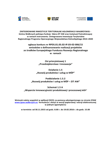 ZINTEGROWANE INWESTYCJE TERYTORIALNE AGLOMERACJI WAŁBRZYSKIEJ Gmina Wałbrzych pełniąca funkcje lidera ZIT AW oraz Instytucji Pośredniczącej w ramach instrumentu Zintegrowane Inwestycje Terytorialne Regionalnego Programu Operacyjnego Województwa Dolnośląskiego 2014–2020 ogłasza konkurs nr RPDS.01.05.02-IP.03-02-006/15 wniosków o dofinansowanie realizacji projektów ze środków Europejskiego Funduszu Rozwoju Regionalnego w ramach Osi priorytetowej 1 „Przedsiębiorstwa i innowacje” Działanie 1.5 „Rozwój produktów i usług w MŚP” Poddziałanie 1.5.2 „Rozwój produktów i usług w MŚP – ZIT AW” Schemat 1.5 A „Wsparcie innowacyjności produktowej i procesowej MŚP” Wniosek należy wypełnić w aplikacji EXCEL za pomocą udostępnionego na stronie IPAW www.ipaw.walbrzych.eu formularza i złożyć w wersji papierowej i wersji elektronicznej w jednym egzemplarzu w terminie: od 30.11.2015 od godz. 8.00 r. do 19.02.2016 r. do godz. 15.00 I. Rodzaj projektów podlegających dofinansowaniu W ramach konkursu dofinansowanie mogą otrzymać projekty wspierające innowacyjność produktową i procesową polegającą np. na: wprowadzeniu na rynek nowych lub ulepszonych produktów/usług; dokonaniu zasadniczych zmian procesu produkcyjnego lub sposobu świadczenia usług. Innowacja produktowa oznacza wprowadzenie na rynek przez dane przedsiębiorstwo nowego towaru lub usługi lub znaczące ulepszenie oferowanych uprzednio towarów i usług w odniesieniu do ich charakterystyk lub przeznaczenia. Innowacja procesowa oznacza wprowadzenie do praktyki w przedsiębiorstwie nowych lub znacząco ulepszonych metod produkcji lub dostawy; W ramach powyższych kierunków wsparcia, możliwe będzie także dofinansowanie inwestycji prowadzących do zmniejszenia szkodliwego oddziaływania na środowisko, np. ograniczające materiało-,wodochłonność procesu produkcyjnego oraz wprowadzania nowoczesnych rozwiązań (technologii) dotyczących przeciwdziałaniu zmianom klimatu (np. rozwój zeroemisyjnych i niskoemisyjnych technologii), co w konsekwencji zapewni ograniczenie negatywnych skutków środowiskowych (z wyłączeniem wprowadzania technologii mających na celu zwiększenie efektywności energetycznej w przedsiębiorstwie). Preferencje uzyskają projekty: • realizowane w ramach inteligentnych specjalizacji regionu • wnoszące większy niż wymagany minimalny wkład własny Pomoc będzie przyznawana dla mikro, małych, średnich przedsiębiorstw na dowolną formę inwestycji początkowej. Wsparcie udzielone zostanie zgodnie z Rozporządzenie Ministra Infrastruktury i Rozwoju z dnia 3 września 2015 r. w sprawie udzielania regionalnej pomocy inwestycyjnej w ramach celu tematycznego 3 w zakresie wzmacniania konkurencyjności mikroprzedsiębiorców, małych i średnich przedsiębiorców w ramach regionalnych programów operacyjnych na lata 2014–2020 (Dz. U. 2015.1377) oraz Rozporządzeniem Ministra Infrastruktury i Rozwoju z dnia 19 marca 2015 r. w sprawie udzielania pomocy de minimis w ramach regionalnych programów operacyjnych na lata 2014-2020 (Dz. U. poz. 488). II. Rodzaj podmiotów, które mogą ubiegać się o dofinansowanie Wsparcie udzielane będzie mikro, małym, średnim1 Beneficjentom, którzy prowadzą działalność gospodarczą na terenie Gmin wchodzących w obszar Aglomeracji Wałbrzyskiej lub zamierzają realizować projekt/inwestycję na terenie Gmin wchodzących w obszar Aglomeracji Wałbrzyskiej określony w Strategii ZIT. 1 W treści ogłoszenia mikro, małe oraz średnie przedsiębiorstwa określane są skrótem MŚP. MŚP muszą spełniać warunki określone w Załączniku nr 1 do rozporządzenia Komisji UE Nr 651/2014 r. uznającego niektóre rodzaje pomocy za zgodne z rynkiem wewnętrznym w zastosowaniu art. 107 i 108 Traktatu. III. Środki przeznaczone na dofinansowanie projektów Kwota przeznaczona na dofinansowanie projektów w ogłoszonym naborze (alokacja) wynosi równowartość 10.575.000 EUR. Po przeliczeniu wg kursu 1 EUR = 4,2405 PLN (kurs według Europejskiego Banku Centralnego z przedostatniego dnia roboczego miesiąca poprzedzającego miesiąc ogłoszenia tj. z dnia 28.08.2015r.) alokacja w PLN wynosi 44.843.288 PLN. Beneficjenci chcący realizować projekty, w momencie aplikowania o środki muszą dokonać wyboru czy chcą korzystać z puli środków przeznaczonych na konkurs ogłaszany przez ZIT AW (w przypadku realizacji projektu na obszarze Zintegrowanych Inwestycji Terytorialnych Aglomeracji Wałbrzyskiej) czy z puli środków przeznaczonych na konkurs horyzontalny ogłaszany przez Dolnośląską Instytucję Pośredniczącą. IV. Zasady finansowania projektu Minimalna wartość wydatków kwalifikowalnych wynosi 100 000 PLN. Maksymalna wartość wydatków kwalifikowalnych wynosi 9 000 000 PLN. V. Poziom dofinansowania projektów Poziom dofinansowania dla poszczególnych beneficjentów: dla mikro i małych przedsiębiorców – do 45% wydatków kwalifikujących się do objęcia wsparciem; dla średnich przedsiębiorców – do 35% wydatków kwalifikujących się do objęcia wsparciem; Beneficjent pomocy musi wnieść wkład finansowy w wysokości co najmniej 25 % kosztów kwalifikowalnych, pochodzący ze środków własnych lub zewnętrznych źródeł finansowania, w postaci wolnej od wszelkiego publicznego wsparcia finansowego. VI. Okres realizacji projektu Rozpoczęcie realizacji projektu może nastąpić najwcześniej po złożeniu wniosku o dofinansowanie. Powyższa reguła nie dotyczy zakupu gruntów ani prac przygotowawczych, takich jak uzyskanie zezwoleń i przeprowadzenie studiów wykonalności, których okres kwalifikowalności rozpoczyna się od 1 stycznia 2014r. Rozpoczęcie projektu, z zastrzeżeniem ww. wydatków w terminie wcześniejszym niż po zarejestrowaniu wniosku o dofinansowanie powoduje jego odrzucenie (negatywną ocenę). Wniosek Beneficjenta o płatność końcową musi zostać złożony do IPAW nie później niż d