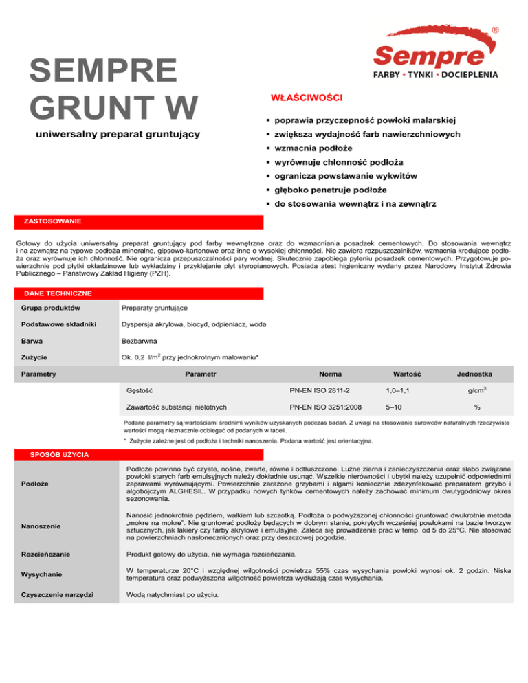 SEMPRE GRUNT W uniwersalny preparat gruntujący WŁAŚCIWOŚCI poprawia przyczepność powłoki malarskiej zwiększa wydajność farb nawierzchniowych wzmacnia podłoże wyrównuje chłonność podłoża ogranicza powstawanie wykwitów głęboko penetruje podłoże do stosowania wewnątrz i na zewnątrz ZASTOSOWANIE Gotowy do użycia uniwersalny preparat gruntujący pod farby wewnętrzne oraz do wzmacniania posadzek cementowych. Do stosowania wewnątrz i na zewnątrz na typowe podłoża mineralne, gipsowo-kartonowe oraz inne o wysokiej chłonności. Nie zawiera rozpuszczalników, wzmacnia kredujące podłoża oraz wyrównuje ich chłonność. Nie ogranicza przepuszczalności pary wodnej. Skutecznie zapobiega pyleniu posadzek cementowych. Przygotowuje powierzchnie pod płytki okładzinowe lub wykładziny i przyklejanie płyt styropianowych. Posiada atest higieniczny wydany przez Narodowy Instytut Zdrowia Publicznego – Państwowy Zakład Higieny (PZH). DANE TECHNICZNE Grupa produktów Preparaty gruntujące Podstawowe składniki Dyspersja akrylowa, biocyd, odpieniacz, woda Barwa Bezbarwna Zużycie Ok. 0,2 l/m2 przy jednokrotnym malowaniu* Parametry Parametr Norma Wartość Gęstość PN-EN ISO 2811-2 1,0–1,1 Zawartość substancji nielotnych PN-EN ISO 3251:2008 5–10 Jednostka g/cm3 % Podane parametry są wartościami średnimi wyników uzyskanych podczas badań. Z uwagi na stosowanie surowców naturalnych rzeczywiste wartości mogą nieznacznie odbiegać od podanych w tabeli. * Zużycie zależne jest od podłoża i techniki nanoszenia. Podana wartość jest orientacyjna. SPOSÓB UŻYCIA Podłoże Podłoże powinno być czyste, nośne, zwarte, równe i odtłuszczone. Luźne ziarna i zanieczyszczenia oraz słabo związane powłoki starych farb emulsyjnych należy dokładnie usunąć. Wszelkie nierówności i ubytki należy uzupełnić odpowiednimi zaprawami wyrównującymi. Powierzchnie zarażone grzybami i algami koniecznie zdezynfekować preparatem grzybo i algobójczym ALGHESIL. W przypadku nowych tynków cementowych należy zachować minimum dwutygodniowy okres sezonowania. Nanoszenie Nanosić jednokrotnie pędzlem, wałkiem lub szczotką. Podłoża o podwyższonej chłonności gruntować dwukrotnie metoda „mokre na mokre”. Nie gruntować podłoży będących w dobrym stanie, pokrytych wcześniej powłokami na bazie tworzyw sztucznych, jak lakiery czy farby akrylowe i emulsyjne. Zaleca się prowadzenie prac w temp. od 5 do 25°C. Nie stosować na powierzchniach nasłonecznionych oraz przy deszczowej pogodzie. Rozcieńczanie Produkt gotowy do użycia, nie wymaga rozcieńczania. Wysychanie W temperaturze 20°C i względnej wilgotności powietrza 55% czas wysychania powłoki wynosi ok. 2 godzin. Niska temperatura oraz podwyższona wilgotność powietrza wydłużają czas wysychania. Czyszczenie narzędzi Wodą natychmiast po użyciu. KARTA TECHNICZNA – SEMPRE GRUNT W data aktualizacji: 05.11.2014 OPAKOWANIE 1, 5, 10 litrów PRZECHOWYWANIE Przechowywać w pomieszczeniu chłodnym, lecz chronionym przed mrozem, w oryginalnym, zamkniętym opakowaniu. Po przemrożeniu produkt nie nadaje się do użycia. Data ważności znajduje się na opakowaniu. BHP/PPOŻ Chronić przed dziećmi. Wyrób niepalny. W obowiązującym prawie nie jest klasyfikowany jako niebezpieczny. Podczas pracy zachowywać podstawowe zasady BHP. W przypadku kontaktu produktu z oczami należy przemyć je dużą ilością wody, a następnie zasięgnąć porady lekarskiej. Używać zgodnie z przeznaczeniem. Producent gwarantuje jakość wyrobu, lecz nie ma wpływu na sposób jego zastosowania. Podstawą zamieszczonych tu informacji jest wiedza producenta, wynikającą z długoletnich obserwacji praktycznych zastosowań. Nie mogą one jednak zastąpić fachowego przygotowania wykonawcy i nie zwalniają go ze stosowania się do zasad sztuki budowlanej i przepisów BHP, stąd nie stanowią podstawy do rozstrzygania sporów na drodze sądowej. W przypadku pytań lub wątpliwości prosimy o kontakt z producentem.