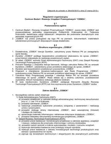 Załącznik do uchwały nr 39/o/03/3015 z dnia 27 marca 2015 r. Regulamin organizacyjny Centrum Badań i Rozwoju Urządzeń Przemysłowych “CEBEA”, §1 Postanowienia ogólne 1. Centrum Badań i Rozwoju Urządzeń Przemysłowych “CEBEA”, zwane dalej „CEBEA” jest pozawydziałową jednostką organizacyjną Politechniki Krakowskiej im. Tadeusza Kościuszki, świadczącą usługi badawcze i eksperckie dla podmiotów zewnętrznych oraz jednostek organizacyjnych PK. 2. „CEBEA” ma prawo posługiwać się logo PK na pismach, dokumentach, materiałach szkoleniowo-promocyjnych dotyczących swojej działalności. §2 Struktura organizacyjna „CEBEA” 1. Działalnością „CEBEA” kieruje Dyrektor, zatrudniony przez Rektora PK po zasięgnięciu opinii Senatu. 2. Dyrektor „CEBEA” podlega bezpośrednio prorektorowi właściwemu do spraw „CEBEA”, przed którym odpowiada za realizację powierzonych zadań. 3. W skład „CEBEA” wchodzi Dział Administracyjno-Techniczny (DAT) oraz Zespół Rozwoju Technologii Przemysłowych (RTP). 4. Pracami każdego z Zespołów kieruje kierownik, którego zatrudnia Rektor PK na wniosek Dyrektora „CEBEA”, zatwierdzony przez prorektora właściwego do spraw „CEBEA”. 5. Dyrektor jest bezpośrednim przełożonym pracowników „CEBEA”. 6. Organem o charakterze doradczo-nadzorującym jest Rada Programowa „CEBEA”, powoływana przez Rektora PK na wniosek prorektora właściwego do spraw „CEBEA”. 7. Członków Rady Programowej powołuje i odwołuje Rektor PK na wniosek prorektora właściwego do spraw „CEBEA”. Rada składa się z siedmiu członków, przedstawicieli wydziałów, których kandydatury wskazują właściwi dziekani. 8. W razie nieobecności, Dyrektora „CEBEA” zastępuje Kierownik Zespołu Rozwoju Technologii Przemysłowych (RTP) lub inna wyznaczona przez Dyrektora „CEBEA” osoba. §3 Zakres działania „CEBEA” 1. Szczegółowy zakres zadań obejmuje: 1) Dział Administracyjno-Techniczny (DAT): a) prowadzi działalność w zakresie obsługi administracyjnej i technicznej nieruchomości przy ul. J. Lea 114 w Krakowie, b) prowadzi sekretariat „CEBEA”, c) nadzoruje prawidłowe wykonanie procedury związanej z zawieraniem i realizacją umów z przemysłem, d) prowadzi obsługę strony internetowej „CEBEA”, sieci wewnętrznej (Intranet) i dostępu do Internetu, e) opracowuje materiały informacyjne i reklamowe dotyczące działalności „CEBEA”, f) prowadzi bibliotekę dokumentacji konstrukcyjno-projektowej „CEBEA”. 2) Zespół Rozwoju Technologii Przemysłowych (RTP): a) prowadzi prace badawcze i konstrukcyjno-projektowe w zakresie aparatury, urządzeń i maszyn, zwłaszcza dla przemysłu chemicznego i ochrony środowiska, b) prowadzi nadzór autorski w trakcie wykonawstwa, montażu i rozruchu urządzeń, c) wykonuje stanowiska badawcze oraz prototypy nowych wyrobów, d) realizuje prace badawcze z zakresu innowacyjnych technologii produkcyjnych oraz wdraża i upowszechnia ich wyniki, e) zajmuje się doradztwem technicznym i ekspertyzami dla zewnętrznych podmiotów gospodarczych, f) udziela informacji odnośnie ofert sprzedaży i warunków handlowych dla oferowanych wyrobów i usług, g) prowadzi działalność w zakresie ograniczania hałasu, h) prowadzi prace badawcze z zakresu badań niszczących materiałów konstrukcyjnych i ich połączeń spawanych wg norm i przepisów europejskich i amerykańskich, w tym certyfikowane badanie udarności wg ASTM E 23, i) zajmuje się doborem tworzyw i ich zamienników dla urządzeń przemysłowych, w szczególności aparatury chemicznej, j) przygotowuje dokumentację zgodnie z zasadami zawierania i realizacji umów z przemysłem, j) współpracuje z innymi ośrodkami badawczymi w zakresie prowadzonych prac badawczych i wykonywanych pomiarów. 2. Dyrektor „CEBEA” może zlecić poszczególnym Zespołom wykonywanie również innych zadań. 3. „CEBEA” wykonuje także inne zadania zlecane przez władze Politechniki Krakowskiej. §4 Zakres działania Rady Programowej „CEBEA” 1. Pracą Rady Programowej „CEBEA” kieruje Przewodniczący Rady wybierany przez Radę. 2. Posiedzenia Rady zwołuje Przewodniczący Rady. W sprawach wyjątkowych Rada może odbyć posiedzenie na wniosek członka Rady lub Dyrektora „CEBEA”. 3. Rada Programowa zbiera się minimum raz w ciągu roku. 4. Rada „CEBEA” składa się z przedstawicieli wydziałów PK. W posiedzeniach Rady może uczestniczyć z głosem doradczym Dyrektor „CEBEA” lub prorektor właściwy ds. „CEBEA”. 5. Kadencja Rady „CEBEA” trwa przez okres kadencji organów jednoosobowych i kolegialnych PK. 6. Do zadań Rady Programowej „CEBEA” należy: 1) opiniowanie działalności „CEBEA”, 2) nadzór nad działalnością „CEBEA”, 3) zatwierdzanie corocznego sprawozdania Dyrektora „CEBEA” z realizacji zadań „CEBEA”, 4) przedkładanie Rektorowi PK przyjętego sprawozdania z realizacji zadań „CEBEA”, 5) rozpatrywanie wniosków zgłoszonych przez Dyrektora „CEBEA” i przedstawicieli Rady. §5 Zakres obowiązków i odpowiedzialności Dyrektora „CEBEA” Dyrektor reprezentuje „CEBEA” na zewnątrz i kieruje całokształtem jego działalności, zgodnie z zakresem obowiązków i uprawnień, a w szczególności: 1) zapewnia prawidłowe funkcjonowanie „CEBEA”, 2) koordynuje współpracę z innymi jednostkami PK w zakresie działalności „CEBEA”, 3) odpowiada za przestrzeganie przez „CEBEA” przepisów prawa, w tym prawa wewnętrznego na PK, 4) nadzoruje i kontroluje działania pracowników zatrudnionych w „CEBEA”, 5) zleca Zespołom DAT i RTP dodatkowe zadania, nieokreślone niniejszym regulaminem, 6) przygotowuje roczne sprawozdania z działalności „CEBEA”, 7) inicjuje realizację nowych projektów zbieżnych z zadaniami „CEBEA”. §6 Gospodarka majątkowo-finansowa „CEBEA” 1. Gospodarka majątkowa „CEBEA” prowadzona jest zgodnie z ogólnie