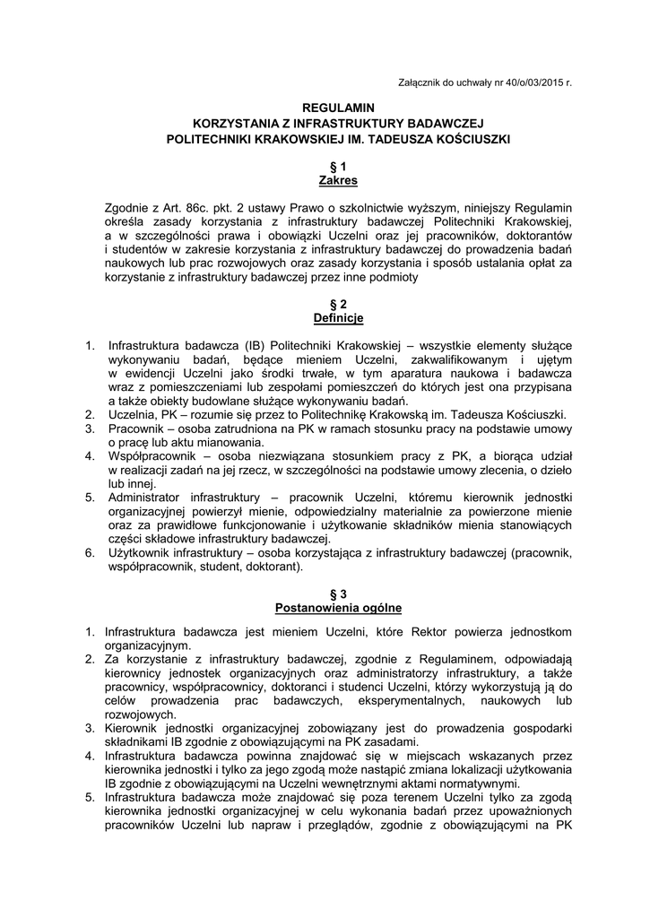 Załącznik do uchwały nr 40/o/03/2015 r. REGULAMIN KORZYSTANIA Z INFRASTRUKTURY BADAWCZEJ POLITECHNIKI KRAKOWSKIEJ IM. TADEUSZA KOŚCIUSZKI §1 Zakres Zgodnie z Art. 86c. pkt. 2 ustawy Prawo o szkolnictwie wyższym, niniejszy Regulamin określa zasady korzystania z infrastruktury badawczej Politechniki Krakowskiej, a w szczególności prawa i obowiązki Uczelni oraz jej pracowników, doktorantów i studentów w zakresie korzystania z infrastruktury badawczej do prowadzenia badań naukowych lub prac rozwojowych oraz zasady korzystania i sposób ustalania opłat za korzystanie z infrastruktury badawczej przez inne podmioty §2 Definicje 1. 2. 3. 4. 5. 6. Infrastruktura badawcza (IB) Politechniki Krakowskiej – wszystkie elementy służące wykonywaniu badań, będące mieniem Uczelni, zakwalifikowanym i ujętym w ewidencji Uczelni jako środki trwałe, w tym aparatura naukowa i badawcza wraz z pomieszczeniami lub zespołami pomieszczeń do których jest ona przypisana a także obiekty budowlane służące wykonywaniu badań. Uczelnia, PK – rozumie się przez to Politechnikę Krakowską im. Tadeusza Kościuszki. Pracownik – osoba zatrudniona na PK w ramach stosunku pracy na podstawie umowy o pracę lub aktu mianowania. Współpracownik – osoba niezwiązana stosunkiem pracy z PK, a biorąca udział w realizacji zadań na jej rzecz, w szczególności na podstawie umowy zlecenia, o dzieło lub innej. Administrator infrastruktury – pracownik Uczelni, któremu kierownik jednostki organizacyjnej powierzył mienie, odpowiedzialny materialnie za powierzone mienie oraz za prawidłowe funkcjonowanie i użytkowanie składników mienia stanowiących części składowe infrastruktury badawczej. Użytkownik infrastruktury – osoba korzystająca z infrastruktury badawczej (pracownik, współpracownik, student, doktorant). §3 Postanowienia ogólne 1. Infrastruktura badawcza jest mieniem Uczelni, które Rektor powierza jednostkom organizacyjnym. 2. Za korzystanie z infrastruktury badawczej, zgodnie z Regulaminem, odpowiadają kierownicy jednostek organizacyjnych oraz administratorzy infrastruktury, a także pracownicy, współpracownicy, doktoranci i studenci Uczelni, którzy wykorzystują ją do celów prowadzenia prac badawczych, eksperymentalnych, naukowych lub rozwojowych. 3. Kierownik jednostki organizacyjnej zobowiązany jest do prowadzenia gospodarki składnikami IB zgodnie z obowiązującymi na PK zasadami. 4. Infrastruktura badawcza powinna znajdować się w miejscach wskazanych przez kierownika jednostki i tylko za jego zgodą może nastąpić zmiana lokalizacji użytkowania IB zgodnie z obowiązującymi na Uczelni wewnętrznymi aktami normatywnymi. 5. Infrastruktura badawcza może znajdować się poza terenem Uczelni tylko za zgodą kierownika jednostki organizacyjnej w celu wykonania badań przez upoważnionych pracowników Uczelni lub napraw i przeglądów, zgodnie z obowiązującymi na PK regulacjami, bądź w celu udostępnienia podmiotom zewnętrznym na zasadach określonych w § 5. 6. W przypadku, gdy infrastruktura badawcza ma zostać udostępniona podmiotom zewnętrznym, może to nastąpić tylko na zasadach określonych w niniejszym Regulaminie oraz za zgodą właściwego kierownika jednostki organizacyjnej. W takim przypadku wymagane jest zawarcie pomiędzy PK a tym podmiotem odpowiedniej umowy regulującej m.in. zakres odpowiedzialności podmiotu za wypożyczoną/udostępnioną infrastrukturę badawczą, w tym obowiązek jej ubezpieczenia. Umowa taka zgodnie z obowiązującymi regulacjami podlega obowiązkowi rejestracji w Dziale Badań Naukowych. 7. Każdy użytkownik infrastruktury badawczej zobowiązany jest do zapoznania się z instrukcją użytkowania tej infrastruktury i do bezwzględnego przestrzegania przepisów BHP i ppoż. zgodnie z właściwymi regulacjami i instrukcjami obowiązującymi w tym zakresie. 8. Do obowiązków kierownika jednostki organizacyjnej w zakresie zarządzania infrastrukturą badawczą należy w szczególności: 1) sprawowanie nadzoru i kontroli nad wykorzystaniem IB zgodnie z jej przeznaczeniem (zadania badawcze, prace naukowe związane z procesem dydaktycznym, współpraca naukowo-badawcza, działalność komercyjna), 2) racjonalne wykorzystywanie IB, 3) wyznaczenie administratorów IB, 4) racjonalne zarządzanie kosztami pracy IB, 5) rozpatrywanie wniosków i zapytań ofertowych o udostępnienie IB oraz ich ewidencjonowanie. 9. W przypadku niewykorzystywania danego składnika IB w danej jednostce, kierownik tej jednostki może przekazać w stałe użytkowanie lub czasowo powierzyć składnik IB innej jednostce zgodnie z regulacjami obowiązującymi na PK w porozumieniu i za zgodą kierownika jednostki przejmującej IB. 10. Administrator infrastruktury jest odpowiedzialny za sprawne działanie i wykorzystanie powierzonych składników infrastruktury badawczej. Obowiązkiem administratora infrastruktury jest w szczególności: 1) współpraca z kierownikiem jednostki w zakresie efektywnego wykorzystania powierzonych składników IB, 2) instruowanie użytkowników w zakresie obsługi powierzonych składników IB. 11. W przypadku infrastruktury badawczej zakupionej w ramach projektów zewnętrznych oraz infrastruktury badawczej w laboratoriach akredytowanych obowiązują zasady jej użytkowania wynikające ze szczególnych uregulowań dotyczących tychże projektów bądź laboratoriów. 12. W celu zapewnienia zgodności z wymogami prawnymi i faktycznymi umów o dofinansowanie do korzystania z IB zakupionej w ramach projektów finansowanych ze środków unii europejskiej i innych źródeł międzynarodowych wymagane jest uzyskanie opinii Centrum Transferu Technologii lub Działu Inwestycji i Remontów oraz zgody kierownika jednostki. 13. Wykorzystanie infrastruktury badawczej musi być zawsze zgodne z warunkami zawartej umowy lub wniosku o dofinansowanie. 14. Korzystanie z już posiadanej przez PK infrastruktury badawczej do realizacji projek