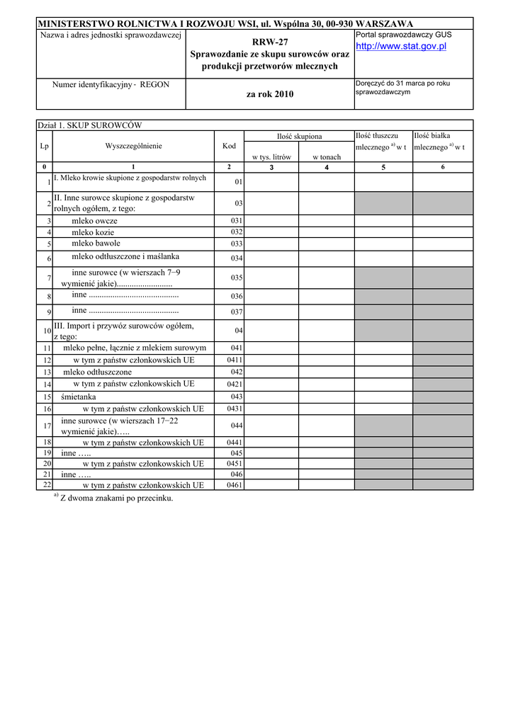 MINISTERSTWO ROLNICTWA I ROZWOJU WSI, ul. Wspólna 30, 00-930 WARSZAWA Nazwa i adres jednostki sprawozdawczej Portal sprawozdawczy GUS RRW-27 http://www.stat.gov.pl Sprawozdanie ze skupu surowców oraz produkcji przetworów mlecznych Doręczyć do 31 marca po roku sprawozdawczym Numer identyfikacyjny – REGON za rok 2010 Dział 1. SKUP SUROWCÓW Ilość tłuszczu mlecznego a) w t Ilość skupiona Lp Wyszczególnienie Kod 0 1 2 1 I. Mleko krowie skupione z gospodarstw rolnych II. Inne surowce skupione z gospodarstw rolnych ogółem, z tego: mleko owcze 3 4 mleko kozie mleko bawole 5 2 6 mleko odtłuszczone i maślanka 8 inne surowce (w wierszach 7−9 wymienić jakie).......................... inne .......................................... 9 inne .......................................... 7 10 11 12 13 14 15 16 17 18 19 20 21 22 III. Import i przywóz surowców ogółem, z tego: mleko pełne, łącznie z mlekiem surowym w tym z państw członkowskich UE mleko odtłuszczone w tym z państw członkowskich UE śmietanka w tym z państw członkowskich UE inne surowce (w wierszach 17−22 wymienić jakie)….. w tym z państw członkowskich UE inne ….. w tym z państw członkowskich UE inne ….. w tym z państw członkowskich UE a) Z dwoma znakami po przecinku. 01 03 031 032 033 034 035 036 037 04 041 0411 042 0421 043 0431 044 0441 045 0451 046 0461 w tys. litrów w tonach 3 4 5 Ilość białka mlecznego a) w t 6 Dział 2. PRODUKCJA PRZETWORÓW MLECZNYCH Lp Wyszczególnienie Kod 0 1 2 3 1 Mleko pitne ogółem, mleko surowe do spoŜycia mleko pełne (o zawartości tłuszczu co najmniej 3,5%), z tego: 2 4 5 6 7 8 9 10 pasteryzowane sterylizowane UHT (w tym uperyzowane) mleko półtłuste (o zawartości tłuszczu co najmniej 1,5% i nie większej niŜ 1,8%), z tego: pasteryzowane 11 111 112 1121 1122 1123 113 1131 sterylizowane 1132 UHT (w tym uperyzowane) 1133 11 mleko odtłuszczone (o zawartości tłuszczu nie większej niŜ 0,5%), z tego: 114 12 13 14 15 pasteryzowane sterylizowane UHT (w tym uperyzowane) mleko o zawartości tłuszczu 3,2% ogółem, z tego: 1141 1142 1143 115 16 17 18 19 pasteryzowane sterylizowane UHT (w tym uperyzowane) mleko o zawartości tłuszczu 2,0% ogółem, z tego: 1151 1152 1153 116 20 21 22 pasteryzowane sterylizowane UHT (w tym uperyzowane) mleko o innej zawartości tłuszczu (podać jakiej)……….%, z tego: 1161 1162 1163 23 24 25 26 pasteryzowane sterylizowane UHT (w tym uperyzowane) mleko o innej zawartości tłuszczu (podać jakiej)……….%, z tego: 27 28 pasteryzowane sterylizowane 29 30 UHT (w tym uperyzowane) 31 Maślanka 32 Śmietana i śmietanka ogółem, z tego: o zawartości tłuszczu nieprzekraczającej 29,00% 33 o zawartości tłuszczu ponad 29,00% 34 35 Mleko fermentowane ogółem, z tego: z dodatkami 36 bez dodatków 37 Napoje na bazie mleka 38 Inne przetwory na bazie mleka, np. 39 desery (podać jakie)……….. 40 Mleko zagęszczone ogółem, z tego: niesłodzone 41 słodzone 42 Przetwory mleczne w proszku ogółem, 43 z tego: 44 mleko w proszku kremowe (śmietanka w proszku) 117 1171 1172 1173 118 1181 1182 1183 12 13 131 132 14 141 142 15 16 21 211 212 22 221 ZuŜycie surowca w tonach Ilość tłuszczu Ilość białka a) a) mlecznego w mlecznego w Ilość (w tonach) mleka tonach tonach mleka pełnego odtłuszczonegob) 3 4 5 6 7 45 46 47 48 49 50 51 52 53 54 mleko w proszku pełne mleko w proszku częściowo odtłuszczone mleko w proszku odtłuszczone maślanka w proszku inne przetwory mleczne w proszku Masło i inne przetwory z tłuszczu mlecznego ogółem 222 masło ogółem, z tego: masło tradycyjne masło rekombinowane masło serwatkowe masło częściowo odwodnione i odwodnione oraz olej maślany 231 2311 2312 2313 55 56 57 58 59 232 inne przetwory tłuszczowe ogółem, z tego: masło o obniŜonej zawartości tłuszczu pozostałe przetwory tłuszczowe Sery ogółem (w.59=w.60=w.65) Sery ogółem według pochodzenia mleka, 60 z tego: sery z mleka krowiego 61 sery z mleka owczego 62 sery z mleka koziego 63 inne sery (z mieszanego mleka i/lub sery wyłącznie z mleka bawolego) 64 Sery ogółem z mleka wszelkiego 65 pochodzenia, z tego: 66 67 68 69 70 71 72 73 74 75 76 77 78 79 80 223 224 225 226 23 sery miękkie sery półmiękkie sery półtwarde sery twarde sery bardzo twarde twarogi i twaroŜki Sery przetworzone (sery topione, smaŜone itp.) Kazeina i kazeiniany Serwatka ogółem serwatka płynna serwatka zagęszczona serwatka w proszku lub w formie laktoza (cukier mleczny) laktoalbumina Inne przetwory mleczne (wymienić jakie) …………….. Mleko odtłuszczone i maślanka 81 zwrócone gospodarstwom Eksport i wewnątrzwspólnotowe wysyłki mleka i śmietanki 82 w tym do państw członkowskich UE 83 233 2331 2332 24 241 2411 2412 2413 2414 242 2421 2422 2423 2424 2425 2426 25 26 27 271 272 273 274 275 28 3 4 41 Inne zastosowania (określić jakie) 84 ……………………… a) Z dwoma znakami po przecinku. b) 5 MoŜe być wartość dodatnia lub ujemna ………........….....…………………. (imię i nazwisko, telefon, faks, e-mail osoby, która sporządziła sprawozdanie) …………………………… (miejscowość, data) ………......…………………… (pieczątka imienna i podpis osoby działającej w imieniu sprawozdawcy) Objaśnienia do sprawozdania rocznego RRW-27 Obowiązek sporządzania sprawozdania RRW-27 mają: 1. Przedsiębiorstwa i gospodarstwa rolne, które skupują pełne mleko lub produkty mleczarskie bezpośrednio od gospodarstw rolnych lub od przedsiębiorstw określonych w pkt 2 z zamiarem przetworzenia tego mleka lub produktów mleczarskich na inne produkty mleczarskie. 2. Przedsiębiorstwa, które skupują mleko w celu przekazania w całości lub części bez jakiegokolwiek przetwórstwa przedsiębiorstwom określonym w pkt 1. • • • • • • • Przez przedsiębiorstwo naleŜy rozumieć zakład prowadzący działalność w zakresie skupu i/lub przetwórstwa mleka wraz z oddz