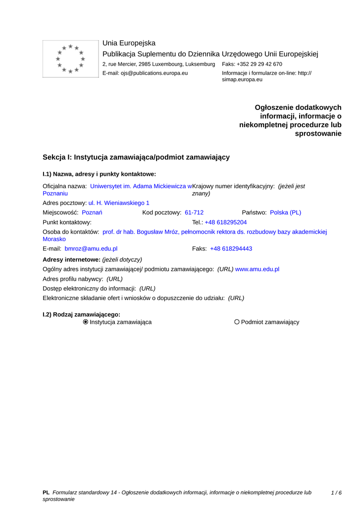 Unia Europejska Publikacja Suplementu do Dziennika Urzędowego Unii Europejskiej 2, rue Mercier, 2985 Luxembourg, Luksemburg Faks: +352 29 29 42 670 E-mail: [email protected] Informacje i formularze on-line: http:// simap.europa.eu Ogłoszenie dodatkowych informacji, informacje o niekompletnej procedurze lub sprostowanie Sekcja I: Instytucja zamawiająca/podmiot zamawiający I.1) Nazwa, adresy i punkty kontaktowe: Oficjalna nazwa: Uniwersytet im. Adama Mickiewicza w Krajowy numer identyfikacyjny: (jeżeli jest Poznaniu znany) _____ Adres pocztowy: ul. H. Wieniawskiego 1 Miejscowość: Poznań Kod pocztowy: 61-712 Punkt kontaktowy: _____ Państwo: Polska (PL) Tel.: +48 618295204 Osoba do kontaktów: prof. dr hab. Bogusław Mróz, pełnomocnik rektora ds. rozbudowy bazy akademickiej Morasko E-mail: [email protected] Faks: +48 618294443 Adresy internetowe: (jeżeli dotyczy) Ogólny adres instytucji zamawiającej/ podmiotu zamawiającego: (URL) www.amu.edu.pl Adres profilu nabywcy: (URL) _____ Dostęp elektroniczny do informacji: (URL) _____ Elektroniczne składanie ofert i wniosków o dopuszczenie do udziału: (URL) _____ I.2) Rodzaj zamawiającego: Instytucja zamawiająca Podmiot zamawiający PL Formularz standardowy 14 - Ogłoszenie dodatkowych informacji, informacje o niekompletnej procedurze lub sprostowanie 1/6 Sekcja II: Przedmiot zamówienia II.1.1) Nazwa nadana zamówieniu: Wybór partnera prywatnego dla przedsięwzięcia pod nazwą: „Zaprojektowanie, budowa i zarządzanie oraz utrzymanie Kompleksu Domów Studenckich na terenie Kampusu Morasko” II.1.2) Krótki opis zamówienia lub zakupu: (podano w pierwotnym ogłoszeniu) Przedmiotem zamówienia jest wspólna realizacja przedsięwzięcia budowy Kompleksu Domów Studenckich na terenie Kampusu Morasko w formule partnerstwa publiczno-prywatnego. Przedmiotem projektu jest zaprojektowanie, wybudowanie, a następnie utrzymanie i eksploatacja domów studenckich wraz z przedszkolem, stołówką, obsługą komunikacyjną i infrastrukturą towarzyszącą. Celem przedsięwzięcia jest wybudowanie i udostępnienie 800 miejsc mieszkalnych dla studentów na terenie nowobudowanego kampusu Morasko. Przewiduje się, iż w ramach wydziałów zlokalizowanych na terenie kampusu docelowo będzie studiować ok. 10 tys. studentów. Zamawiający planuje również zastąpić ok. 600 miejsc w domach, dotychczas funkcjonujących w centrum miasta, nowymi, planowanymi do wybudowania na terenie kampusu. W ramach infrastruktury towarzyszącej znajdą się m.in. przedszkole dla dzieci pracowników naukowych, punkt pierwszej pomocy medycznej, stołówka oraz minisupermarket. Po zakończeniu Umowy o PPP partner prywatny będzie zobowiązany do zwrotu nieruchomości, na której zlokalizowany będzie Kompleks Domów Studenckich Morasko wraz z tymi obiektami. Czas trwania Umowy o partnerstwie publiczno-prywatnym nie może przekroczyć terminów przewidzianych w przepisach Ustawy o partnerstwie publiczno-prywatnym. Opis przedsięwzięcia, a w szczególności opis potrzeb i wymagań Zamawiającego, zawarte są w dokumencie pn. Opis potrzeb i wymagań Zamawiającego. Opis potrzeb i wymagań określony w sposób umożliwiający przygotowanie się Wykonawców do dialogu, można uzyskać kierując wniosek do Zamawiającego na adres: Uniwersytet Adama Mickiewicza w Poznaniu ul. Wieniawskiego 1, 61-712 Poznań Dział Zamówień Publicznych tel. +48 61 829 4440 e-mail: [email protected] Umowa, która zostanie zawarta pomiędzy Zamawiającym a Wykonawcą w wyniku niniejszego Postępowania, będzie umową o partnerstwie publiczno - prywatnym, do której zastosowanie mają przepisy Ustawy o partnerstwie publiczno - prywatnym, ustawy Prawo zamówień publicznych, oraz, w kwestiach nieuregulowanych w tej ustawie, przepisy Kodeksu cywilnego (Dz. U. z 1964 r., Nr 16, poz. 93 z późn. zm.). II.1.3) Wspólny Słownik Zamówień (CPV) Główny przedmiot Dodatkowe przedmioty Słownik główny 45000000 70300000 71000000 Słownik uzupełniający (jeżeli dotyczy) PL Formularz standardowy 14 - Ogłoszenie dodatkowych informacji, informacje o niekompletnej procedurze lub sprostowanie 2/6 Sekcja IV: Procedura IV.1)Rodzaj procedury (podano w pierwotnym ogłoszeniu) Otwarta Ograniczona Ograniczona przyspieszona Negocjacyjna Negocjacyjna przyspieszona Dialog konkurencyjny Negocjacyjna z uprzednim ogłoszeniem Negocjacyjna bez uprzedniego ogłoszenia Negocjacyjna z publikacją ogłoszenia o zamówieniu Negocjacyjna bez publikacji ogłoszenia o zamówieniu Udzielenie zamówienia bez uprzedniej publikacji ogłoszenia o zamówieniu w Dzienniku Urzędowym Unii Europejskiej IV.2)Informacje administracyjne IV.2.1)Numer referencyjny: (podano w pierwotnym ogłoszeniu) ZP/91/B/13 IV.2.2)Dane referencyjne ogłoszenia w przypadku ogłoszeń przesłanych drogą elektroniczną: Pierwotne ogłoszenie przesłane przez eNotices TED eSender Login: ENOTICES_lsd6 Dane referencyjne ogłoszenia: 2013-132575 rok i numer dokumentu IV.2.3)Ogłoszenie, którego dotyczy niniejsza publikacja: Numer ogłoszenia w Dz.U.: 2013/S 194-333547 z dnia: 05/10/2013 (dd/mm/rrrr) IV.2.4)Data wysłania pierwotnego ogłoszenia: 01/10/2013 (dd/mm/rrrr) PL Formularz standardowy 14 - Ogłoszenie dodatkowych informacji, informacje o niekompletnej procedurze lub sprostowanie 3/6 Sekcja VI: Informacje uzupełniające VI.1) Ogłoszenie dotyczy: Procedury niepełnej Sprostowania Informacji dodatkowych VI.2) Informacje na temat niepełnej procedury udzielenia zamówienia: Postępowanie o udzielenie zamówienia zostało przerwane Postępowanie o udzielenie zamówienia uznano za nieskuteczne Zamówienia nie udzielono Zamówienie może być przedmiotem ponownej publikacji VI.3) Informacje do poprawienia lub dodania : VI.3.1) Zmiana oryginalnej informacji podanej przez instytucję zamawiającą Publikacja w witrynie TED niezgodna z oryginalną informacją, przekazaną przez instytucję zamawiającą Oba przypadki VI.3.2) W ogłoszeniu pierwotnym