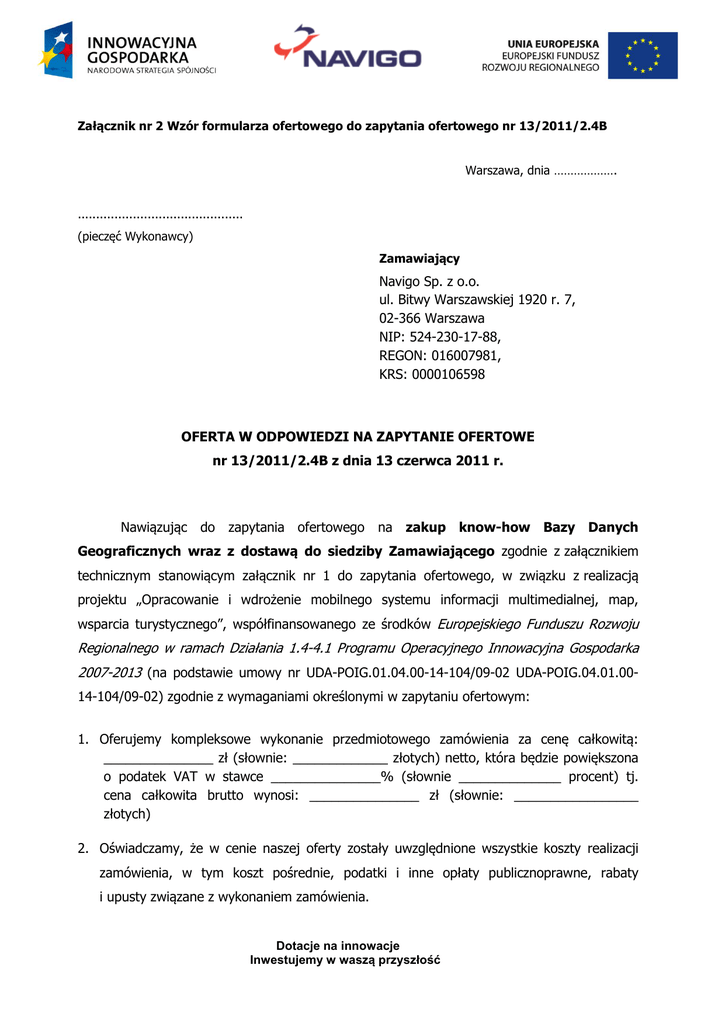 Załącznik nr 2 Wzór formularza ofertowego do zapytania ofertowego nr 13/2011/2.4B Warszawa, dnia ………………. ............................................. (pieczęć Wykonawcy) Zamawiający Navigo Sp. z o.o. ul. Bitwy Warszawskiej 1920 r. 7, 02-366 Warszawa NIP: 524-230-17-88, REGON: 016007981, KRS: 0000106598 OFERTA W ODPOWIEDZI NA ZAPYTANIE OFERTOWE nr 13/2011/2.4B z dnia 13 czerwca 2011 r. Nawiązując do zapytania ofertowego na zakup know-how Bazy Danych Geograficznych wraz z dostawą do siedziby Zamawiającego zgodnie z załącznikiem technicznym stanowiącym załącznik nr 1 do zapytania ofertowego, w związku z realizacją projektu „Opracowanie i wdrożenie mobilnego systemu informacji multimedialnej, map, wsparcia turystycznego”, współfinansowanego ze środków Europejskiego Funduszu Rozwoju Regionalnego w ramach Działania 1.4-4.1 Programu Operacyjnego Innowacyjna Gospodarka 2007-2013 (na podstawie umowy nr UDA-POIG.01.04.00-14-104/09-02 UDA-POIG.04.01.0014-104/09-02) zgodnie z wymaganiami określonymi w zapytaniu ofertowym: 1. Oferujemy kompleksowe wykonanie przedmiotowego zamówienia za cenę całkowitą: _______________ zł (słownie: _____________ złotych) netto, która będzie powiększona o podatek VAT w stawce _______________% (słownie ______________ procent) tj. cena całkowita brutto wynosi: _______________ zł (słownie: _________________ złotych) 2. Oświadczamy, że w cenie naszej oferty zostały uwzględnione wszystkie koszty realizacji zamówienia, w tym koszt pośrednie, podatki i inne opłaty publicznoprawne, rabaty i upusty związane z wykonaniem zamówienia. Dotacje na innowacje Inwestujemy w waszą przyszłość 3. Oświadczamy, że oferowane know-how Bazy Danych Geograficznych spełnia wszystkie wymogi określone w załączniku technicznym do zapytania ofertowego. 4. Oświadczamy, że zapoznaliśmy się z treścią zapytania ofertowego oraz wszystkimi jego załącznikami stanowiącymi jego integralną część i nie wnosimy do niego żadnych zastrzeżeń oraz przyjmujemy warunki w nim zawarte. 5. Oświadczamy, że zdobyliśmy wszystkie informacje niezbędne do przygotowania oferty. 6. Oświadczamy, że uważamy się za związanych niniejszą ofertą na czas 60 dni. 7. W przypadku przyznania nam zamówienia, zobowiązujemy się do zawarcia umowy w miejscu i terminie wskazanym przez Zamawiającego. 8. Oświadczamy, że posiadamy numer NIP: ______________________ 9. Oświadczamy, że posiadamy numer REGON: ___________________ 10. Korespondencję należy kierować na adres: ___________________________ na numer faksu ___________________, na adres e-mali: ____________________ w godzinach urzędowania tj. ________________________ 11. Załącznikami do niniejszej oferty są następujące dokumenty: (1) Kopia potwierdzona za zgodność z oryginałem aktualnego KRS bądź innego wypisu z rejestru; .................................................... (miejscowość i data) …………………………………………………………………. (podpis i pieczęć przedstawiciela /przedstawicieli Wykonawcy) Dotacje na innowacje Inwestujemy w waszą przyszłość