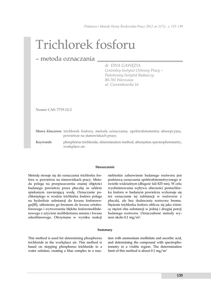 Podstawy i Metody Oceny Środowiska Pracy 2012, nr 1(71) , s. 135–139 Trichlorek fosforu – metoda oznaczania dr EWA GAWĘDA Centralny Instytut Ochrony Pracy – Państwowy Instytut Badawczy 00-701 Warszawa ul. Czerniakowska 16 Numer CAS: 7719-12-2 Słowa kluczowe: trichlorek fosforu, metoda oznaczania, spektrofotometria absorpcyjna, powietrze na stanowiskach pracy. Keywords: phosphorus trichloride, determination method, absorption spectrophotometry, workplace air. Streszczenie Metodę stosuje się do oznaczania trichlorku fosforu w powietrzu na stanowiskach pracy. Metoda polega na przepuszczeniu znanej objętości badanego powietrza przez płuczkę ze szkłem spiekanym zawierającą wodę. Oznaczanie pochłoniętego w wodzie trichlorku fosforu polega na hydrolizie substancji do kwasu fosforowego(III), utlenieniu go bromem do kwasu ortofosforowego i wytworzeniu błękitu fosforomolibdenowego z użyciem molibdenianu amonu i kwasu askorbinowego. Otrzymane w wyniku reakcji niebieskie zabarwienie badanego roztworu jest podstawą oznaczania spektrofotometrycznego w świetle widzialnym (długość fali 825 nm). W celu wyeliminowania wpływu obecności pentachlorku fosforu w badanym powietrzu wykonuje się też oznaczanie tej substancji w roztworze z płuczki, ale bez dodawania roztworu bromu. Stężenie trichlorku fosforu oblicza się jako różnicę stężeń obu substancji w jednej i drugiej porcji badanego roztworu. Oznaczalność metody wynosi około 0,1 mg/m3. Summary This method is used for determining phosphorus trichloride in the workplace air. This method is based on stopping phosphorus trichloride in a water solution, creating a blue complex in a reac- tion with ammonium molibdate and ascorbic acid, and determining the compound with spectrophotometry in a visible region. The determination limit of this method is about 0.1 mg/m 3 135 Ewa Gawęda UWAGI WSTĘPNE Trichlorek fosforu (PCl3) jest dymiącą, bezbarwną cieczą o ostrym, drażniącym zapachu, bardzo toksyczną i żrącą. Masa cząsteczkowa substancji wynosi 137,33 g/mol, temperatura substancji – 76,1 oC, a jej gęstość – 1,574 g/ml. W wodzie trichlorek fosforu ulega hydrolizie do kwasu fosforowego. Reakcja z wodą przebiega gwałtownie, uwalniają się wtedy żrące, toksyczne gazy, np. chlorowodór. Wchłania się do organizmu głównie w układzie oddechowym. Działa bardzo toksycznie przez drogi oddechowe, stwarzając poważne zagrożenie zdrowia w następstwie długotrwałego narażenia. Powoduje poważne oparzenia. Światowa produkcja trichlorku fosforu prze- kracza 1,3 miliona ton/rok. Substancja jest stosowana w syntezie chemicznej do otrzymywania organicznych pochodnych fosforu (np. estrów i amidów) na 3. stopniu utlenienia. Trichlorek fosforu jest prekursorem w produkcji takich związków, jak: pentachlorek fosforu, tlenochlorek fosforu czy chlorek tiofosforylu. Obowiązująca w Polsce wartość najwyższego dopuszczalnego stężenia (NDS) trichlorku fosforu wynosi 1 mg/m3, a wartość najwyższego dopuszczalnego stężenia chwilowego (NDSCh) – 2 mg/m3. Przedstawiona metoda stanowi nowelizację metody oznaczania trichlorku fosforu podanej w normie PN-91/Z-04073.03. PROCEDURA ANALITYCZNA 1. Zakres stosowania Metodę podaną w procedurze stosuje się do oznaczania trichlorku fosforu w powietrzu na stanowiskach pracy z zastosowaniem spektrofotometrii absorpcyjnej w widzialnym zakresie światła, podczas przeprowadzania kontroli warunków sanitarnohigienicznych. Najmniejsze stężenie substancji, jakie można oznaczyć w warunkach pobierania próbek powietrza i wykonania oznaczania opisanych w niniejszej procedurze, wynosi około 0,1 mg/m3. 2. Normy powołane PN-69/C-13048 „Szklany sprzęt laboratoryjny. Płuczki bełkotkowe ze szkłem spiekanym”. PN-Z-04008-07 „Ochrona czystości powietrza. Pobieranie próbek. Zasady pobierania próbek powietrza w środowisku pracy i interpretacji wyników”. 3. Zasada metody Oznaczanie polega na pochłonięciu trichlorku fosforu obecnego w badanym powietrzu w wodzie, gdzie następuje hydroliza do kwasu fosforowego(III), utlenieniu go bromem do kwasu 136 ortofosforowego i wytworzeniu błękitu fosforomolibdenowego przez działanie molibdenianem amonu i kwasem askorbinowym. Otrzymane w wyniku reakcji niebieskie zabarwienie roztworu jest podstawą oznaczania spektrofotometrycznego przy długości fali 825 nm. 4. Wytyczne ogólne 4.1. Czystość odczynników Podczas analizy, o ile nie zaznaczono inaczej, należy stosować odczynniki o stopniu czystości co najmniej cz.d.a. Do przygotowywania wszystkich roztworów należy stosować wodę destylowaną, zwaną wodą w dalszej części procedury. 4.2. Dokładność ważenia Substancje stosowane w analizie należy odważać z dokładnością do 0,0002 g. 4.3. Postępowanie z substancjami chemicznymi Wszystkie czynności z substancjami chemicznymi należy wykonywać w odzieży ochronnej i pod sprawie działającym wyciągiem laboratoryjnym. Pozostałe po analizie roztwory odczynników i wzorców należy gromadzić w przeznaczonych do tego celu pojemnikach i przeka- Trichlorek fosforu – metoda oznaczania zywać do unieszkodliwienia uprawnionym instytucjom. 5. Odczynniki, roztwory i materiały 5.1. Brom Stosować roztwór nasycony bromu (woda bromowa). Zawartość bromu w przechowywanym roztworze należy sprawdzać w następujący sposób: do 5 ml roztworu bromu dodawać kroplami roztwór kwasu askorbinowego wg punktu 5.2. aż do odbarwienia próbki. Jeśli zużyta objętość roztworu kwasu askorbinowego jest mniejsza niż 0,5 ml, należy przygotować świeżą wodę bromową. 5.2. Kwas askorbinowy Stosować roztwór kwasu askorbinowego o stężeniu 0,02 g/ml. 5.3. Molibdenian amonu Stosować roztwór molibdenianu amonu [(NH4)6Mo7O24 . 4H2O) przygotowany w następujący sposób: rozpuścić 1 g substancji w 10 ml wody i dodać 50 ml roztworu kwasu siarkowego, w proporcjach objętościowych 1: 4. 5.4. Roztwór wzorcowy podst
