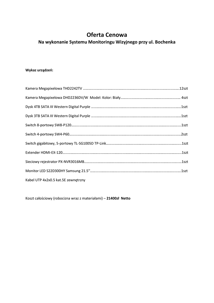 Oferta Cenowa Na wykonanie Systemu Monitoringu Wizyjnego przy ul. Bochenka Wykaz urządzeń: Kamera Megapixelowa THD2242TV …………………………………………………………………………………………….12szt Kamera Megapixelowa DHD2236DV/W Model: Kolor: Biały………………………………………………………… 4szt Dysk 4TB SATA III Western Digital Purple ………………………………………………………………………………………1szt Dysk 3TB SATA III Western Digital Purple ………………………………………………………………………………………1szt Switch 8-portowy SW8-P120………………………………………………………………………………………………………….1szt Switch 4-portowy SW4-P60……………………………………………………………………………………………………………2szt Switch gigabitowy, 5-portowy TL-SG1005D TP-Link………………………………………………………………………..1szt Extender HDMI-EX-120…………………………………………………………………………………………………………………..1szt Sieciowy rejestrator PX-NVR3016MB…………………………………………………………………………………………..…1szt Monitor LED S22D300HY Samsung 21.5''……………………………………………………………………………………….1szt Kabel UTP 4x2x0.5 kat.5E zewnętrzny Koszt całościowy (robocizna wraz z materiałami) – 21400zł Netto