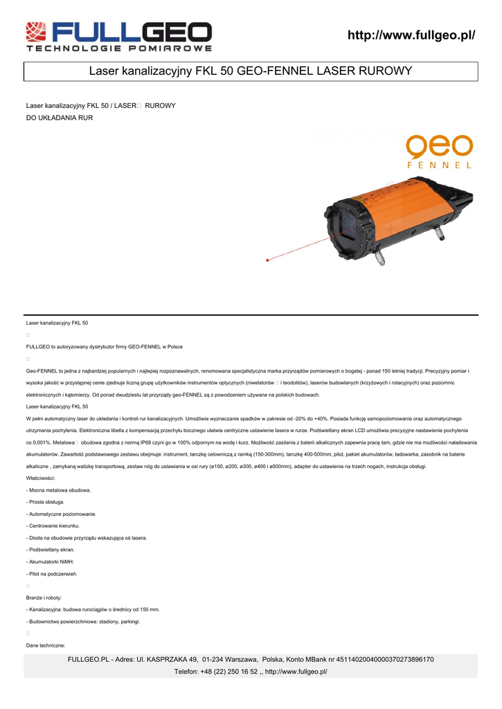 http://www.fullgeo.pl/ Laser kanalizacyjny FKL 50 GEO-FENNEL LASER RUROWY Laser kanalizacyjny FKL 50 / LASER RUROWY DO UKŁADANIA RUR Laser kanalizacyjny FKL 50 FULLGEO to autoryzowany dystrybutor firmy GEO-FENNEL w Polsce Geo-FENNEL to jedna z najbardziej popularnych i najlepiej rozpoznawalnych, renomowana specjalistyczna marka przyrządów pomiarowych o bogatej - ponad 150 letniej tradycji. Precyzyjny pomiar i wysoka jakość w przystępnej cenie zjednuje liczną grupę użytkowników instrumentów optycznych (niwelatorów i teodolitów), laserów budowlanych (krzyżowych i rotacyjnych) oraz poziomnic elektronicznych i kątomierzy. Od ponad dwudziestu lat przyrządy geo-FENNEL są z powodzeniem używane na polskich budowach. Laser kanalizacyjny FKL 50 W pełni automatyczny laser do układania i kontroli rur kanalizacyjnych. Umożliwia wyznaczanie spadków w zakresie od -20% do +40%. Posiada funkcję samopoziomowania oraz automatycznego utrzymania pochylenia. Elektroniczna libella z kompensacją przechyłu bocznego ułatwia centryczne ustawienie lasera w rurze. Podświetlany ekran LCD umożliwia precyzyjne nastawienie pochylenia co 0,001%. Metalowa obudowa zgodna z normą IP68 czyni go w 100% odpornym na wodę i kurz. Możliwość zasilania z baterii alkalicznych zapewnia pracę tam, gdzie nie ma możliwości naładowania akumulatorów. Zawartość podstawowego zestawu obejmuje: instrument, tarczkę celowniczą z ramką (150-300mm), tarczkę 400-500mm, pilot, pakiet akumulatorów, ładowarka, zasobnik na baterie alkaliczne , zamykaną walizkę transportową, zestaw nóg do ustawiania w osi rury (ø150, ø200, ø300, ø400 i ø500mm), adapter do ustawienia na trzech nogach, instrukcja obsługi. Właściwości: - Mocna metalowa obudowa. - Prosta obsługa. - Automatyczne poziomowanie. - Centrowanie kierunku. - Dioda na obudowie przyrządu wskazująca oś lasera. - Podświetlany ekran. - Akumulatorki NiMH. - Pilot na podczerwień. Branże i roboty: - Kanalizacyjna: budowa rurociągów o średnicy od 150 mm. - Budownictwo powierzchniowe: stadiony, parkingi. Dane techniczne: FULLGEO.PL - Adres: Ul. KASPRZAKA 49, 01-234 Warszawa, Polska, Konto MBank nr 45114020040000370273896170 Telefon: +48 (22) 250 16 52 ,, http://www.fullgeo.pl/ Klasa lasera: 3R http://www.fullgeo.pl/ Moc lasera/kolor światła: FULLGEO.PL - Adres: Ul. KASPRZAKA 49, 01-234 Warszawa, Polska, Konto MBank nr 45114020040000370273896170 Telefon: +48 (22) 250 16 52 ,, http://www.fullgeo.pl/ http://www.fullgeo.pl/ FULLGEO.PL - Adres: Ul. KASPRZAKA 49, 01-234 Warszawa, Polska, Konto MBank nr 45114020040000370273896170 Telefon: +48 (22) 250 16 52 ,, http://www.fullgeo.pl/