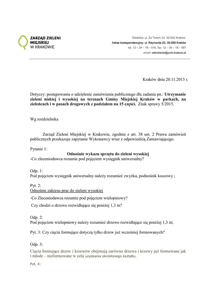 Siedziba: ul. Za Torem 22, 30-542 Kraków Adres korespondencyjny: ul. Reymonta 20, 3030-059 Kraków tel. 12 – 34 – 18 – 516, fax. 12 – 34 – 18 – 487 email: [email protected] Kraków dnia 20.11.2015 r. Dotyczy: postępowania o udzielenie zamówienia publicznego dla zadania pn.: Utrzymanie zieleni niskiej i wysokiej na terenach Gminy Miejskiej Kraków w parkach, na zieleńcach i w pasach drogowych z podziałem na 15 części. Znak sprawy 5/2015. Wg rozdzielnika Zarząd Zieleni Miejskiej w Krakowie, zgodnie z art. 38 ust. 2 Prawa zamówień publicznych przekazuje zapytanie Wykonawcy wraz z odpowiedzią Zamawiającego. Pytanie 1: Odnośnie wykazu sprzętu do zieleni wysokiej -Co zleceniodawca rozumie pod pojęciem wysięgnik uniwersalny? Odp. 1: Pod pojęciem wysięgnik uniwersalny naleŜy rozumieć zwyŜka, podnośnik koszowy ; Pyt. 2: Odnośnie zakresu prac do zieleni wysokiej -Co Zleceniodawca rozumie pod pojęciem wielopniowy? Czy chodzi o drzewo rozwidlające się poniŜej 1,3 m? Odp. 2: Pod pojęciem wielopniowy naleŜy rozumieć drzewo rozwidlające się poniŜej 1,3 m; Pyt. 3: Czy cięcia formujące dotyczą tylko drzew juŜ wcześniej formowanych? Odp. 3: Cięcia formujące drzew i krzewów obejmują zarówno drzewa i krzewy juŜ formowane jak i młode – nieformowane w celu uzyskania określonego kształtu. Pyt. 4: Czy w cięciach formujących obmierzana będzie powierzchnia korony przed cięciem, czy po cięciu? Odp. 4: W cięciach formujących podawana będzie powierzchnia korony (drzewa, krzewu) przed cięciem. Pyt. 5: W Standaryzacji (zał. nr 7) jest zapis „Wykonawca zobowiązany jest do wykonania zadania zgodnie z obowiązującymi przepisami i normami, w szczególności zgodnie ze sztuką ogrodniczą, z naleŜytą starannością, z uwzględnieniem profesjonalnego charakteru świadczonych usług (...)” Obecnie w pielęgnacji drzew nie zaleca się zabiegów ingerujących w ubytki na drzewach. Czy w związku z tym Zleceniodawca usunie z załącznika nr 8 (rodzaje prac) zapisy dotyczące czyszczenia ubytków itp.? Odp. 5: Zabezpieczenie ubytków - brak przepisów zabraniających wykonywanie tego typu zabiegu, prowadzone analizy ( chirurgów drzew ) nie podwaŜają celowości zabezpieczania ubytków, wskazują jedynie na ich modyfikacje w zakresie stosowania impregnatów , usuwania rodzaju /stopnia / fazy rozkładu drewna, stosowania środków chemicznych. Wobec powyŜszego jest to zgodne z zapisem w standaryzacji (zał. Nr 7). W związku z tym zleceniodawca nie usunie pozycji „Zabezpieczenia ubytków” (zał. Nr 8 rodzaje prac). Pyt. 6: Co Zleceniodawca rozumie pod pojęciem wiązanie typu Cobra ? Odp. 6: Wiązanie Cobra – typ wiązania linowego elastycznego opasowego dla wzmocnienia mechanicznego tych części korony drzewa które naraŜone są na wyłamanie. Pyt. 7: Kto ma określić i w jakim zakresie „potrzebę miesięcznej pielęgnacji” młodych drzewek i krzewów ? Odp. 7: Miesięczna pielęgnacja drzew i krzewów zostanie zlecona przez Zleceniodawcę i obejmować będzie wszystkie wyszczególnione w zapisie „Miesięczna pielęgnacja młodych drzew i krzewów” czynności. Pyt. 8: Odnośnie wzoru umowy zieleń wysoka - §2 pkt 8 ppkt 1 „Wykonawca zadba, aby personel nie wykonywał prac w warunkach niebezpiecznych (...)” Proszę o wyjaśnienie (pomijam fakt, Ŝe prace przy zieleni wysokiej zawsze są w warunkach niebezpiecznych), czy wykonawca moŜe odmówić przyjęcia zlecenia jeŜeli prace będą musiały być wykonywane przy liniach tramwajowych w nocy, poniewaŜ MPK nie zgadza się na wyłączenie prądu w dzień. Te prace mimo wyłączenia prądu są ekstremalnie niebezpieczne i niezgodne z przepisami BHP. Czy moŜna liczyć na zmianę zapisu w umowie, Ŝe Zleceniodawca w takich skrajnych i jednostkowych przypadkach sam załatwi wyłączenie prądu w godzinach dziennych. Odp. 8: §2 pkt 8 ppkt 1 Zarządcą infrastruktury tramwajowej na terenie Gminy Miejskiej Kraków pozostaje Zarząd Infrastruktury Komunalnej i Transportu w Krakowie, nie zaś Miejskie Przedsiębiorstwo Komunikacyjne S.A. w Krakowie, które jako przewoźnik realizuje usługi w ramach Komunikacji Miejskiej w Krakowie. Wykonawca nie moŜe odmówić zlecenia jeŜeli prace będą musiały być wykonywane przy liniach tramwajowych w nocy, niemniej w sytuacji braku wyłączenia prądu istnieje moŜliwość wnioskowania do Zamawiającego o przesunięcie terminu wykonania prac. Tego rodzaju wnioski będą rozpatrywane przez Zamawiającego indywidualnie, w zaleŜności od okoliczności konkretnej sprawy. Pyt. 9: §2 pkt 10 dotyczy równieŜ zał. nr 7 Standaryzacja pkt 4 „ Wykonawca zobowiązuje się do wykonywania wszystkich obowiązków wytwórcy i posiadacza odpadów (...)” Zgodnie z interpretacją Wydziału Gospodarki Komunalnej Urzędu Miasta Krakowa (Pan Marek Bronicki Główny Specjalista w Referacie Gospodarki Odpadami Komunalnymi i Czystości) firmy zajmujące się tylko zielenią wysoką nie są ani wytwórcami ani posiadaczami odpadów. Jedynie co, to sprzątamy po sobie pozostałości pozrębowe (zgodnie z obowiązującą nomenklaturą Lasów Państwowych). W załączniku „Rodzaje prac zieleni wysokiej” nie ma nic o wywoŜeniu śmieci oraz odpadów materiałowych, dlatego teŜ w umowie nie powinien być umieszczony zapis dotyczący tego rodzaju prac. Oczywiście zapis, Ŝe mamy po sobie posprzątać i uwzględnić wszelkie z tym związane koszty jest jak najbardziej zasadny. §2 pkt 12 „Wykonawca zobowiązany jest na bieŜąco do usuwania odpadów komunalnych, w tym masy zielonej (...)” Jak w pkt. 10 Wykonawcy tylko zieleni wysokiej nie mają w swoim zakresie prac usuwania odpadów komunalnych i masy zielonej (nie kosimy trawników), jedynie sprzątamy po sobie to co zetniemy (materiały pozrębowe). Natomiast, co do terminu nie mam Ŝadnych zastrzeŜeń. Odp. 9: §2 pkt 10 oraz 12 w ramach polskiego systemu źródeł prawa nie znajduje się legalna wykł