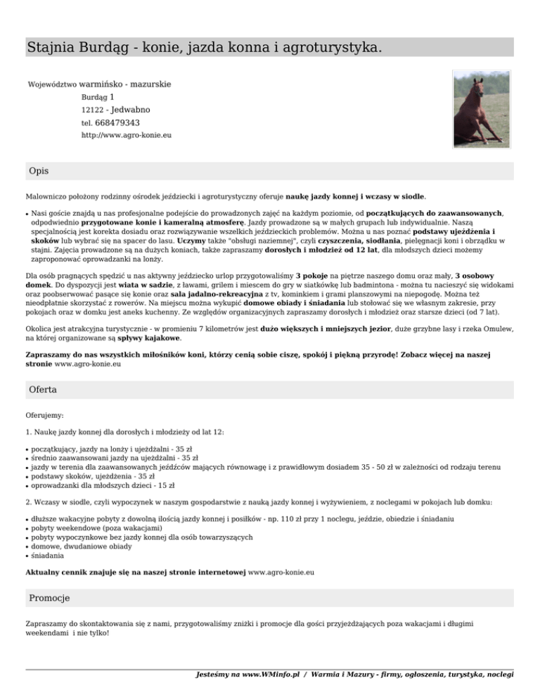 Stajnia Burdąg - konie, jazda konna i agroturystyka. Województwo warmińsko - mazurskie Burdąg 1 12122 - Jedwabno tel. 668479343 http://www.agro-konie.eu Opis Malowniczo położony rodzinny ośrodek jeździecki i agroturystyczny oferuje naukę jazdy konnej i wczasy w siodle. ● Nasi goście znajdą u nas profesjonalne podejście do prowadzonych zajęć na każdym poziomie, od początkujących do zaawansowanych, odpodwiednio przygotowane konie i kameralną atmosferę. Jazdy prowadzone są w małych grupach lub indywidualnie. Naszą specjalnością jest korekta dosiadu oraz rozwiązywanie wszelkich jeździeckich problemów. Można u nas poznać podstawy ujeżdżenia i skoków lub wybrać się na spacer do lasu. Uczymy także "obsługi naziemnej", czyli czyszczenia, siodłania, pielęgnacji koni i obrządku w stajni. Zajęcia prowadzone są na dużych koniach, także zapraszamy dorosłych i młodzież od 12 lat, dla młodszych dzieci możemy zaproponować oprowadzanki na lonży. Dla osób pragnących spędzić u nas aktywny jeździecko urlop przygotowaliśmy 3 pokoje na piętrze naszego domu oraz mały, 3 osobowy domek. Do dyspozycji jest wiata w sadzie, z ławami, grilem i miescem do gry w siatkówkę lub badmintona - można tu nacieszyć się widokami oraz poobserwować pasące się konie oraz sala jadalno-rekreacyjna z tv, kominkiem i grami planszowymi na niepogodę. Można też nieodpłatnie skorzystać z rowerów. Na miejscu można wykupić domowe obiady i śniadania lub stołować się we własnym zakresie, przy pokojach oraz w domku jest aneks kuchenny. Ze względów organizacyjnych zapraszamy dorosłych i młodzież oraz starsze dzieci (od 7 lat). Okolica jest atrakcyjna turystycznie - w promieniu 7 kilometrów jest dużo większych i mniejszych jezior, duże grzybne lasy i rzeka Omulew, na której organizowane są spływy kajakowe. Zapraszamy do nas wszystkich miłośników koni, którzy cenią sobie ciszę, spokój i piękną przyrodę! Zobacz więcej na naszej stronie www.agro-konie.eu Oferta Oferujemy: 1. Naukę jazdy konnej dla dorosłych i młodzieży od lat 12: ● ● ● ● ● początkujący, jazdy na lonży i ujeżdżalni - 35 zł średnio zaawansowani jazdy na ujeżdżalni - 35 zł jazdy w terenia dla zaawansowanych jeźdźców mających równowagę i z prawidłowym dosiadem 35 - 50 zł w zależności od rodzaju terenu podstawy skoków, ujeżdżenia - 35 zł oprowadzanki dla młodszych dzieci - 15 zł 2. Wczasy w siodle, czyli wypoczynek w naszym gospodarstwie z nauką jazdy konnej i wyżywieniem, z noclegami w pokojach lub domku: ● ● ● ● ● dłuższe wakacyjne pobyty z dowolną ilością jazdy konnej i posiłków - np. 110 zł przy 1 noclegu, jeździe, obiedzie i śniadaniu pobyty weekendowe (poza wakacjami) pobyty wypoczynkowe bez jazdy konnej dla osób towarzyszących domowe, dwudaniowe obiady śniadania Aktualny cennik znajuje się na naszej stronie internetowej www.agro-konie.eu Promocje Zapraszamy do skontaktowania się z nami, przygotowaliśmy zniżki i promocje dla gości przyjeżdżających poza wakacjami i długimi weekendami i nie tylko! Jesteśmy na www.WMinfo.pl / Warmia i Mazury - firmy, ogłoszenia, turystyka, noclegi Jesteśmy na www.WMinfo.pl / Warmia i Mazury - firmy, ogłoszenia, turystyka, noclegi