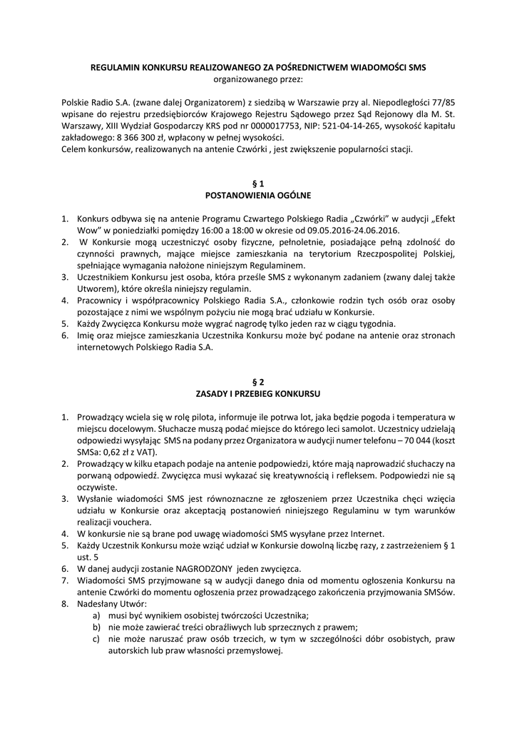 REGULAMIN KONKURSU REALIZOWANEGO ZA POŚREDNICTWEM WIADOMOŚCI SMS organizowanego przez: Polskie Radio S.A. (zwane dalej Organizatorem) z siedzibą w Warszawie przy al. Niepodległości 77/85 wpisane do rejestru przedsiębiorców Krajowego Rejestru Sądowego przez Sąd Rejonowy dla M. St. Warszawy, XIII Wydział Gospodarczy KRS pod nr 0000017753, NIP: 521-04-14-265, wysokość kapitału zakładowego: 8 366 300 zł, wpłacony w pełnej wysokości. Celem konkursów, realizowanych na antenie Czwórki , jest zwiększenie popularności stacji. §1 POSTANOWIENIA OGÓLNE 1. Konkurs odbywa się na antenie Programu Czwartego Polskiego Radia „Czwórki” w audycji „Efekt Wow” w poniedziałki pomiędzy 16:00 a 18:00 w okresie od 09.05.2016-24.06.2016. 2. W Konkursie mogą uczestniczyć osoby fizyczne, pełnoletnie, posiadające pełną zdolność do czynności prawnych, mające miejsce zamieszkania na terytorium Rzeczpospolitej Polskiej, spełniające wymagania nałożone niniejszym Regulaminem. 3. Uczestnikiem Konkursu jest osoba, która prześle SMS z wykonanym zadaniem (zwany dalej także Utworem), które określa niniejszy regulamin. 4. Pracownicy i współpracownicy Polskiego Radia S.A., członkowie rodzin tych osób oraz osoby pozostające z nimi we wspólnym pożyciu nie mogą brać udziału w Konkursie. 5. Każdy Zwycięzca Konkursu może wygrać nagrodę tylko jeden raz w ciągu tygodnia. 6. Imię oraz miejsce zamieszkania Uczestnika Konkursu może być podane na antenie oraz stronach internetowych Polskiego Radia S.A. §2 ZASADY I PRZEBIEG KONKURSU 1. Prowadzący wciela się w rolę pilota, informuje ile potrwa lot, jaka będzie pogoda i temperatura w miejscu docelowym. Słuchacze muszą podać miejsce do którego leci samolot. Uczestnicy udzielają odpowiedzi wysyłając SMS na podany przez Organizatora w audycji numer telefonu – 70 044 (koszt SMSa: 0,62 zł z VAT). 2. Prowadzący w kilku etapach podaje na antenie podpowiedzi, które mają naprowadzić słuchaczy na porwaną odpowiedź. Zwycięzca musi wykazać się kreatywnością i refleksem. Podpowiedzi nie są oczywiste. 3. Wysłanie wiadomości SMS jest równoznaczne ze zgłoszeniem przez Uczestnika chęci wzięcia udziału w Konkursie oraz akceptacją postanowień niniejszego Regulaminu w tym warunków realizacji vouchera. 4. W konkursie nie są brane pod uwagę wiadomości SMS wysyłane przez Internet. 5. Każdy Uczestnik Konkursu może wziąć udział w Konkursie dowolną liczbę razy, z zastrzeżeniem § 1 ust. 5 6. W danej audycji zostanie NAGRODZONY jeden zwycięzca. 7. Wiadomości SMS przyjmowane są w audycji danego dnia od momentu ogłoszenia Konkursu na antenie Czwórki do momentu ogłoszenia przez prowadzącego zakończenia przyjmowania SMSów. 8. Nadesłany Utwór: a) musi być wynikiem osobistej twórczości Uczestnika; b) nie może zawierać treści obraźliwych lub sprzecznych z prawem; c) nie może naruszać praw osób trzecich, w tym w szczególności dóbr osobistych, praw autorskich lub praw własności przemysłowej. 9. Zwycięzcami Konkursu w danej audycji jest osoba/osoby, których tekst (wykonanie zadania) został najwyżej oceniony przez Jury Konkursu, powołane przez Organizatora. Dokonując oceny Jury weźmie pod uwagę oryginalność, pomysłowość, wartość artystyczną tekstu. §3 NAGRODY 1. Nagrodą w konkursie jest 7 voucherów do wykorzystania na symulatorze samolotu pasażerskiego GearUP! znajdującym się w Poznaniu, ul. Kwiatowa 2. Jeden voucher dla danego zwycięzcy. 2. Jeden voucher upoważnia laureata do 30-minutowego lotu. 3. Vouchery zachowują ważność do 30.11.2016 r. 4. Cena jednostkowa vouchera wynosi 349,- złotych brutto 5. Nagrody nie podlegają wymianie na ekwiwalent pieniężny lub rzeczowy. 6. Zwycięzcy udostępnią Organizatorowi swoje dokładne dane, które posłużą do przekazania nagrody w terminie 30 dni od momentu wygrania. 7. Nagrody nie są objęte podatkiem od wygranej. §4 DANE OSOBOWE 1. Administratorem danych osobowych przetwarzanych w związku z realizacją Konkursu jest Organizator. 2. Dane osobowe przekazane Organizatorowi przez Uczestników Konkursu będą przetwarzane przez Organizatora wyłącznie w celu realizacji Konkursu i doręczenia nagród. Podanie danych osobowych jest dobrowolne, jednak ich niepodanie uniemożliwia otrzymanie nagrody w Konkursie. Każdy Uczestnik Konkursu posiada prawo wglądu do swoich danych osobowych, do ich poprawiania oraz żądania ich usunięcia. Dane osobowe będą przetwarzane zgodnie z przepisami ustawy z dnia 29 sierpnia 1997 r. o ochronie danych osobowych (Dz. U. 2014.1182 j.t.z późn. zm.) na co każdy Uczestnik Konkursu wyraża zgodę. §5 PRAWA AUTORSKIE 1. Uczestnik Konkursu oświadcza, że Utwór zgłoszony do Konkursu został stworzony samodzielnie przez Uczestnika i jest wolny od praw i roszczeń osób trzecich, w tym dotyczących praw autorskich i pokrewnych oraz że ponosi wobec Organizatora odpowiedzialność z tego tytułu, zwalniając go z wszelkich roszczeń osób trzecich. 2. Z chwilą wysłania Utworu do Konkursu Uczestnik udziela bez wynagrodzenia nieograniczonej czasowo i terytorialnie niewyłącznej licencji do korzystania z Utworu (licencja w zakresie autorskich praw majątkowych i praw pokrewnych) na następujących polach eksploatacji: a) utrwalanie i zwielokrotnianie (w tym wprowadzenie do pamięci komputera) Utworu dowolną techniką, b) publiczne udostępnienie Utworu w taki sposób, aby każdy mógł mieć do niego dostęp w miejscu i czasie przez siebie wybranym, c) publiczne wystawianie Utworu, d) nadawanie i remitowanie w całości lub w dowolnie wybranych fragmentach za pomocą fonii przewodowej lub bezprzewodowej ,przez stacje naziemne za pośrednictwem satelity, w sieciach kablowych , telekomunikacyjnych lub innych systemach przekazu 3. Uczestnik upoważnia Organizatora do udostępnienia Utworu anonimowo oraz do decydowania o jego pierwszym udostępnieniu. §6 REKLAMACJE 1. Wszelkie r