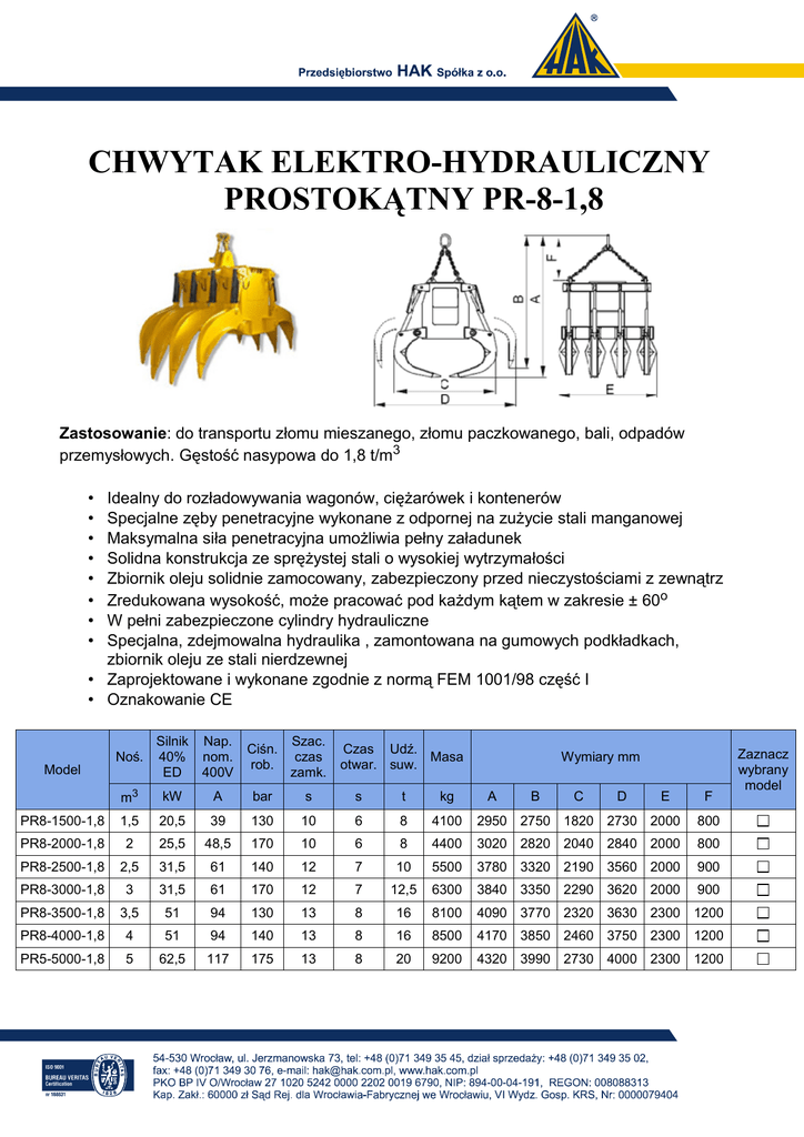 CHWYTAK ELEKTRO-HYDRAULICZNY PROSTOKĄTNY PR-8-1,8 Zastosowanie: do transportu złomu mieszanego, złomu paczkowanego, bali, odpadów przemysłowych. Gęstość nasypowa do 1,8 t/m3 Idealny do rozładowywania wagonów, ciężarówek i kontenerów Specjalne zęby penetracyjne wykonane z odpornej na zużycie stali manganowej Maksymalna siła penetracyjna umożliwia pełny załadunek Solidna konstrukcja ze sprężystej stali o wysokiej wytrzymałości Zbiornik oleju solidnie zamocowany, zabezpieczony przed nieczystościami z zewnątrz Zredukowana wysokość, może pracować pod każdym kątem w zakresie ± 60o W pełni zabezpieczone cylindry hydrauliczne Specjalna, zdejmowalna hydraulika , zamontowana na gumowych podkładkach, zbiornik oleju ze stali nierdzewnej • Zaprojektowane i wykonane zgodnie z normą FEM 1001/98 część I • Oznakowanie CE • • • • • • • • Noś. Silnik 40% ED m3 kW A bar s s t kg PR8-1500-1,8 1,5 20,5 39 130 10 6 8 4100 2950 2750 1820 2730 2000 800 PR8-2000-1,8 2 25,5 48,5 170 10 6 8 4400 3020 2820 2040 2840 2000 800 PR8-2500-1,8 2,5 31,5 61 140 12 7 10 5500 3780 3320 2190 3560 2000 900 PR8-3000-1,8 3 31,5 61 170 12 7 12,5 6300 3840 3350 2290 3620 2000 900 PR8-3500-1,8 3,5 51 94 130 13 8 16 8100 4090 3770 2320 3630 2300 1200 PR8-4000-1,8 4 51 94 140 13 8 16 8500 4170 3850 2460 3750 2300 1200 PR5-5000-1,8 5 62,5 117 175 13 8 20 9200 4320 3990 2730 4000 2300 1200 Model Nap. Szac. Ciśn. nom. czas rob. 400V zamk. Czas Udź. Masa otwar. suw. Wymiary mm A B C D E F Zaznacz wybrany model