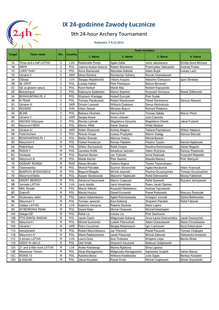 IX 24-godzinne Zawody Łucznicze 9th 24-hour Archery Tournament Radzymin, 7-8.12.2013 Team members Target Team name Div. Country 1: Name 2: Name 3: Name 4: Name 1A 1B 1C 1D Three and a half LATVIA ARPA LUKS "Orlik" Ukraine II C C C C LVA POL POL UKR Redzinalds Pucko Joanna Austyn-Gawryś Anna Stanieczek Maria Szkolna Agate Zalite Robert Staniewicz Stanisław Kalisiak Konstantyn Szkolny Janis Jakubanecs Przemysław Gabryelski Adam Bujok Roman Howiadowski Emilija Anna Bitmane Andrzej Presko Łukasz Lach 2A 2B 2C 2D Odisejs SŁ GRYF Idź za głosem natury Bowstring.pl C C C C LVA POL POL POL Sergejs Meļeškevičš Łukasz Halicki Karol Narbutt Katarzyna Szałańska Viktors Avsjuks Piotr Pietraszun Marek Maj Marcin Szemiot Maksims Čerkasovs Marcin Borowski Norbert Kopczyński Krzysztof Gorczyca Igors Skrebels 3A 3B 3C 3D BOWHUNTING.PL II N-TEAM Ukraine III RCHERZ C C C C POL POL UKR SVK Wojciech Wardęga Tomasz Paczkowski Dmytro Lwowski Viktor Zeman Hubert Durczak Robert Klawikowski Wiktoria Dyakowa Miroslav Bojcun Piotr Sudak Paweł Sienkiewicz Denys Mychalczuk Richard Polakovic 4A 4B 4C 4D BLINK Ukraine V MGOKiS Dobczyce Marymont MDW C C C C POL UKR POL POL Barbara Okońska Sergiej Kowal Renata Leśniak Marcin Affek Hanna Król Anton Lilewski Magdalena Zarzycka Darek Gawryś Tomasz Sałata Jurij Czarnolis Magdalena Olesek Witek Madziar Marcin Ploch 5A 5B 5C 5D Ukraine IV Field Archers BOWHUNTING.PL I Marymont II C C C R UKR POL POL POL Artem Waszczuk Roman Krupa Stefan Świstak Hubert Kowalczys Andrey Magera Łukasz Przybylski Mariusz Araźny Roman Pękalski Tatiana Pozniakowa Marcin Szeląg Michał Byrecki Paulina Tyszko Wiktor Halaziuk Dariusz Barczyk 6A 6B 6C 6D RobinHood ROKIS 7 Drukarze Marymont III R R R R POL POL POL POL Wiktor Żarnowiecki Jarosław Królik Szymon Bocian Marek Kencki Rafał Chojna Arkadiusz Jeznach Jan Trybulec Piotr Sawicki Karolina Komorowska Adam Wytrykus Anna Świeczak Klaudia Kleszcz Adrian Bogacki Dariusz Pawłowski Krzysztof Niepiekło Piotr Starzycki 7A 7B 7C 7D DOSAAF RUSSIA Ożarowianka BoMiPaTo BYDGOSZCZ Marymont/Stella R R R R RUS POL POL POL Alexey Borodin Michał Patrzałek Bogumił Biegała Kacper Sierakowski Tatiana Segina Szymon Skowroński Michał Jaworski Sławomir Napłoszek Tsyren Tsyrenzhapov Agata Mordzonek Paulina Gruszczyńska Rafał Dobrowolski Adam Krawczyk Tomasz Gruszczyński Maciej Fałdziński 8A 8B 8C 8D ENGRY BERDSY Jurmala LATVIA MKŁ Strzała ZrakurD R R R R POL LVA POL POL Adrianna Kaczmarek Janis Apsitis Marcin Miłecki Maciej Huszcz Marcin Czapczyk Janis Amatnieks Krzysztof Markiewicz Gaweł Kucowski Rafał Szanecki Pearu Jacob Ojamea Andrzej Topczewski Paweł Rutkowski Ryszard Janiszewski 9A 9B 9C 9D Drukowany Jeleń Marymont V Golden LATVIA WYBOROWA TEAM R R R R POL POL LVA POL Jakub Gabarkiewicz Tomasz Jaworski Katarina Vencjuna Dawid Klata Agata Rościszewska Ewa Sobieraj Roberts Daukste Michał Chojnacki Grzegorz Jurczak Wojciech Pękalski Maris Lapins Michał Kołodziejski Sylwia Bańkowska Rafał Fabisiak 10A 10B 10C 10D Załoga DŻI PTG SOKÓŁ RADOM Marymont I Ukraine I R R R R POL POL POL UKR Rafał Lis Jacek Czech Michał Suchoński Petro Czuczman Łukasz Lis Małgorzata Sobieraj Ludwik Pietrusiński Sergiej Makarewych Piotr Stachwiuk Anna Łęcka-Dobrowolska Adam Dukaczewski Igor Liachowen 11A 11B 11C 11D Aerodynamit Marymont IV 4 arrows LATVIA DZIDY W AKCJI R R R R POL POL LVA POL Robert Marcinkiewicz Marta Radziszewska Laura Done Olaf Witak Jan Pstrzoch Jacek Piaszczyk Ieva Truksane Wojciech Kaczorek Paweł Paczuski Michał Zalewski Krisjanis Liepa Mateusz Gołębiowski 12A 12B 12C 12D 21 and a little more LATVIA Mazowsze Teresin ROKIS 13 Δ-SQUAD R R R R LVA POL POL POL Anete Kreicberga Alicja Maciągowska Karolina Borys Jakub Kowalski Marina Rjabkova Małgorzata Maciągowska Wiktoria Kisielewska Paweł Onisk Elina Lapsina Agnieszka Grądzik Julia Gajda Michał Czajkowski Marek Ziółkowski Dariusz Rzeszot Jakub Fularski Kamila Napłoszek Maurycy Świeczak Jacek Kwaczyński Maria Chrostowska Kyryl Kolesnykow Tomasz Chałupka Aleksandra Kwiecień Benita Strele Adrian Barzyc Bartosz Kowalski Marek Szymański