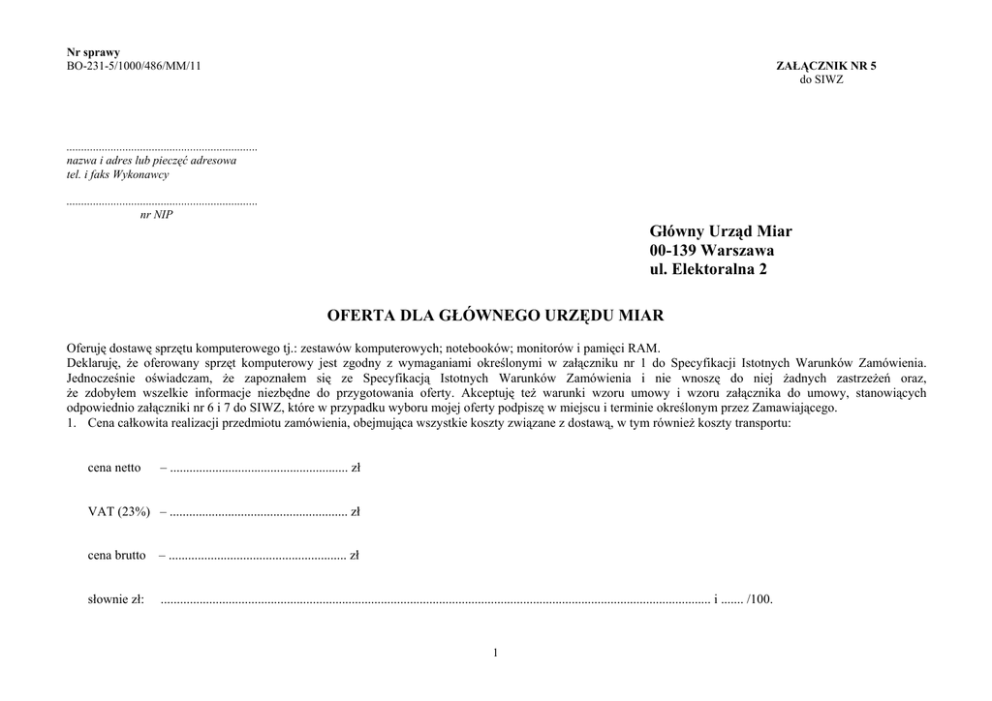 Nr sprawy BO-231-5/1000/486/MM/11 ZAŁĄCZNIK NR 5 do SIWZ ................................................................. nazwa i adres lub pieczęć adresowa tel. i faks Wykonawcy ................................................................. nr NIP Główny Urząd Miar 00-139 Warszawa ul. Elektoralna 2 OFERTA DLA GŁÓWNEGO URZĘDU MIAR Oferuję dostawę sprzętu komputerowego tj.: zestawów komputerowych; notebooków; monitorów i pamięci RAM. Deklaruję, że oferowany sprzęt komputerowy jest zgodny z wymaganiami określonymi w załączniku nr 1 do Specyfikacji Istotnych Warunków Zamówienia. Jednocześnie oświadczam, że zapoznałem się ze Specyfikacją Istotnych Warunków Zamówienia i nie wnoszę do niej żadnych zastrzeżeń oraz, że zdobyłem wszelkie informacje niezbędne do przygotowania oferty. Akceptuję też warunki wzoru umowy i wzoru załącznika do umowy, stanowiących odpowiednio załączniki nr 6 i 7 do SIWZ, które w przypadku wyboru mojej oferty podpiszę w miejscu i terminie określonym przez Zamawiającego. 1. Cena całkowita realizacji przedmiotu zamówienia, obejmująca wszystkie koszty związane z dostawą, w tym również koszty transportu: cena netto – ....................................................... zł VAT (23%) – ....................................................... zł cena brutto – ....................................................... zł słownie zł: .......................................................................................................................................................................... i ....... /100. 1 2. Cena całkowita określona w ust. 1 obejmuje ceny części zamówienia wymienione w poniższej tabeli: Poz. 1 Nazwa części zamówienia podana przez Zamawiającego ust. 3 załącznika nr 1 do SIWZ 2 Cena jednostkowa netto (zł) Cena jednostkowa brutto (zł) Ilość (szt.) Wartość netto (zł) (3 x 5) Wartość brutto (zł) (4 x 5) 3 4 5 6 7 1 Zestaw komputerowy 5 2 Notebook typ 1 7 3 Notebook typ 2 1 4 Monitor 11 5 Pamięć RAM typ 1 100 6 Pamięć RAM typ 2 2 Razem 3. Parametry techniczne oferowanego sprzętu komputerowego: 3.1. Zestaw komputerowy L.p. Opis Minimalne wymagania Producent/Model Jednostka centralna +1 Procesor nie gorszy niż klasy x86, dwurdzeniowy, czterowątkowy (3.1 GHz, 3 MB cache, LGA1155), max. TDP 65W Płyta główna wyposażona co najmniej w 1 złącze PCI Express x16 niski profil, 2 wolne złącza PCI niski profil, 4 złącza DIMM, obsługa do 4 GB DDR3 pamięci RAM, 3 złącza SATA, 1 złącze eSATA RAM nie gorsza niż 4 GB DDR3 1333 MHz, po zainstalowaniu muszą pozostać 2 złącza wolne 2 Parametry Dysk twardy nie gorszy niż 320 GB SATAII 7200rpm Karta graficzna z pamięcią własną nie mniej niż 256 MB, 1 wyjście DVI, 1 wyjście D-sub Karta sieciowa zintegrowana z płytą główną 10/100/1000 Ethernet RJ 45 Karta dźwiękowa zintegrowana z płytą główną, zgodna z High Definition Napęd optyczny 16X DVD+/-RW DL Porty wbudowane: 1 x LPT; 1 x RS232C, 1 x DVI, 1 x D-sub, 1 x eSATA, min. 8 x USB, min. 2 z przodu obudowy, port sieciowy RJ-45, adapter PS2, wymagane ilości i rozmieszczenie (na zewnątrz obudowy komputera) portów USB nie mogą być osiągnięte w wyniku stosowania konwerterów, przejściówek itp. Obudowa 2 Dokumentacja techniczna 3 Nośniki z niezbędnym oprogramowaniem, sterownikami typu Miditower, kolor czarny, max. hałas do 37 dB, mierzony wg normy ISO 9296, zasilacz 550W ATX standard 12V 2,3 z wentylatorem, przewód zasilający wymagana do wszystkich podzespołów, dokumentacja w języku polskim, zawierająca informacje techniczne pozwalające na prawidłową rozbudowę i konfigurację wymagane do wszystkich podzespołów Klawiatura 4 Klawiatura USB w układzie polskim programisty (QWERTY), oznaczona logo firmowym producenta Mysz USB mysz laserowa z rolką (scroll) 1000dpi, oznaczona logo firmowym producenta Mysz 5 Oprogramowanie systemowe 6 Oprogramowanie systemowe w ramach licencji typu OEM, zainstalowane oraz dostarczone na zewnętrznym nośniku system operacyjny poprawnie współpracujący z Microsoft Office Professional 2007 i 2010 oraz systemem domenowym MS Windows Serwer, obsługujący technologię Microsoft Silverlight, wersja professional, komplet sterowników, wersja systemu pozwalająca na odtworzenie systemu na czystym nośniku (a nie recovery), oznaczone logo firmowym producenta 3 Monitor 7 współczynnik proporcji obrazu: panoramiczny (16:9); typ matrycy: TN — Twisted Nematic; TFT LCD rozdzielczość: 1920 x 1080 pikseli przy 60 Hz; kontrast: 1000 do 1; jasność: 250 cd/m2; czas odświeżania: max 5 ms; kąt widzenia: 160 (w pionie) / 170 (w poziomie); reprodukcja barw: 16,7 mln kolorów; rozstaw pikseli: 0,248 mm; złącza: D-sub, DVI wymagane napięcie: od 100 do 240 V, prąd zmienny / 50 lub 60 Hz + 3 Hz / 1,6 A (maksymalnie); pobór mocy: 20 W (standardowo) / 28 W(maksymalnie) waga (z opakowaniem): do 5,3 kg. ZGODNOŚĆ I STANDARDY: TCO 5.0,Energy Star, EPEAT Gold, zmniejszona zawartość halogenu; trwale oznaczony znakiem firmowym producenta monitora. dołączone: nośniki z niezbędnym oprogramowaniem, przewody zasilający i sygnałowy LCD – 21,5 cala 3.2. Notebook typ 1 L.p. 1 Opis Procesor i pamięć cache Pamięć RAM Wyświetlacz Pamięć HD Karta graficzna Minimalne wymagania Producent/Model nie gorszy niż klasy x86, dwurdzeniowy, czterowątkowy, (2,2 GHz, L2 cache 3 MB), max. TDP 35W nie gorsza niż 4 GB pamięci DDR3 SDRAM 1333 MHz, 2 x SODIMM 15,6" wyświetlacz o rozdzielczości HD (1366 x 768), przeciwodblaskowy nie mniej niż 320 GB Interfejs SATA II, 7200 obr./min nie mniej niż 128 MB pamięci własnej, wyjście D-SUB Karta dźwiękowa obsługa High Definition Audio; wbudowane głośniki stereo; wbudowany mikrofon cyfrowy; wyjście słuchawek stereo/wyjście sygnałowe audio; wejście mikrofonu stereo Napęd optyczny wbudowany DVD+/-RW DL Porty wejścia/wyjścia 4 porty USB 2.0 1 gniazdo zew. monit
