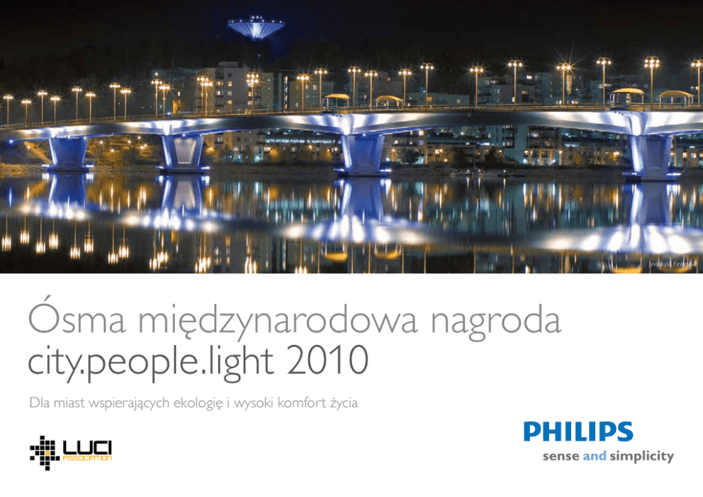 Jyväskylä, Finlandia Ósma międzynarodowa nagroda city.people.light 2010 Dla miast wspierających ekologię i wysoki komfort życia Ósma międzynarodowa nagroda city.people.light 2010 Dla ludzi na całym świecie światło oznacza życie Przez dwadzieścia ostatnich lat oświetlenie miejskie stało się czymś więcej niż sposobem na zapewnienie bezpieczeństwa i widoczności: obecnie uważa się je za zasadniczy składnik planu i tożsamości miasta, niezależnie od jego wielkości. Oświetlenie miejskie może dać miastu piękno w godzinach nocnych, dopasowane do Hangzhou, Chiny wizerunku miasta w ciągu dnia lub stanowiące dla niego konkurencję. Dzięki zmodyfikowaniu nocnego krajobrazu możliwa jest zmiana relacji między mieszkańcami a ich miastem, a ich otoczenie zostaje ulepszone. International) w celu wyróżniania miast, w których światła jako głównego narzędzia rozwoju miejskiego z podejmowane są działania na rzecz rehumanizacji uwzględnieniem ekologii i dbałości o środowisko. Oświetlenie oferuje nową wizję rzeczywistości: pod- przestrzeni miejskiej za pomocą oświetlenia. Promowane kreślając niektóre elementy a ukrywając inne, zachęca są też miasta dążące do zwiększenia energooszczędności, Stowarzyszenie LUCI powstało w 2002 roku z obywateli do odkrywania konturów i szczegółów ograniczenia stosowania materiałów niebezpiecznych inicjatywy miasta Lion (Francja) i obecnie skupia terenów i zabytków, które nie są widoczne w ciągu dnia. oraz zmniejszenia ilości odpadów. ponad 100 członków (w tym 65 miast w Europie, Azji, obu Amerykach i Afryce oraz 35 firm z branży Z pomocą planu oświetlenia możliwe jest tworzenie Już od pewnego czasu firma Philips zajmuje się oświetleniowej - producentów, projektantów, nowych wrażeń i nowych nastrojów, co zapewni nowy badaniami dotyczącymi tego, w jaki sposób oświetlenie konsultantów, instytucji edukacyjnych itp.). sposób postrzegania otoczenia, czy nawet sprawi, może ewoluować i poprawiać jakość życia w mieście. że ludzie zauważą je po raz pierwszy. Jest to również Celem tych badań jest poszerzanie granic twórczości Nagradzając i wyróżniając miasta promujące tę wizję subtelny, ale skuteczny sposób promowania zalet miasta i intelektu, poszukiwanie nowatorskich, właściwych oświetlenia miejskiego, nagroda city.people.light wśród turystów. rozwiązań oraz promowanie myśli ekologicznej. przyczynia się do lepszego wykorzystania oświetlenia Ten program badań to mariaż trzech podstawowych zarówno w miastach członkowskich inicjatywy LUCI, Ósma międzynarodowa nagroda city.people.light pojęć — miasta, ludzi i światła — w ramach jednej jak i w pozostałych. została utworzona w 2003 roku przez firmę Philips kompleksowej inicjatywy. LUCI to międzynarodowa i stowarzyszenie LUCI (Lighting Urban Community sieć miast zaangażowanych w wykorzystywanie Celem tej nagrody jest wyróżnienie miasta, w którym obszar/budynek/pomnik, wizerunek i tożsamość najlepiej połączono świadomość potrzeb wynikających miasta, miejscową gospodarkę, nastroje społeczne, z życia we współczesnym mieście oraz pojęcia „miasto”, „ludzie” i „światło” w spójną strategię oświetlenia. mieszkańców i turystów; • jakość całego zgłoszenia: profesjonalne fotografie, zwięzłe informacje itd. Akt wręczenia tej nagrody powinien zwrócić uwagę władz miasta i architektów miejskich na korzyści, jakie Skład jury niesie stosowanie ekologicznego oświetlenia (nowy Firma Philips i stowarzyszenie LUCI wyznaczyły wizerunek, większe bezpieczeństwo, lepsza orientacja, niezależne międzynarodowe jury składające się z 6 osób, podejście do architektury pod kątem estetyki). w tym: • 2 projektantów oświetlenia Rodzaj projektu • 2 osoby zarządzające oświetleniem miejskim Oświetlenie musi być stałe i dostępne bezpłatnie • 2 innych specjalistów z branży oświetleniowej dla mieszkańców miasta. Oświetlenie o charakterze (architekci, planiści, inżynierowie itp.) tymczasowym i świątecznym nie jest uwzględniane w konkursie. Nagroda Jury nagrodzi trzy miasta za zrealizowane w nich projekty. Do konkursu można zgłaszać projekty oświetlenia Pierwsza nagroda to trofeum i czek na 10 000 euro. miejskiego, które zostały zrealizowane nie wcześniej niż Miasta, które zajmą drugą i trzecią pozycję, otrzymają dwa lata temu. trofea. Laureaci otrzymają także zaproszenie do udziału w wybranej imprezie organizowanej przez stowarzyszenie Współzawodnictwo o ósmą międzynarodową nagrodę city.people.light 2010 Kryteria oceny LUCI w następnym roku. Ceremonia wręczenia nagród Podczas oceny projektów jury będzie się kierowało odbędzie się w Chartres, we Francji, podczas corocznego następującymi kryteriami: forum LUCI odbywającego się w dniach 15–19 września • kontekst projektu: np. czy jest to część większego 2010 roku. przedsięwzięcia, planu modernizacji miejskiej lub Zgłoszenia należy przekazywać do 30 czerwca 2010. schematu oświetlenia; Aby wszystkie projekty zostały ocenione sprawiedliwie i • integracja ze środowiskiem: czy uwzględniono następujące czynniki — zużycie energii, zanieczyszczenie miały równe szanse, dokumentacja projektów musi być w języku angielskim. światłem, wpływ na florę i faunę, recykling wyposażenia po zakończeniu jego eksploatacji; • rozpiętość czasowa projektu: czy projekt jest Publikacja wyników Wyniki konkursu zostaną opublikowane w inicjatywą jednorazową, czy też częścią średnio- lub specjalistycznych magazynach branży oświetleniowej, w długoterminowego przedsięwzięcia; witrynie internetowej firmy Philips: • kwestie finansowe: ile wydano na realizację projektu i jakie są dalsze koszty z nim związane; • zespół odpowiedzialny za projekt: czy określono i www.citypeoplelight.com/award i w witrynie internetowej stowarzys
