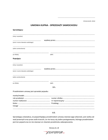 .......................................................................... (miejscowość, data) UMOWA KUPNA - SPRZEDAŻY SAMOCHODU Sprzedający: ................................................................................................................................................................... (imię i nazwisko) ........................................................ wydany przez…............................................................................ (seria i numer dowodu osobistego) ................................................................................................................................................................... (adres zamieszkania) …………………………………………………………………… ……………………………………………………………………………………. (nr PESEL) (NIP) Kupujący: ................................................................................................................................................................... (imię i nazwisko) ........................................................ wydany przez…............................................................................ (seria i numer dowodu osobistego) ................................................................................................................................................................... (adres zamieszkania) …………………………………………………………………… ……………………………………………………………………………………. (nr PESEL) (NIP) § 1. Przedmiotem umowy jest sprzedaż pojazdu: marka/model:……………………………………………………………………………………………………………………………………… rok produkcji: ………………………………………………. numer silnika:…………………………………………………………… numer nadwozia: …………………………………………. nr rejestracyjny : ………………………………………………………. Kolor: ……………………………………………………………. Przebieg: …………………………………………………………………. Uwagi: ………………………………………………………………………………………………………………………………………………. ……………………………………………………………………………………………………………………………………………………………. § 2. Sprzedający oświadcza, że pojazd będący przedmiotem umowy stanowi jego własność, jest wolny od wad prawnych oraz praw osób trzecich, że nie toczy się żadne postępowanie, którego przedmiotem jest ten pojazd oraz że nie stanowi on również przedmiotu zabezpieczenia. Strona 1 z 2 § 3. Strony ustaliły wartość przedmiotu umowy na kwotę: ……………………………………………………………….......... ................................................................................................................................................................... (słownie) § 4. Sprzedający przenosi na rzecz Kupującego własność pojazdu określonego w § 1. niniejszej umowy za kwotę określoną w § 3 niniejszej umowy, której otrzymanie Sprzedający kwituje. Kupujący kwituje jednocześnie odbiór w/w pojazdu. § 5. Sprzedający oświadcza, że pojazd nie ma wad technicznych, które są mu znane i o których nie powiadomił Kupującego, a Kupujący potwierdza znajomość stanu technicznego pojazdu. § 6. Strony ustaliły, że wszelkiego rodzaju koszty transakcji wynikające z realizacji ustaleń niniejszej umowy oraz koszty opłaty skarbowej obciążają ………………………………………………………………………………… § 7. W sprawach nie uregulowanych w niniejszej umowie zastosowanie mają obowiązujące w tym zakresie przepisy kodeksu cywilnego. § 8. Niniejszą umowę sporządzono w dwóch jednobrzmiących egzemplarzach, po jednym dla każdej ze stron. ……….......................................................... (Podpis Sprzedającego) ……………………………………………………………………. (Podpis Kupującego) Strona 2 z 2